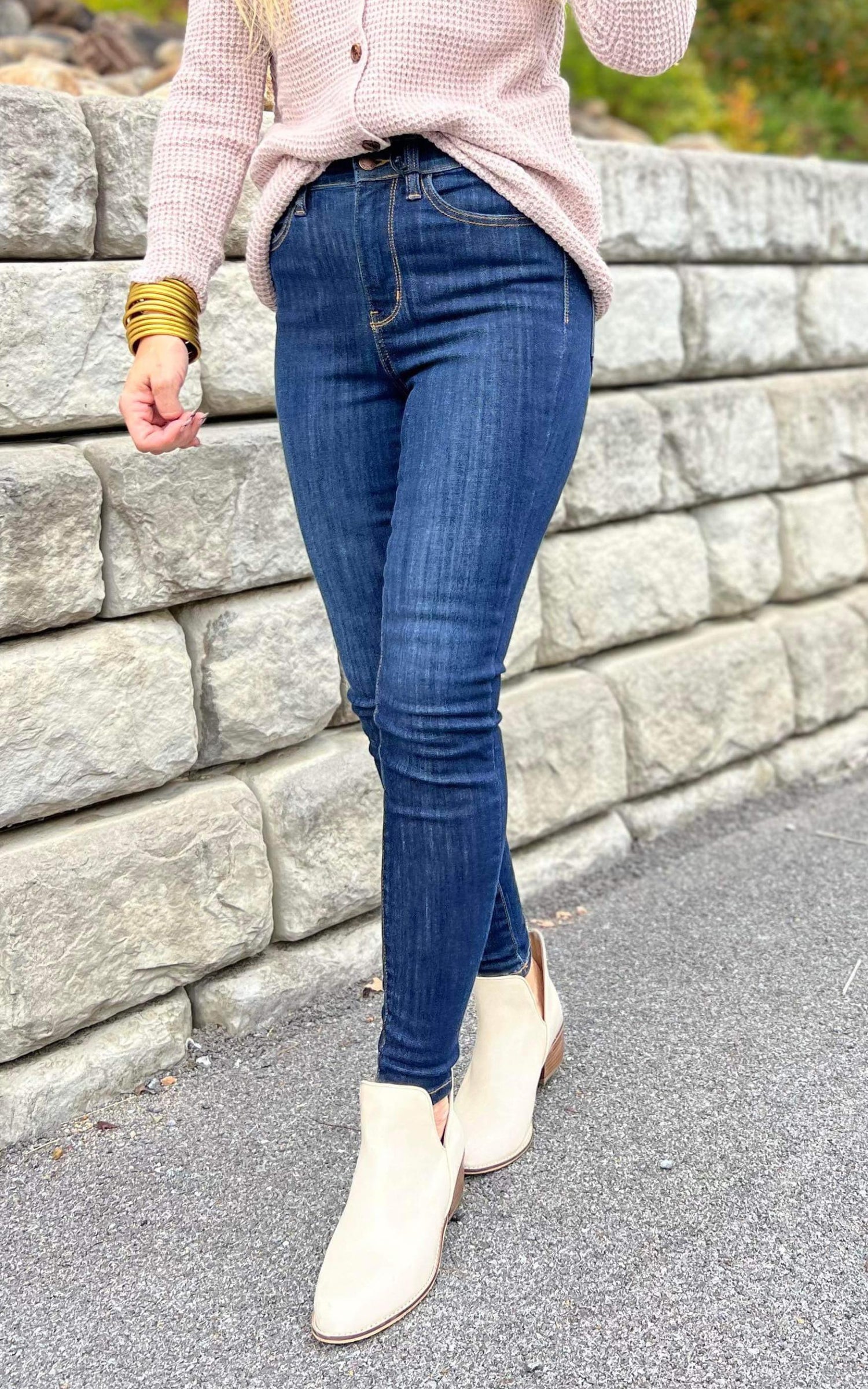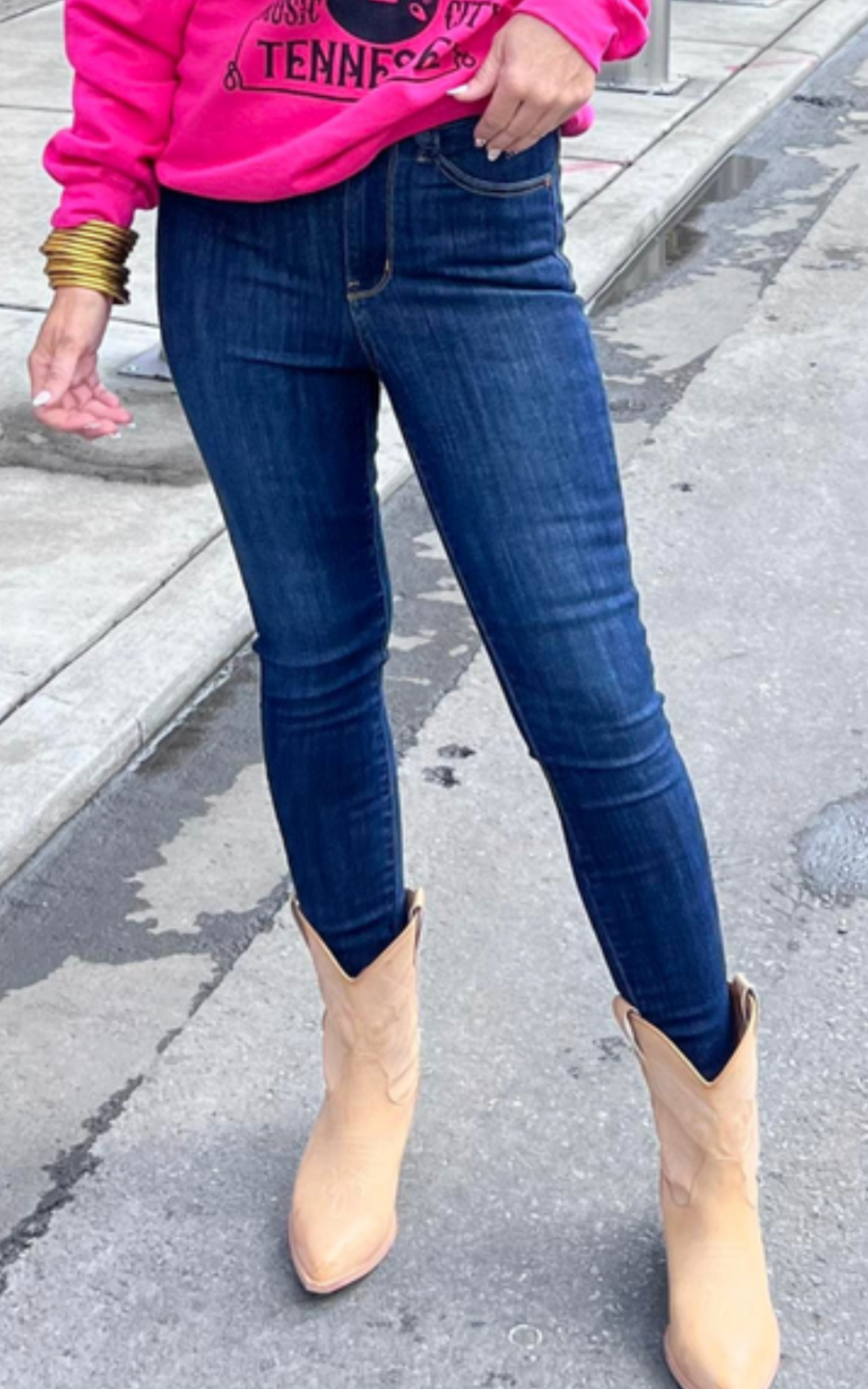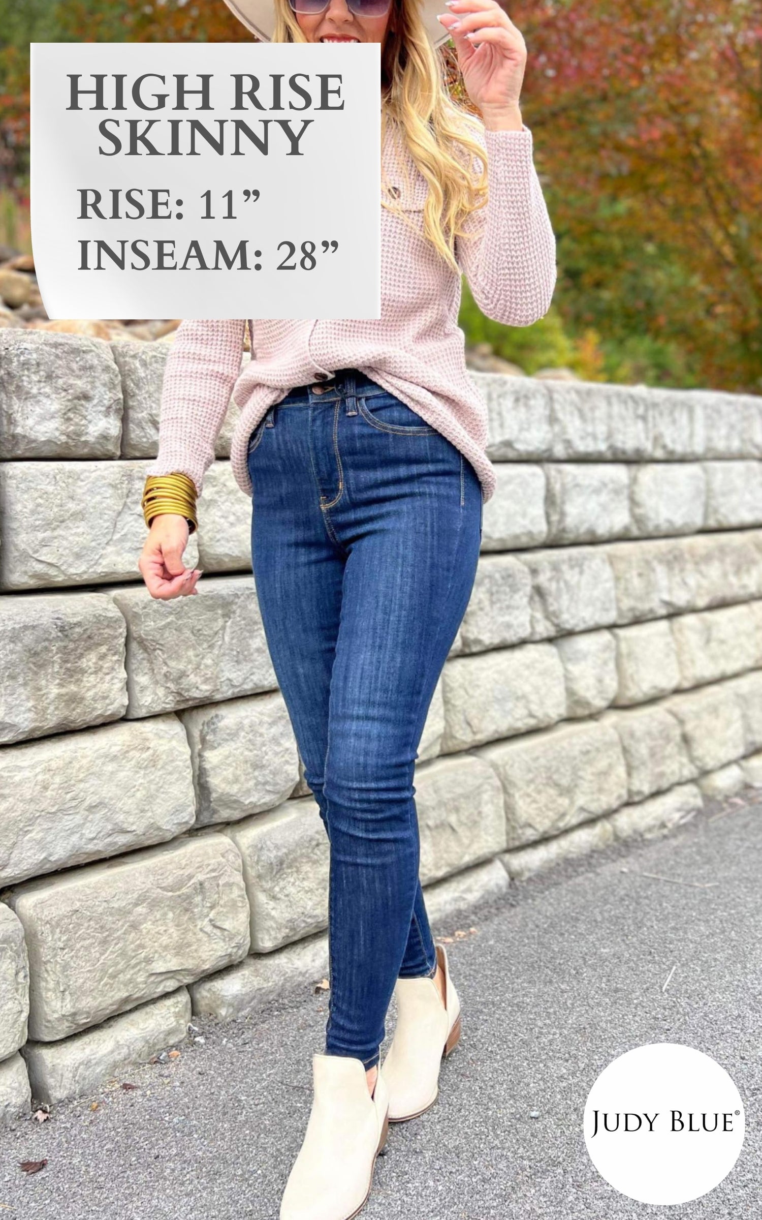 The perfect dark denim jean is here and of course its by our favorite brand Judy Blue! These high waist non-distressed skinny denim is our go to for a perfect date night or Sunday denim!