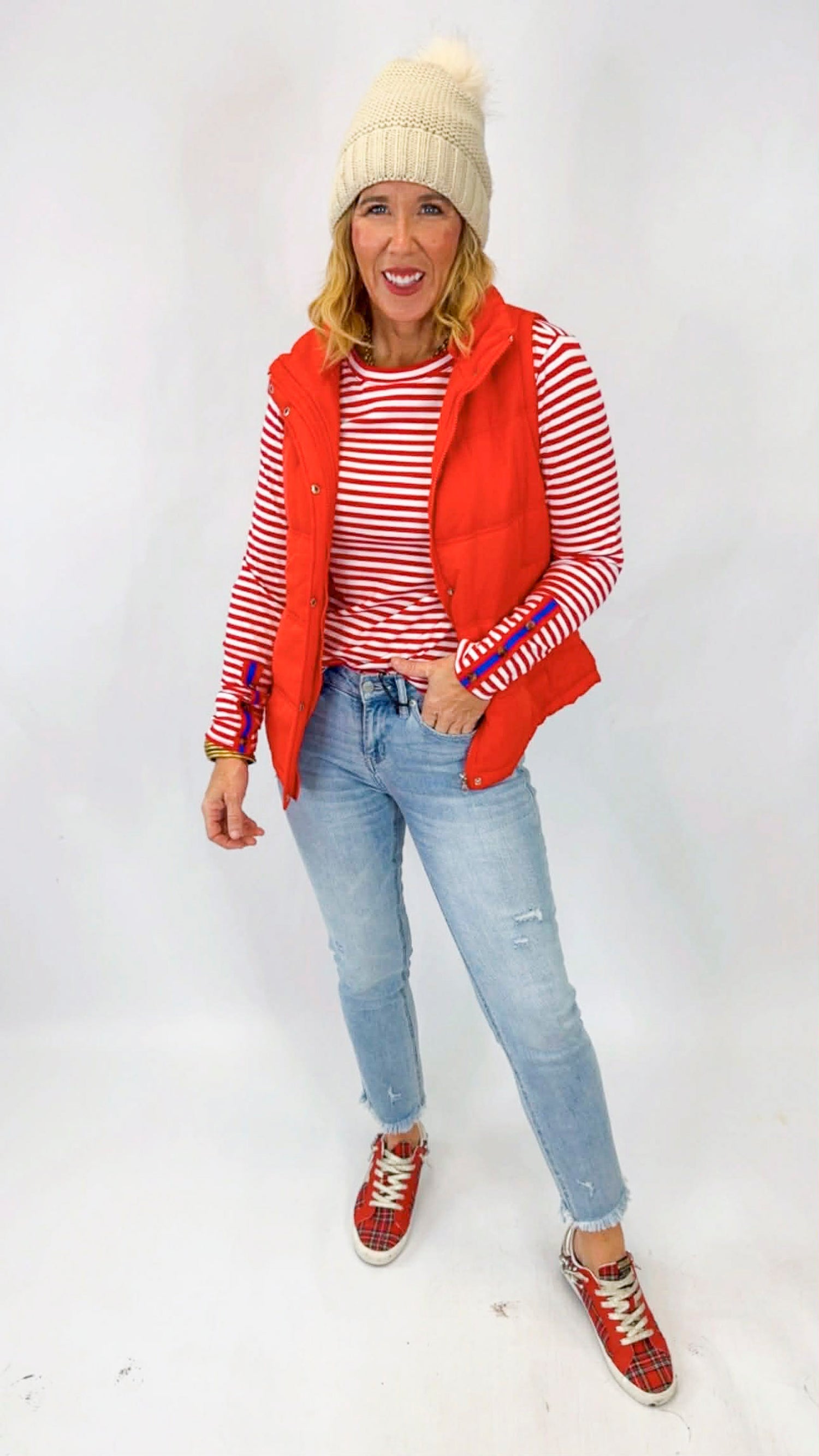 Meet your new go-to for crisp, classic vibes — the In the Hamptons Stripe Top. With bold red-and-white stripes and a pop of blue button detail on the sleeves, this top brings that all-American charm with a chic twist.
