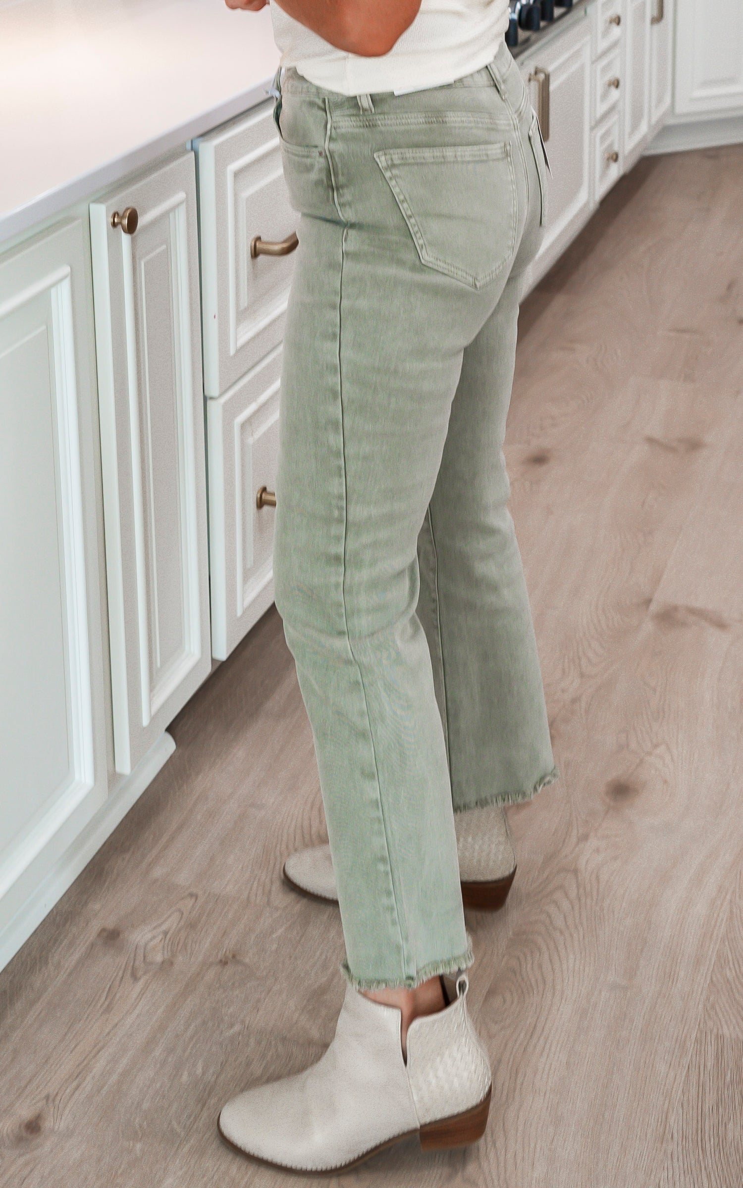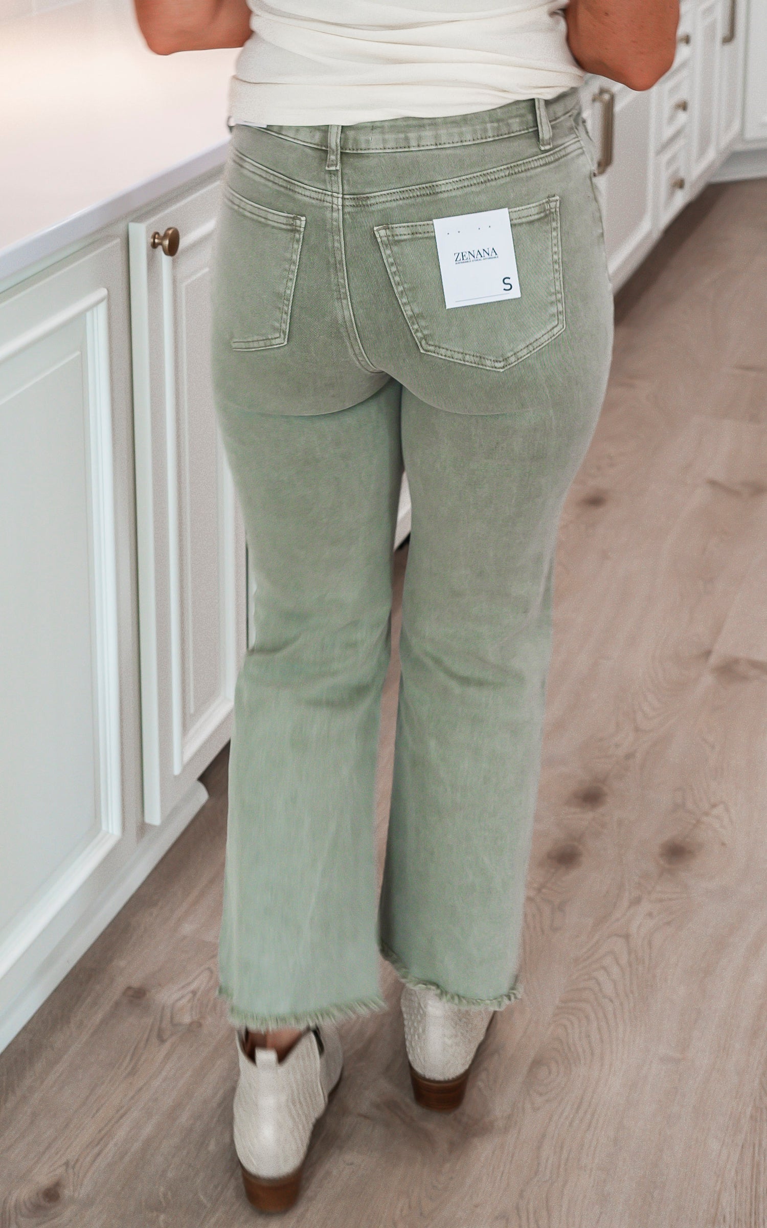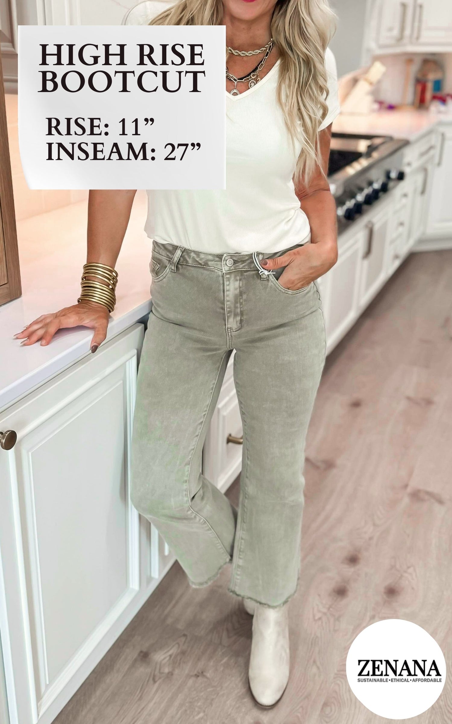 Light Olive Acid Wash High Waisted Bootcut Denim Jeans | Zenana- Final Sale