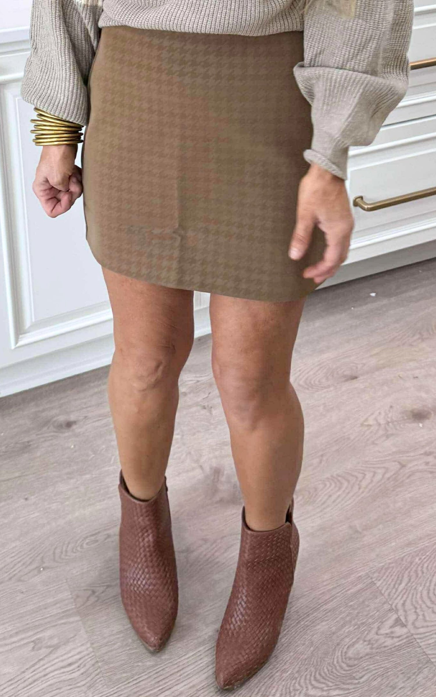 Indulge in the edgy chic allure of our Houndstooth Pleather Mini Skirt! The sleek pleather material adds a touch of glam to the classic houndstooth pattern, making this skirt a must-have for any fashion-forward wardrobe. Step out in style with confidence and turn heads wherever you go!