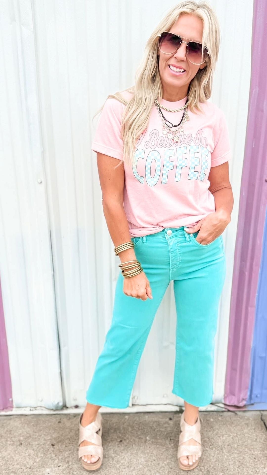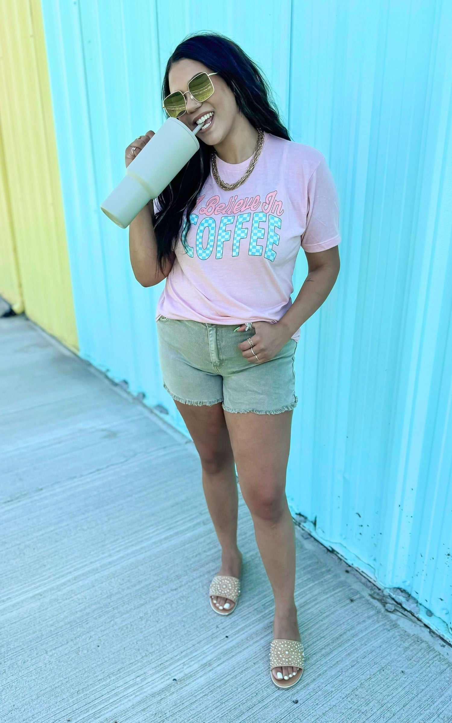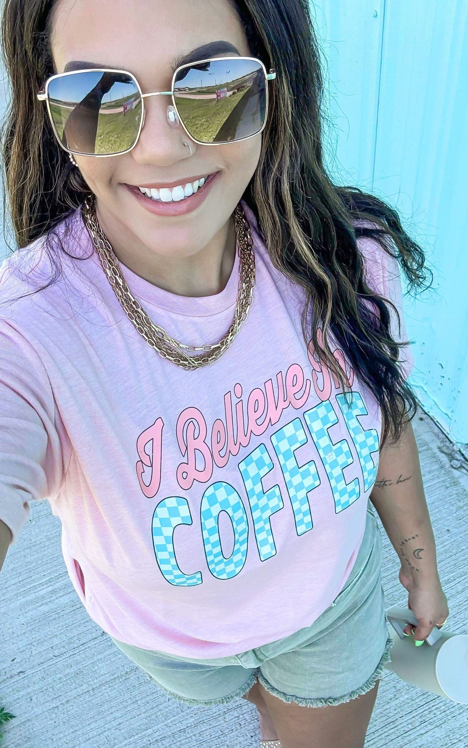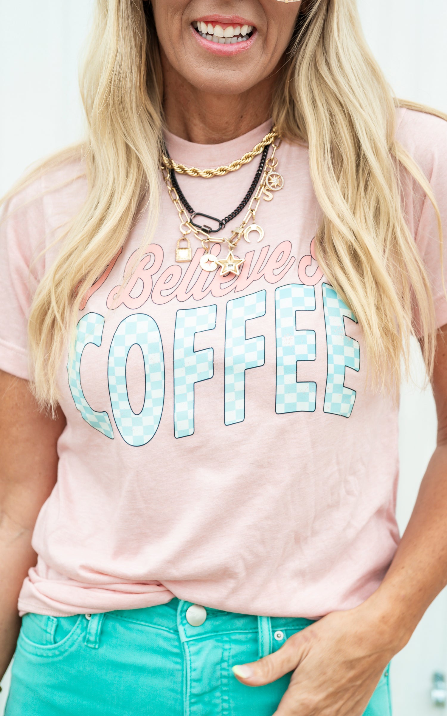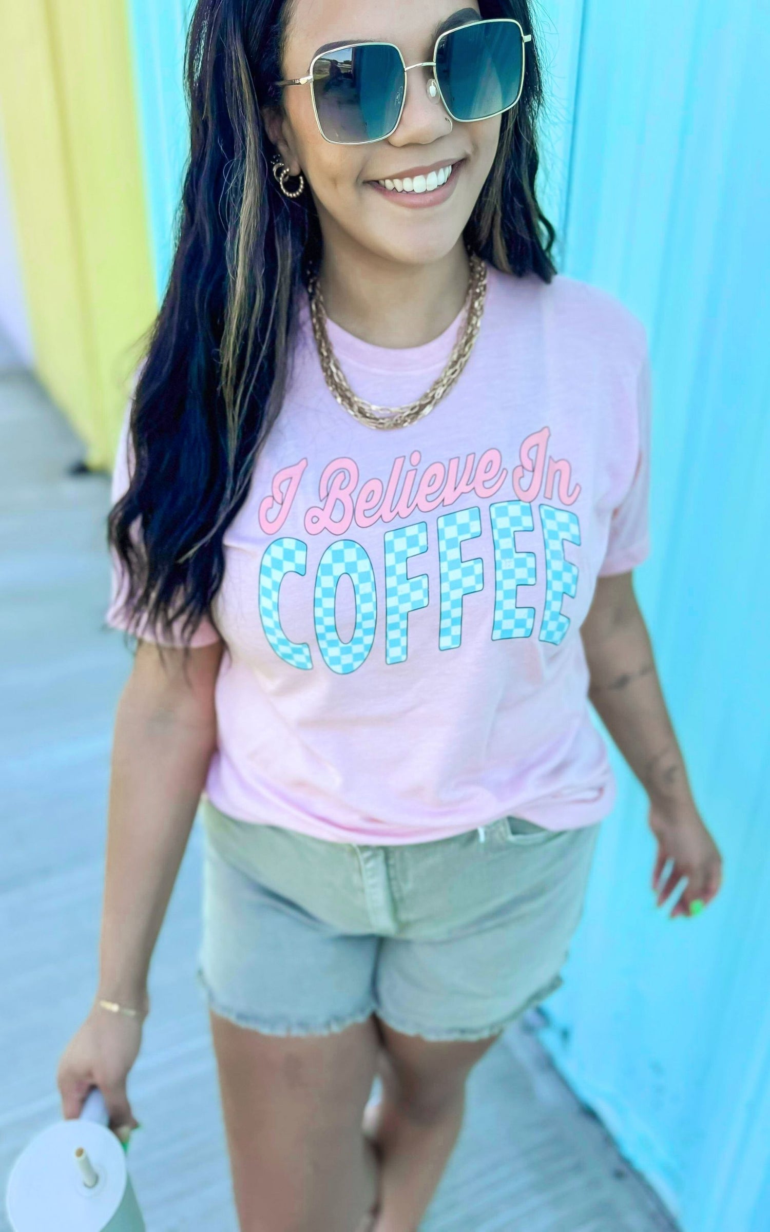 This playful t-shirt is perfect for coffee lovers. Featuring the phrase "I Believe in Coffee" in a fun and bold graphic, it's sure to bring a smile to anyone's face. Made with soft and comfortable fabric, it's the perfect addition to any casual outfit. Wake up and show your love for coffee with this quirky tee.