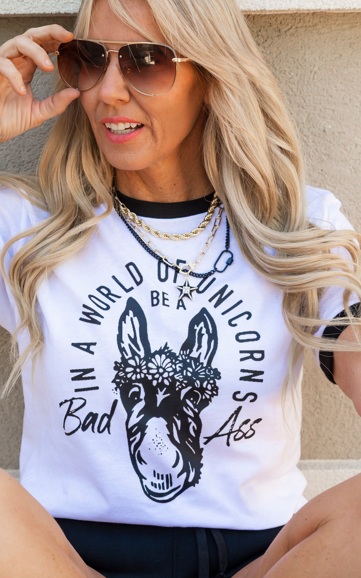 Experience the magic and uniqueness of our In a World of Unicorns Ringer Graphic T-shirt. With the bold statement "be a Bad Ass", show off your confidence and rebel spirit while looking stylish. Made with high-quality materials, this shirt is comfortable and durable. Unleash your inner unicorn!