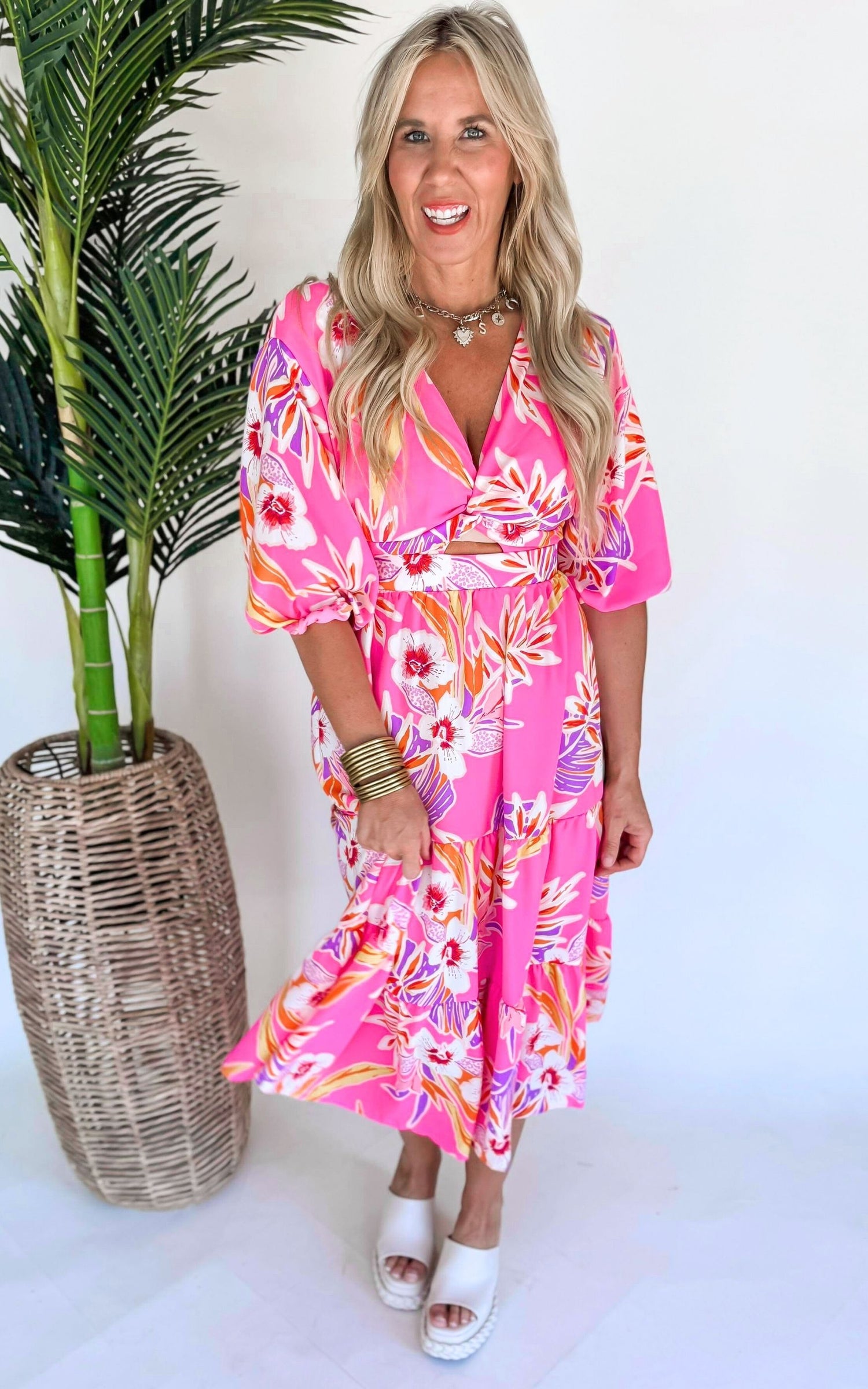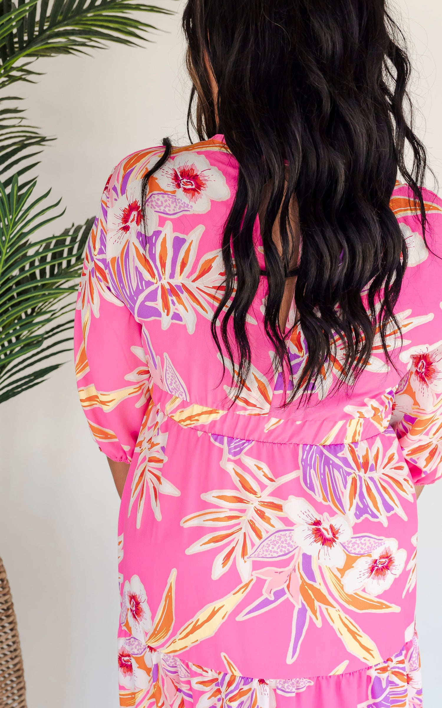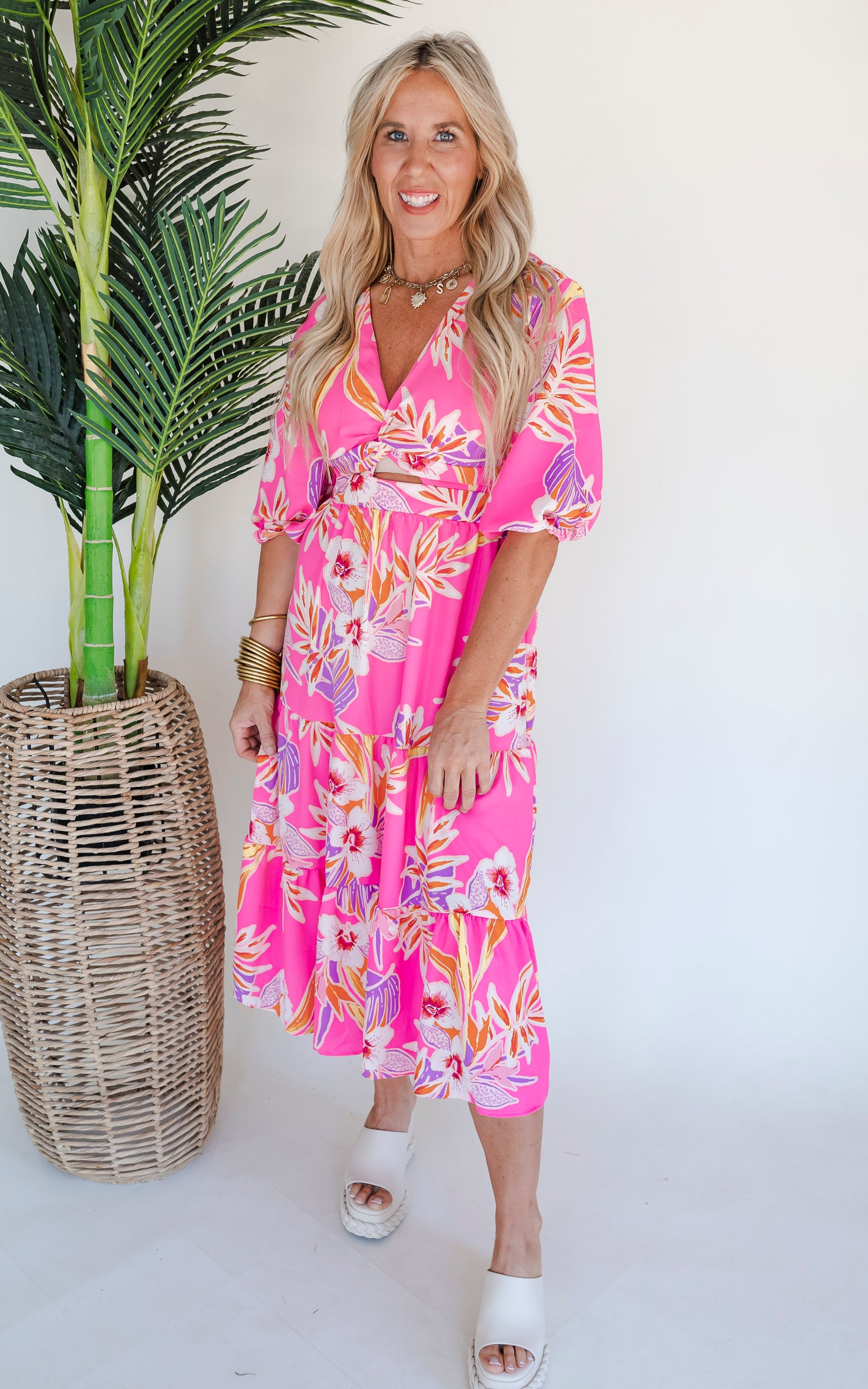 Get ready for an Island Getaway in this Tropical Maxi Dress! Embrace the island vibes with its fun and vibrant pattern. Perfect for any tropical vacation, this dress is not only stylish but also comfortable with its maxi length. Make a statement and stand out in this must-have dress!