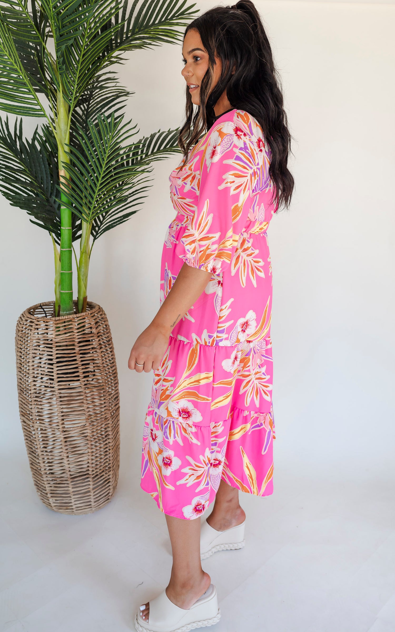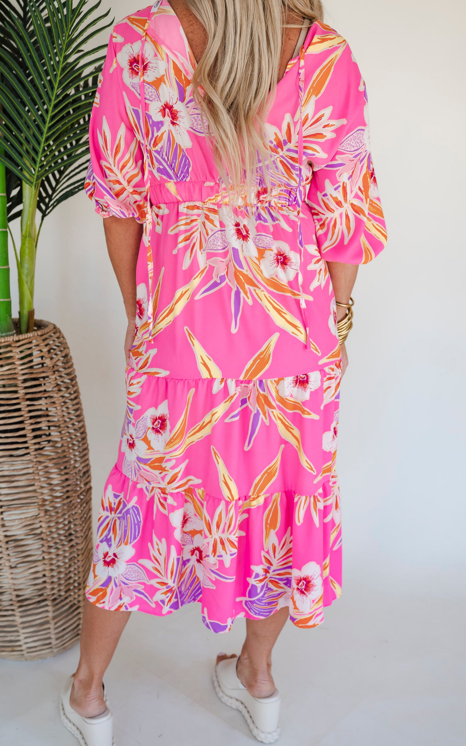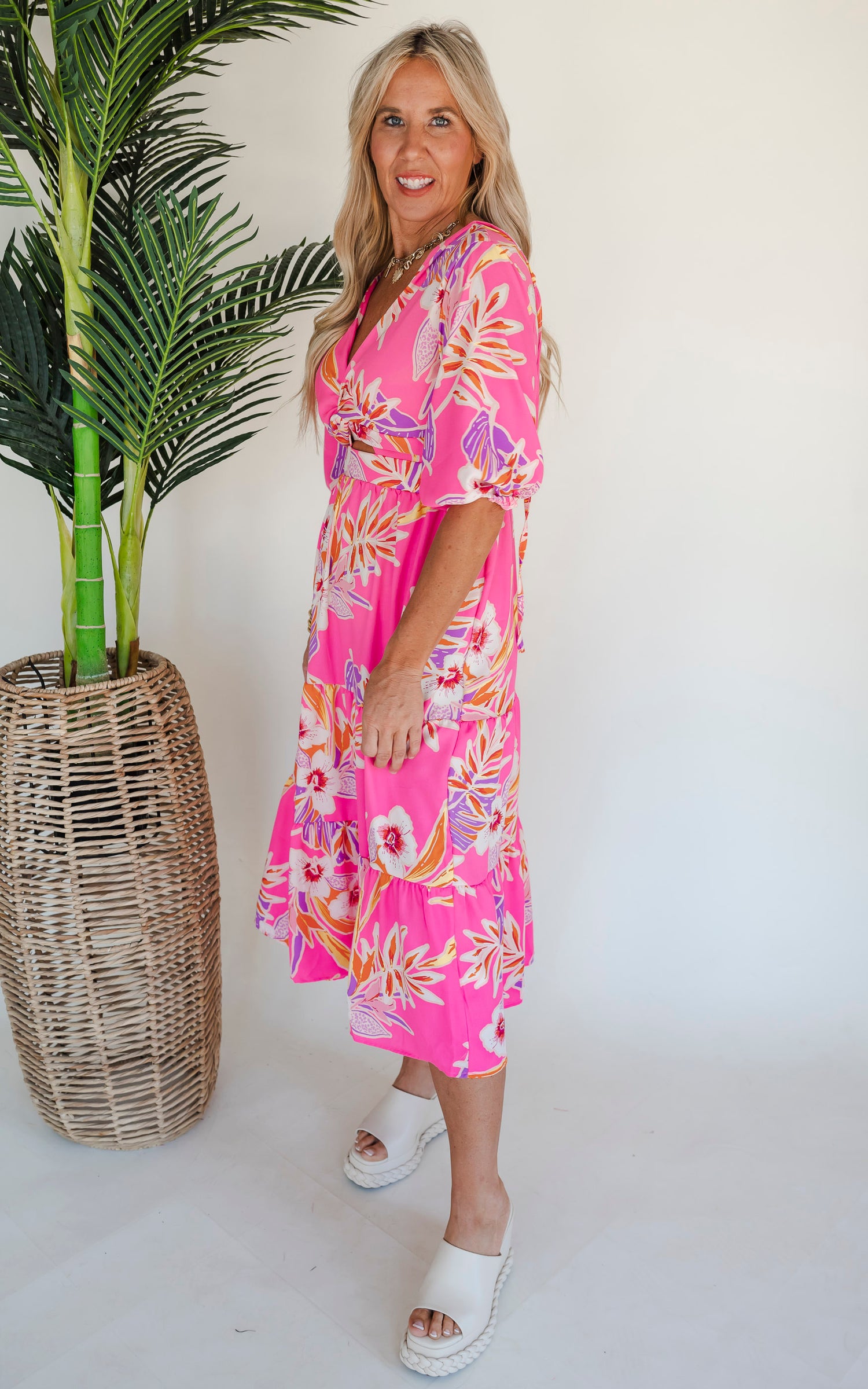 Get ready for an Island Getaway in this Tropical Maxi Dress! Embrace the island vibes with its fun and vibrant pattern. Perfect for any tropical vacation, this dress is not only stylish but also comfortable with its maxi length. Make a statement and stand out in this must-have dress!
