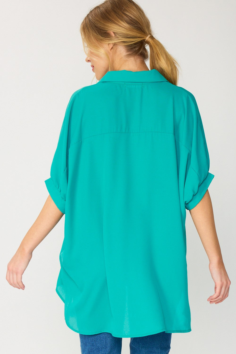Our classic solid button-down shirt is a wardrobe essential. The shirt is semi-sheer with a high-low hem and can be paired with any type of bottoms.