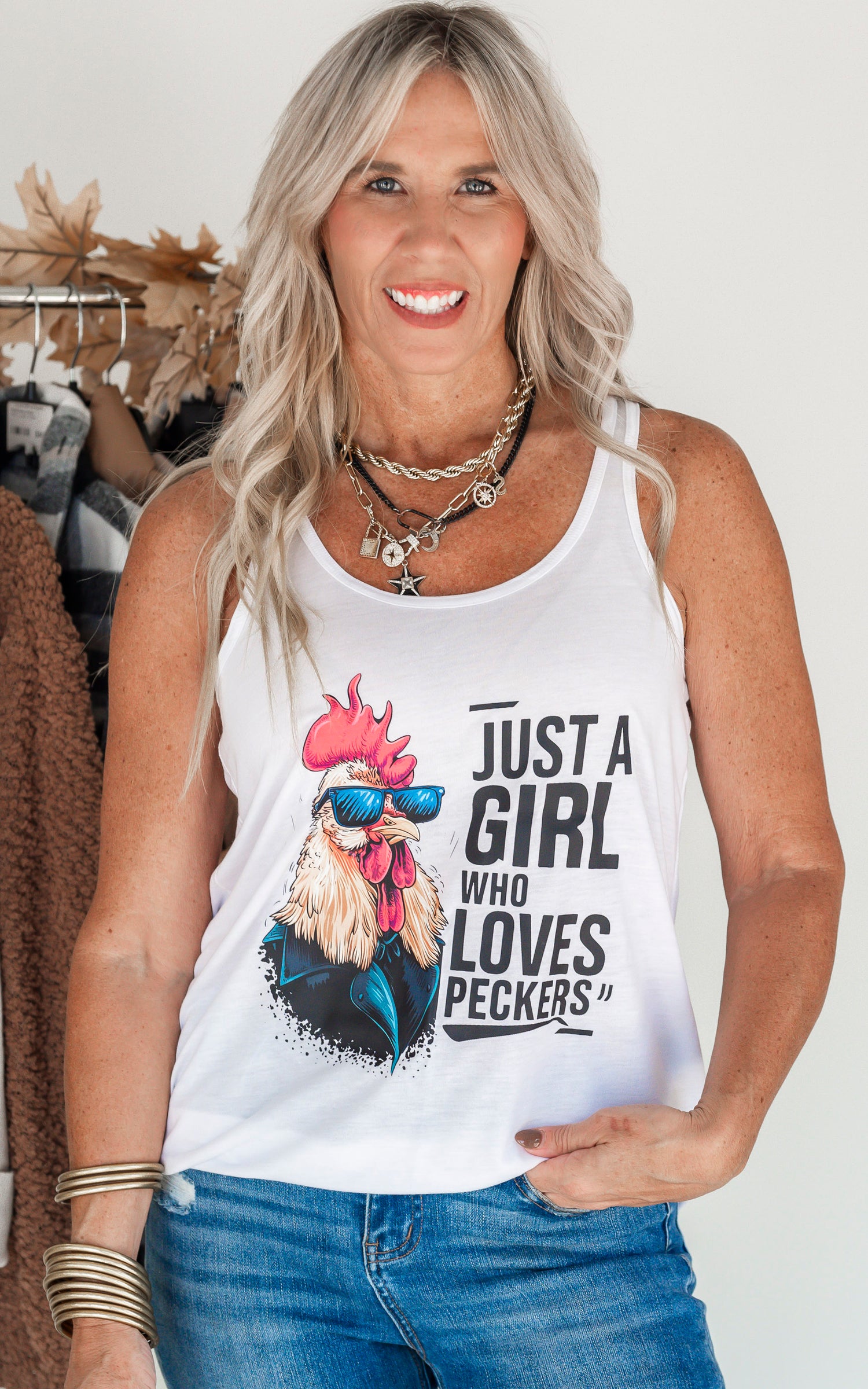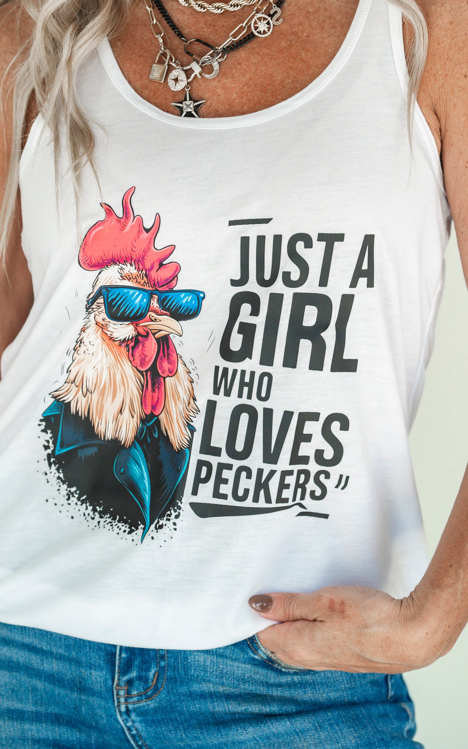 Show your love for all things feathered with this playful tank top. The "Just a Girl who Loves Peckers" graphic is sure to spark some laughs. Enjoy a comfortable, racerback fit while sporting your quirky sense of humor. (Because who doesn't love some good word play?)