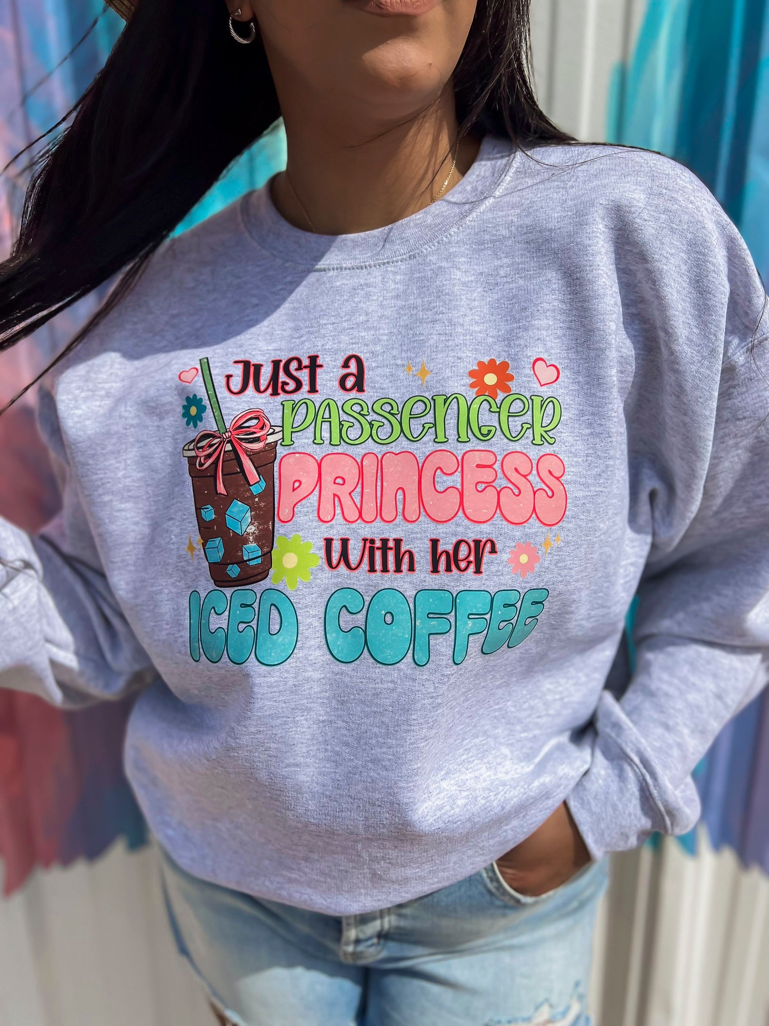 Join the ranks of the Passenger Princesses with this cute crewneck sweatshirt featuring a playful graphic of a princess just taking a ride with her trusty iced coffee. Stay warm and stylish while showing off your commuter pride.
