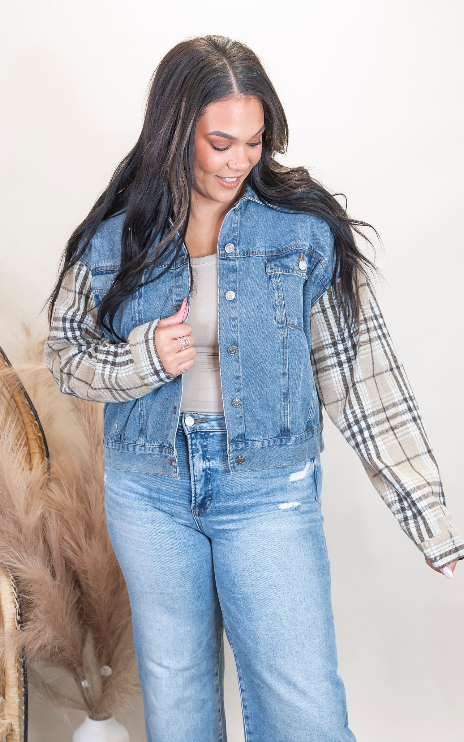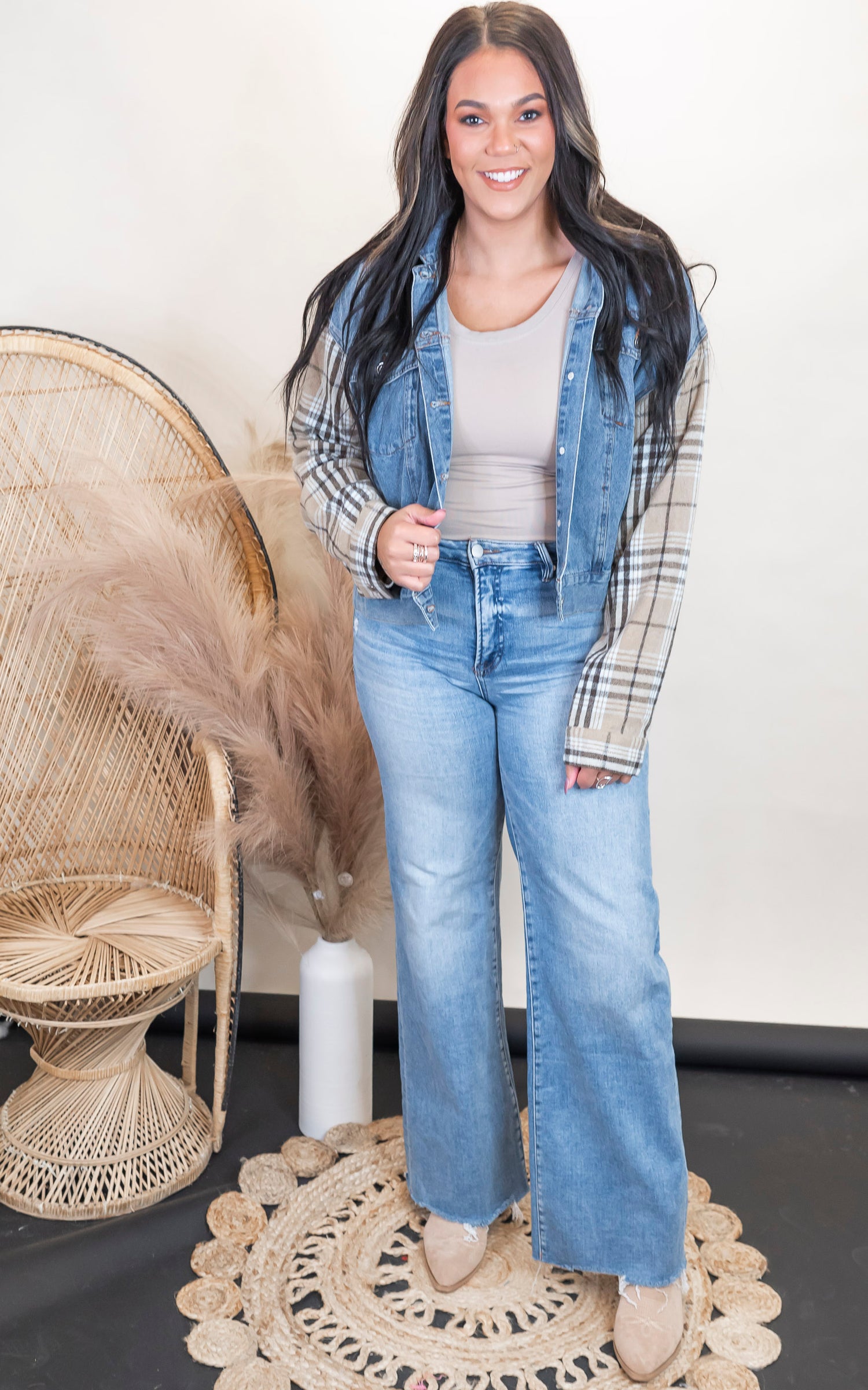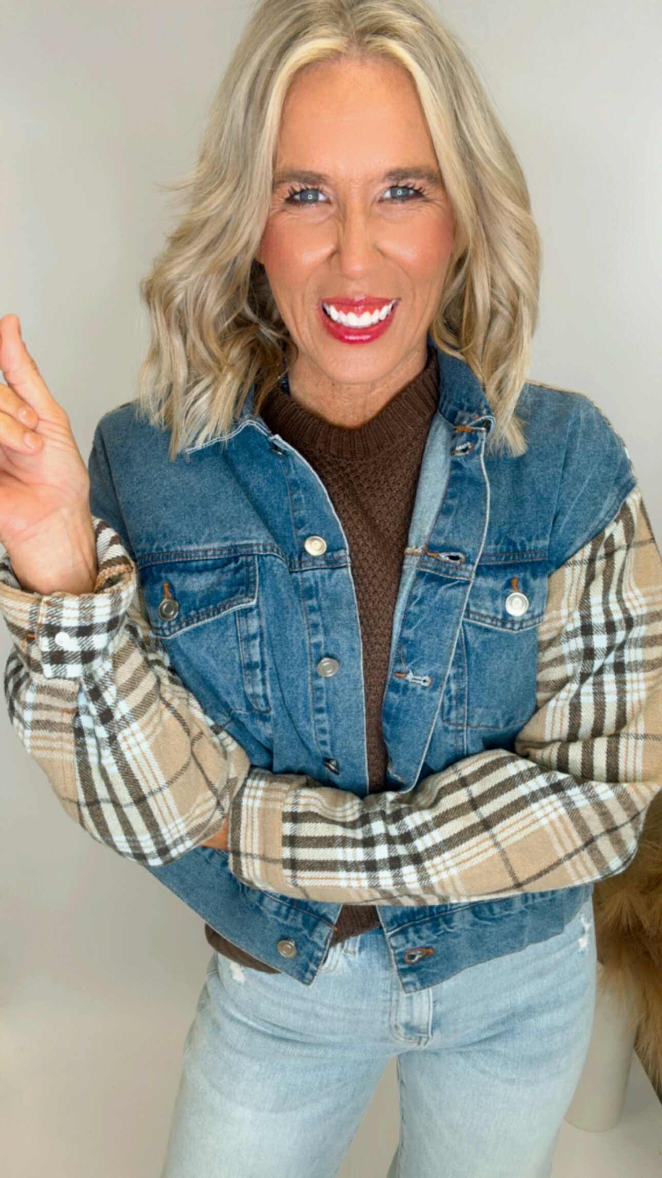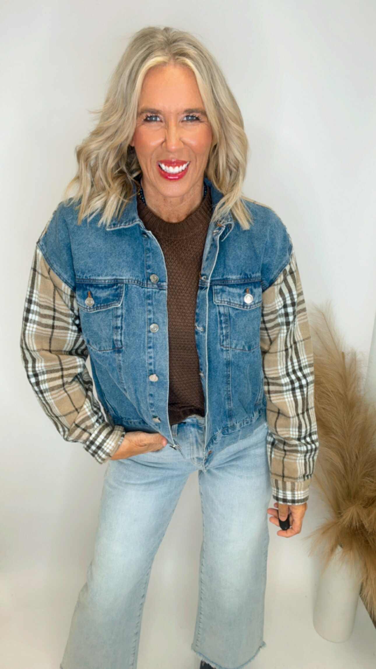 Unleash your inner fashionista with our Denim Plaid Contrast Jacket. Perfect for any season, this jacket combines the classic look of denim with the timeless appeal of plaid. Stay stylish and comfortable while making a statement.