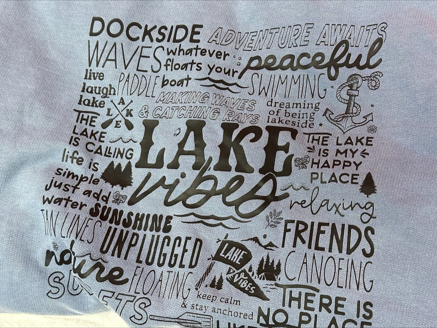 Have a the good vibes while at the lake! Stay nice and cozy at the campfire. This is a crewneck sweatshirt.