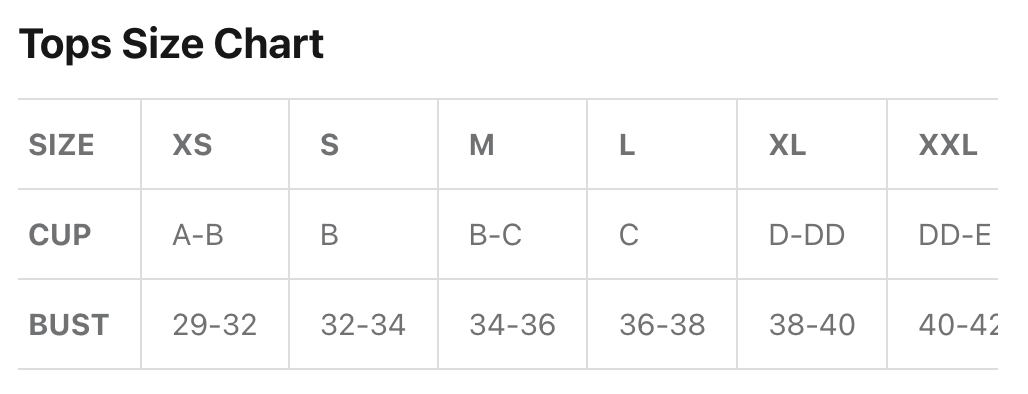 **Please note some tops are constructed with back ties, while others are constructed with clips. Back ties can be adjusted to your exact measurements and the clip backs include three slot options that allow for about an inch size adjustment. Cup sizes are sized as listed.