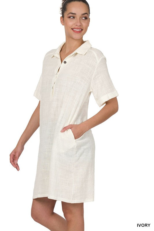 We love this button down shirt dress, drapes just right and holds its shape after the wash. It's perfect for those summer days when you just want to chill in style.