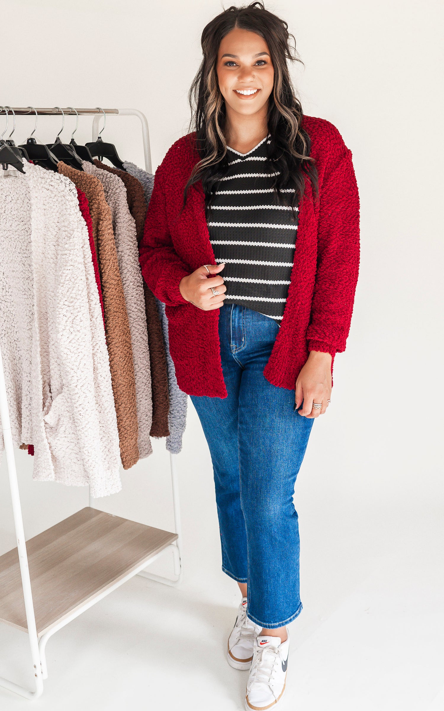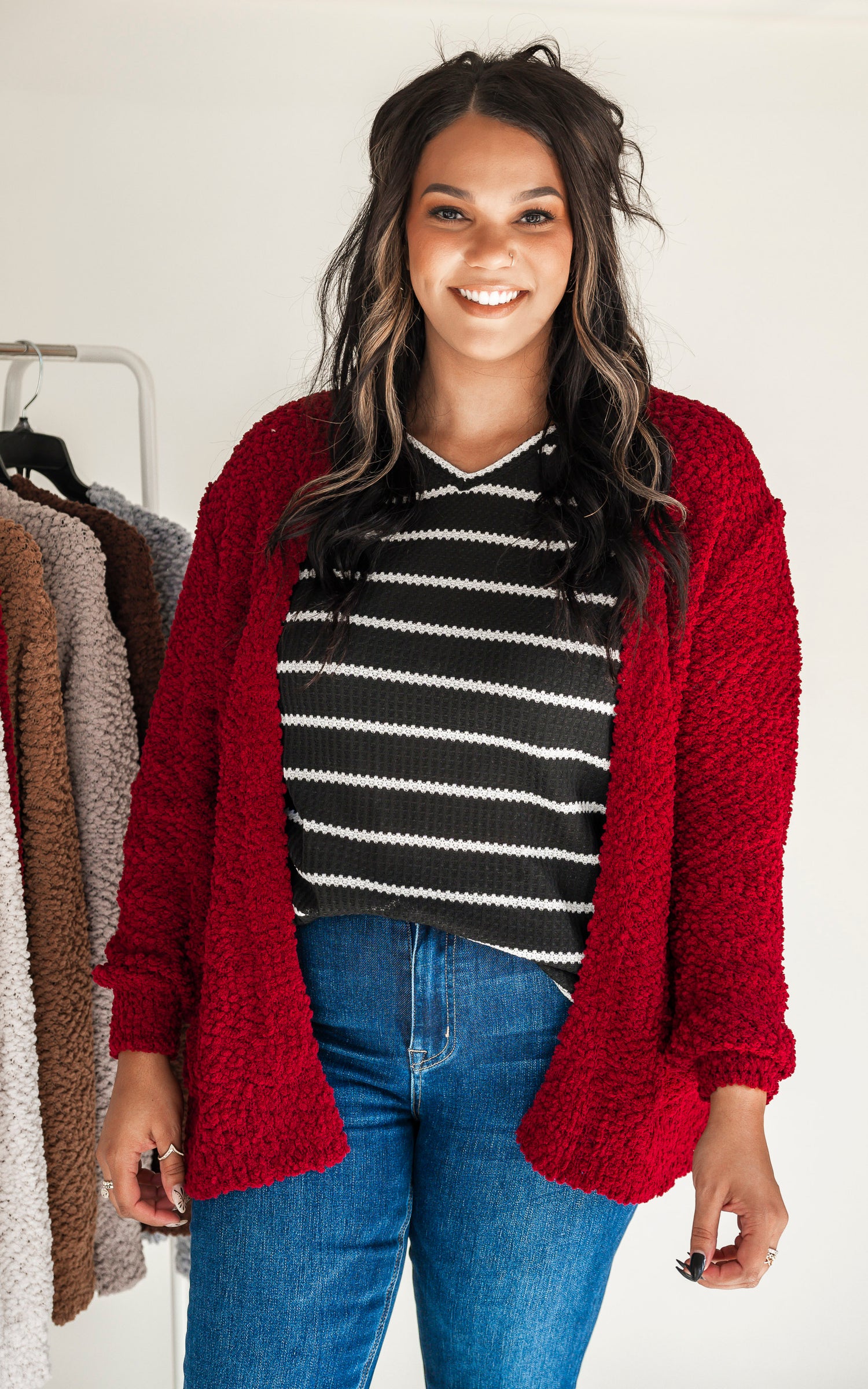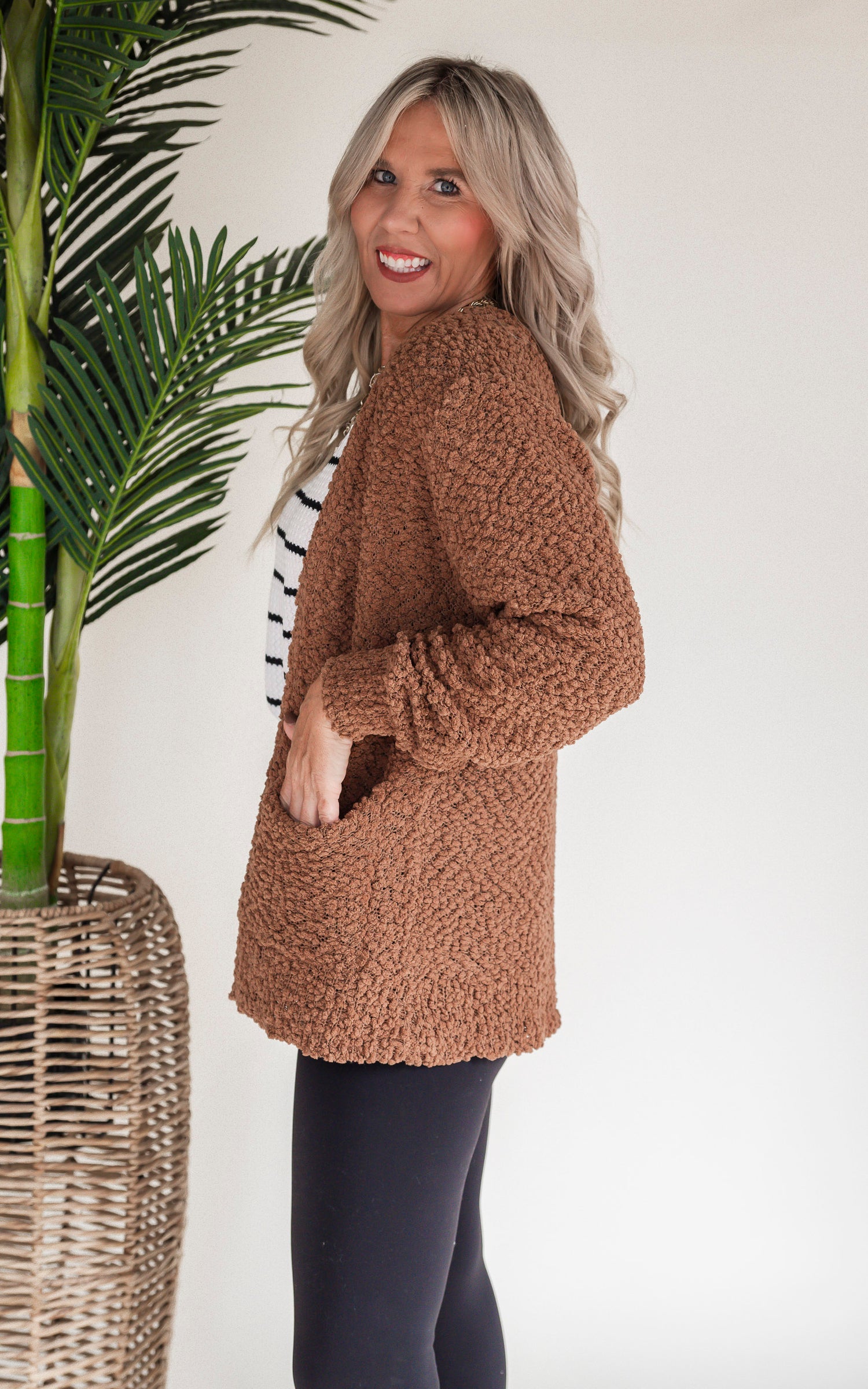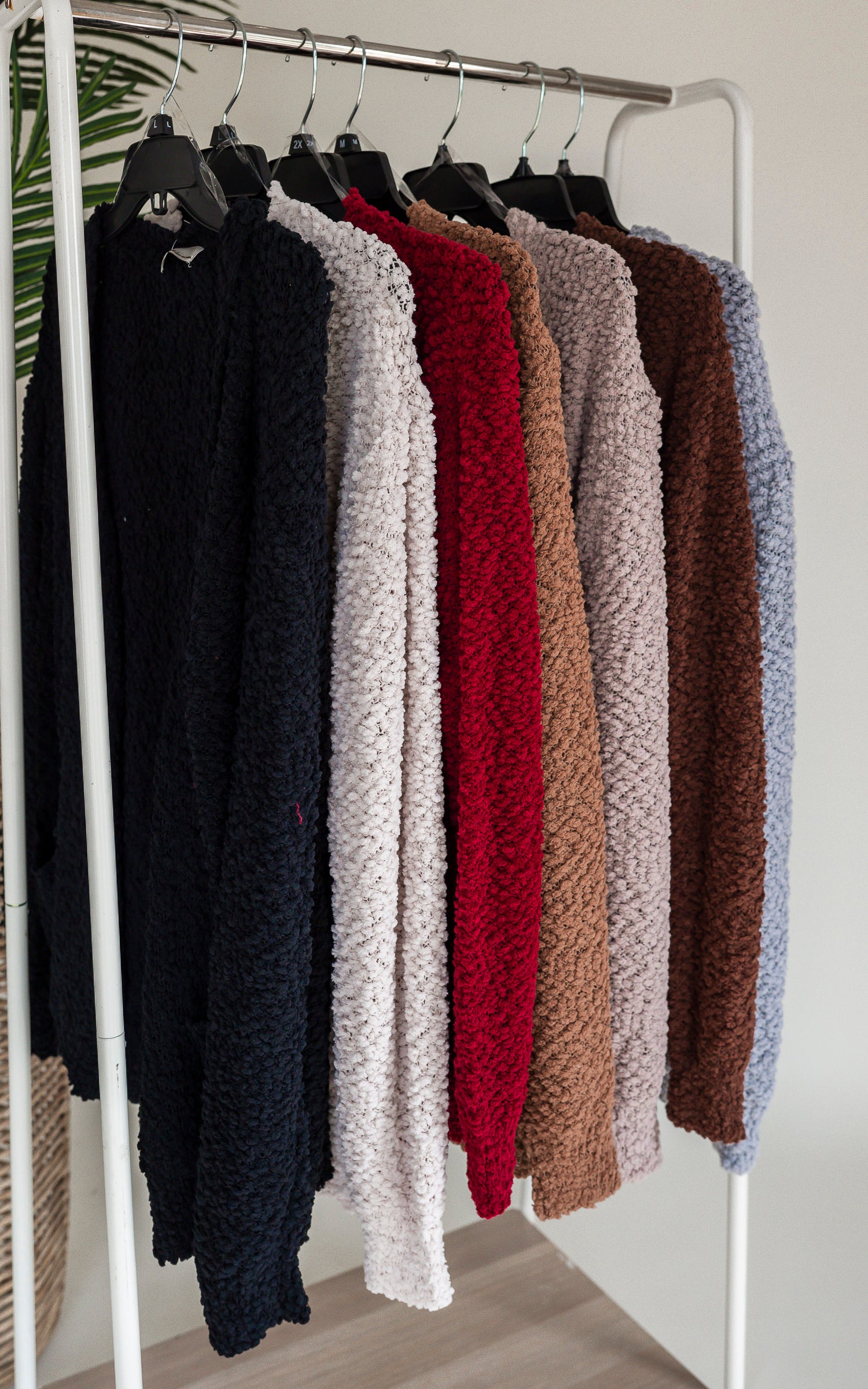 Add a touch of fun and texture to your wardrobe with our Long Sleeve Popcorn Cardigan. This cozy and stylish piece is perfect for chilly days and features a unique popcorn-like texture. Stay warm and stylish all season long with our Long Sleeve Popcorn Cardigan!**