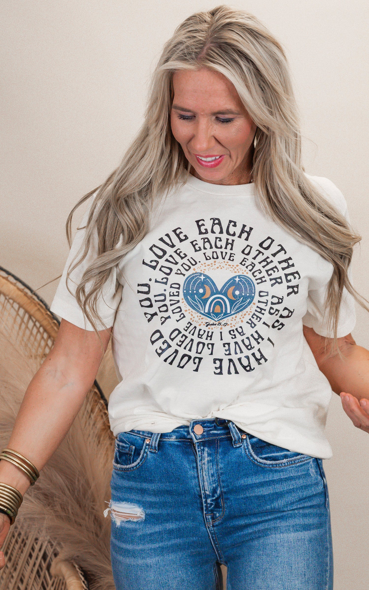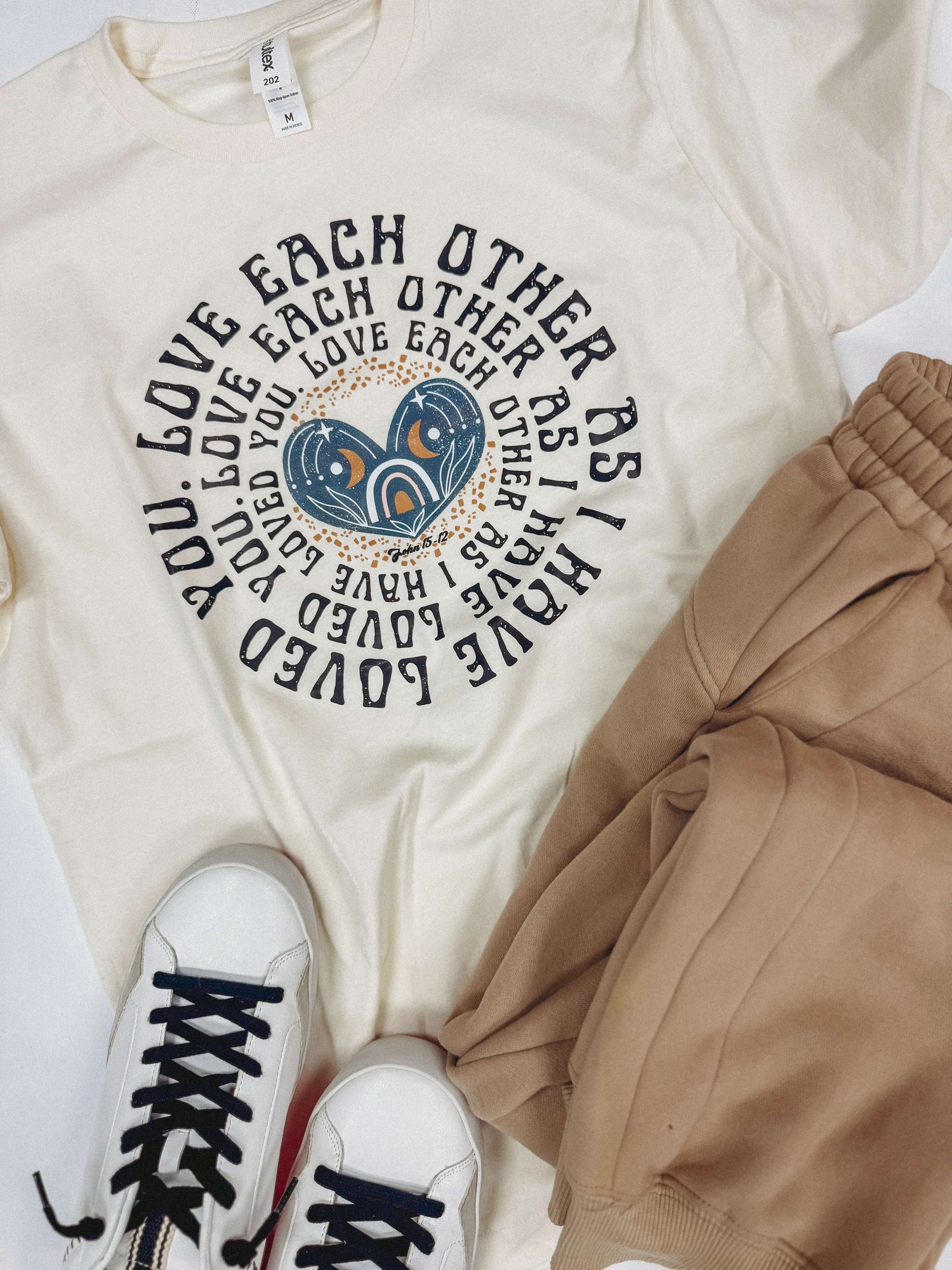 Spread the message of love with our Love Each Other Graphic T-shirt! Our stylish and comfortable t-shirt features a bold and colorful graphic design that will inspire and remind everyone to love and accept each other. Perfect for everyday wear or as a thoughtful gift for your loved ones.