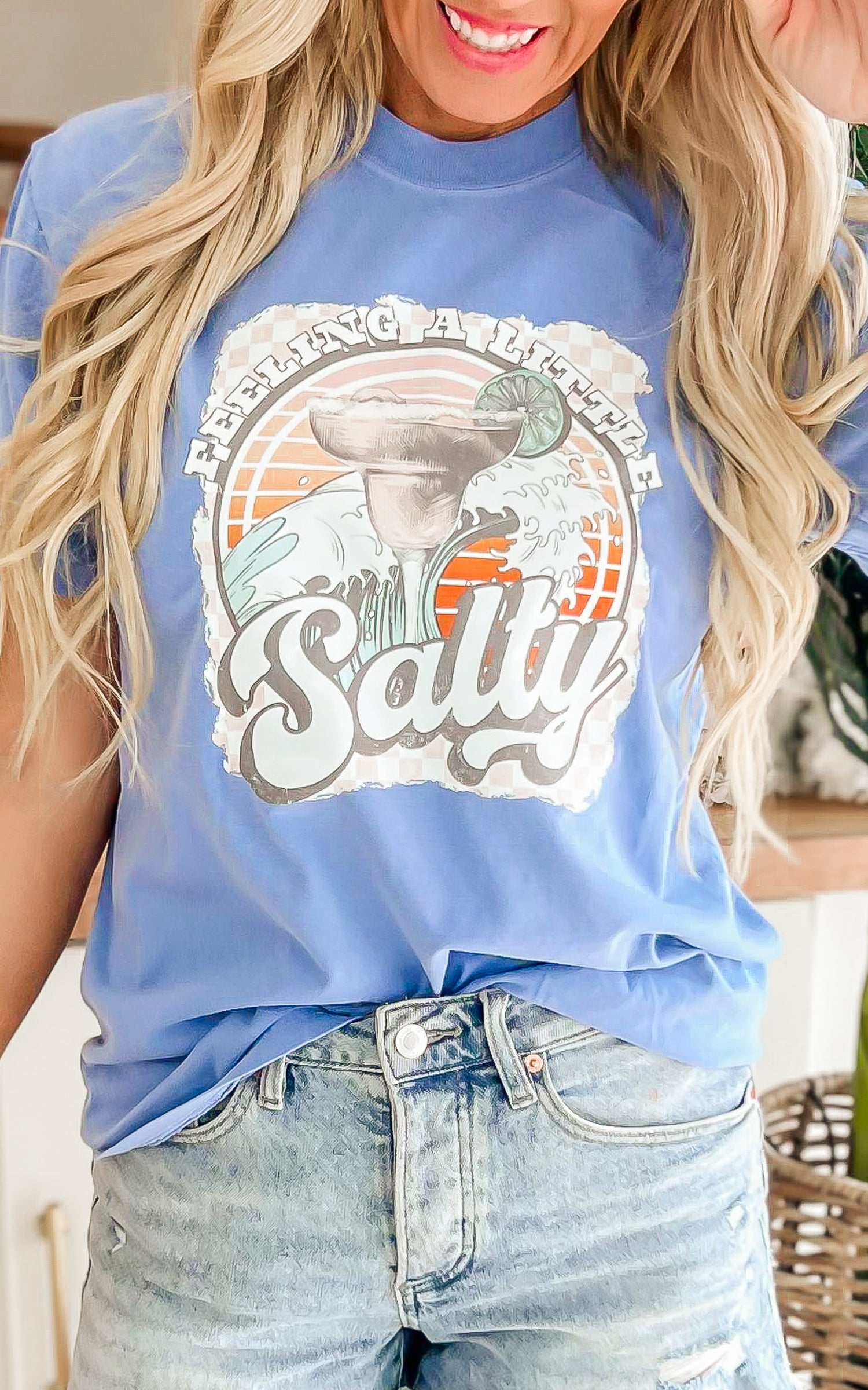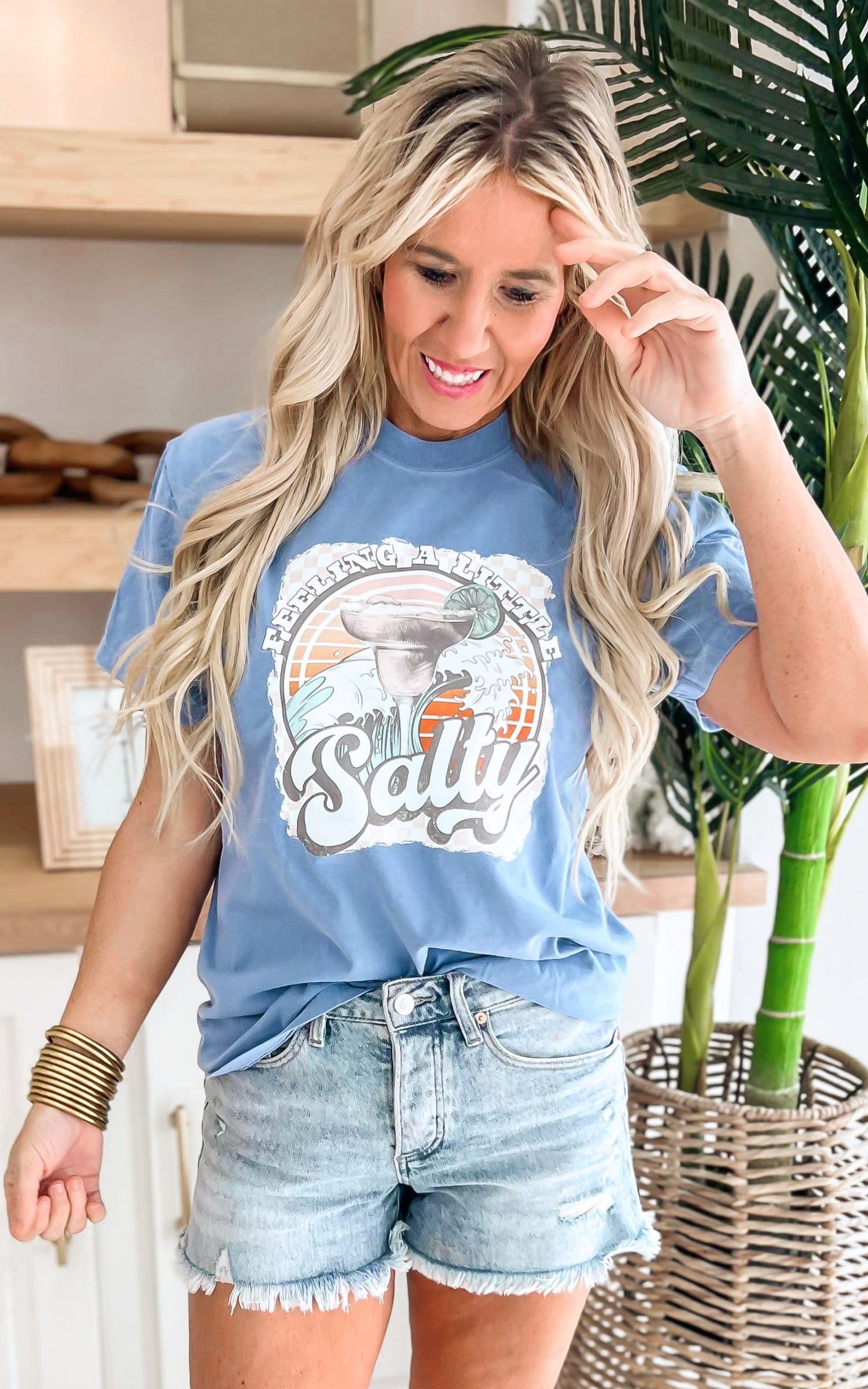 Get ready to embrace your playful side with our Lt Blue FEELING SALTY T-shirt! Garment dyed for extra softness and a unique look, this graphic tee will be your go-to for adding a touch of quirk to any outfit. Perfect for those who don't take themselves too seriously.
