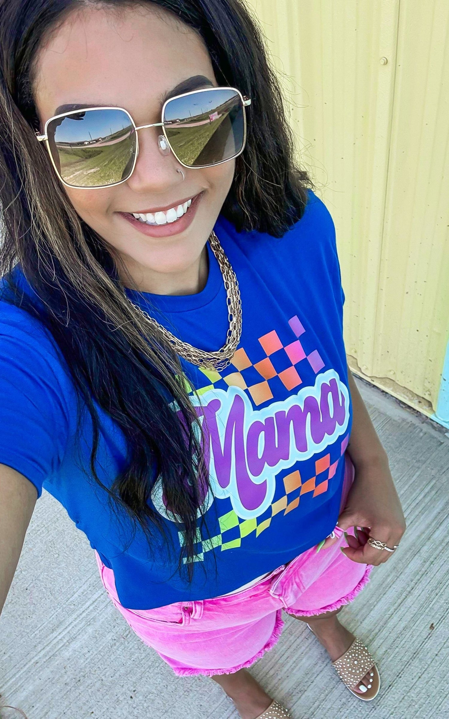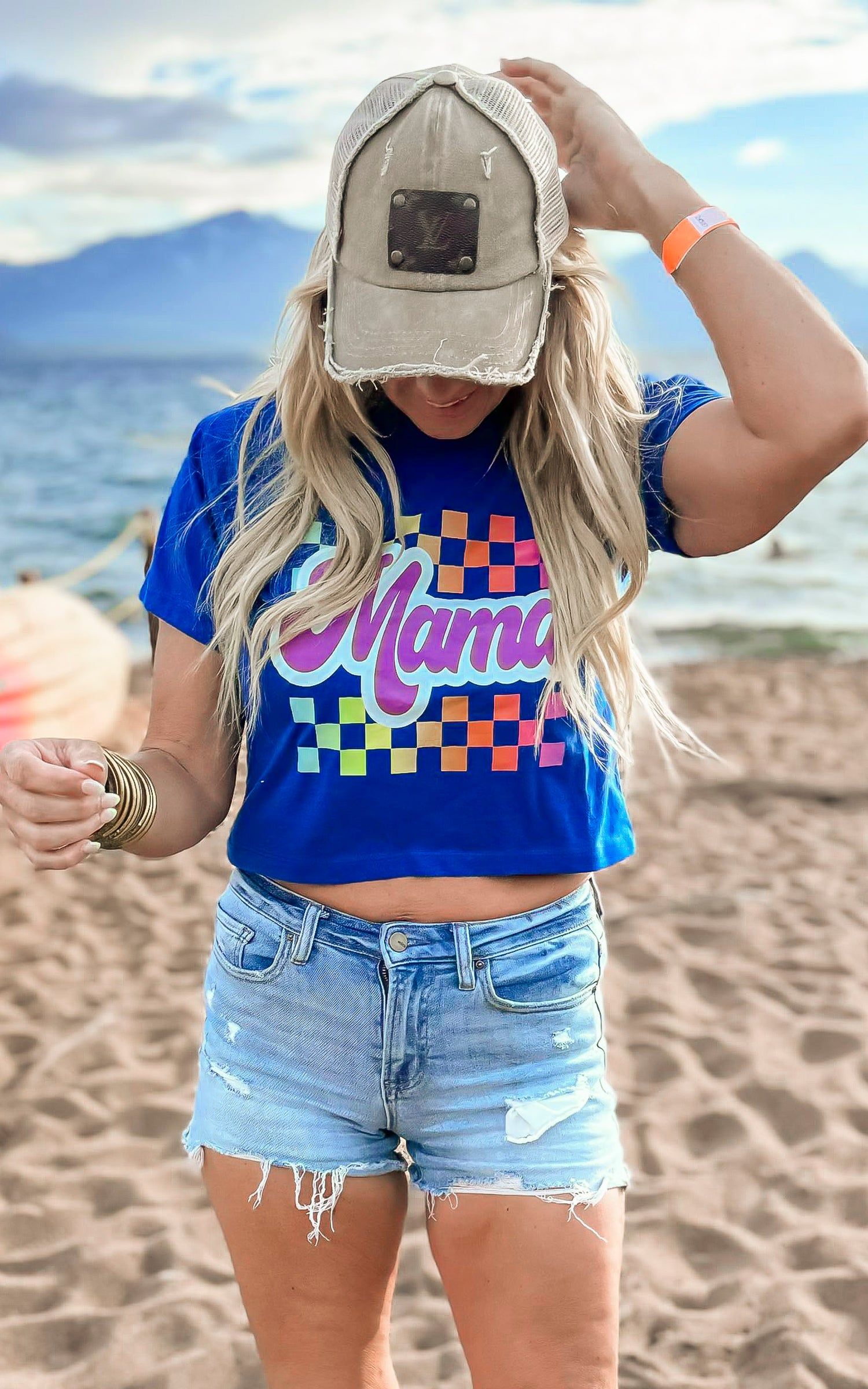 Keep it casual and cute with the Mama Check Graphic Crop T-Shirt. Show off your mom pride with a playful check graphic design. This quirky crop top is perfect for any mom who doesn't take themselves too seriously. (No mom jeans here!) Get your mom squad together and rock this fun and stylish tee!
