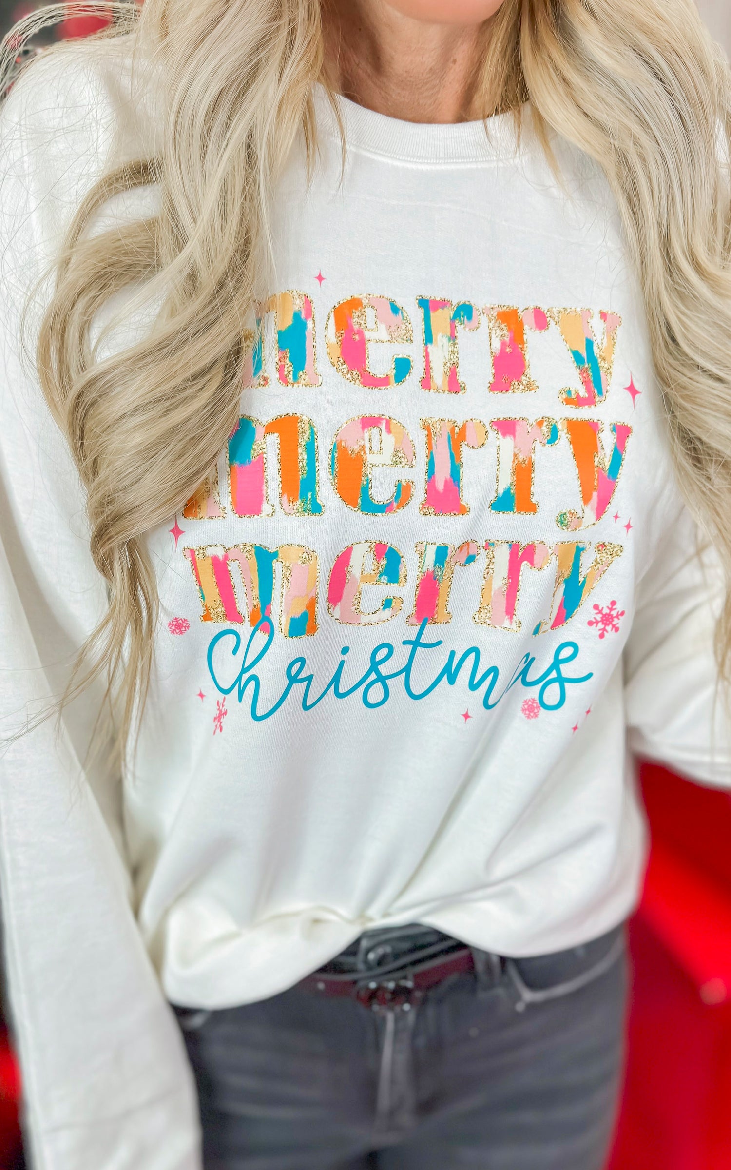 This Merry Merry Merry Christmas crewneck sweatshirt will keep you warm while spreading holiday cheer. Perfect for any occasion, it's the must-have addition to your winter wardrobe. Embrace the season with this trendy and festive sweatshirt!