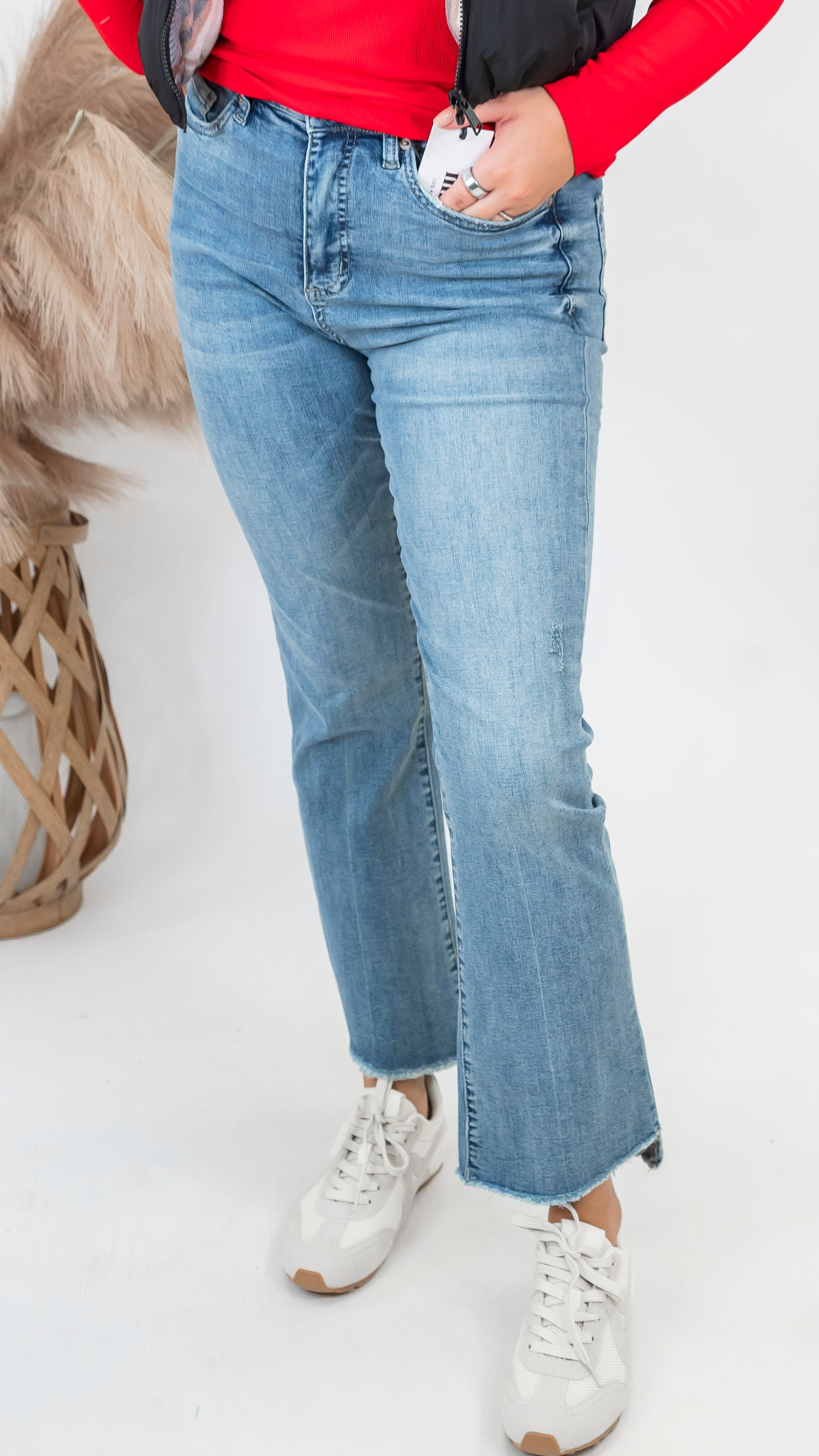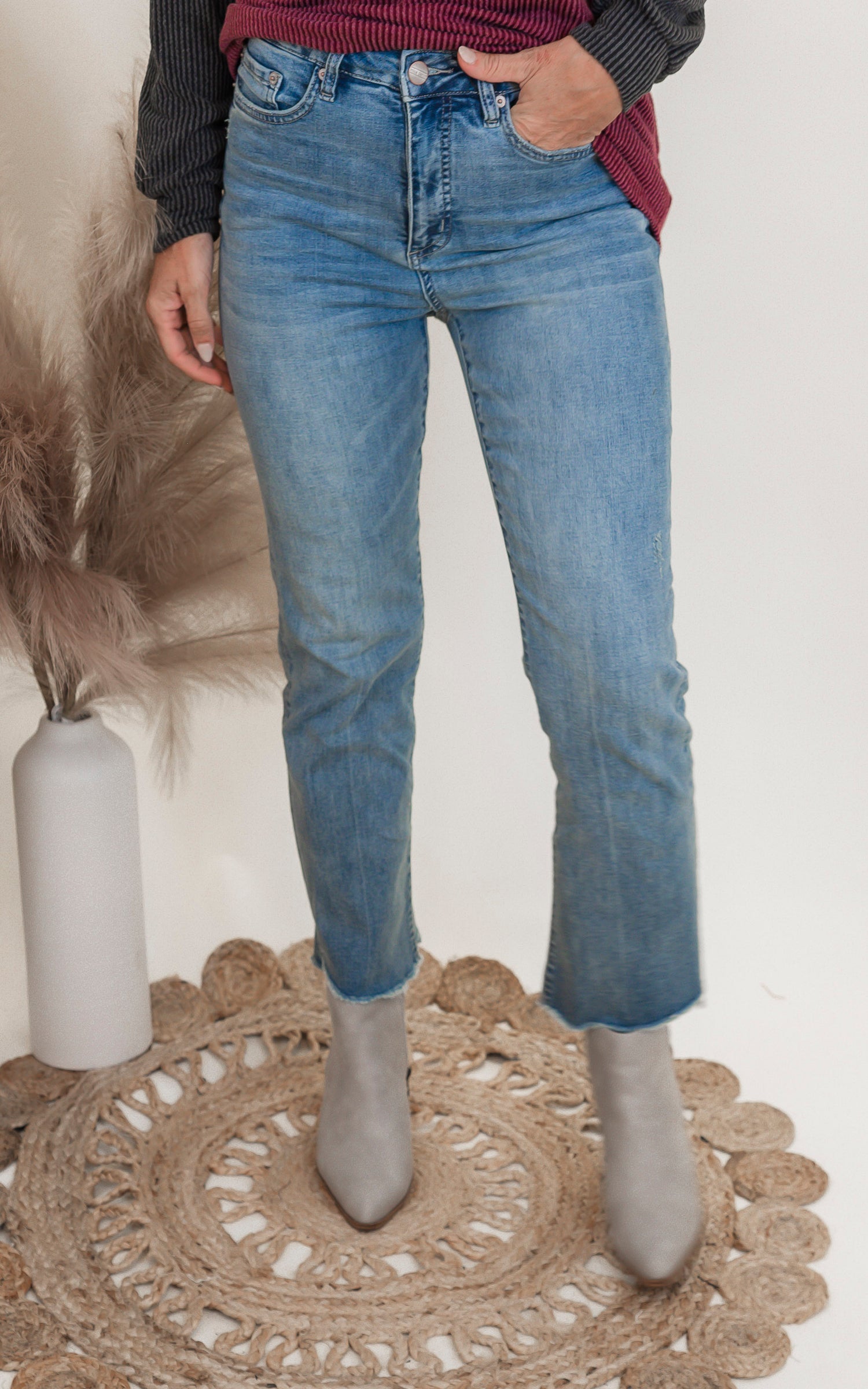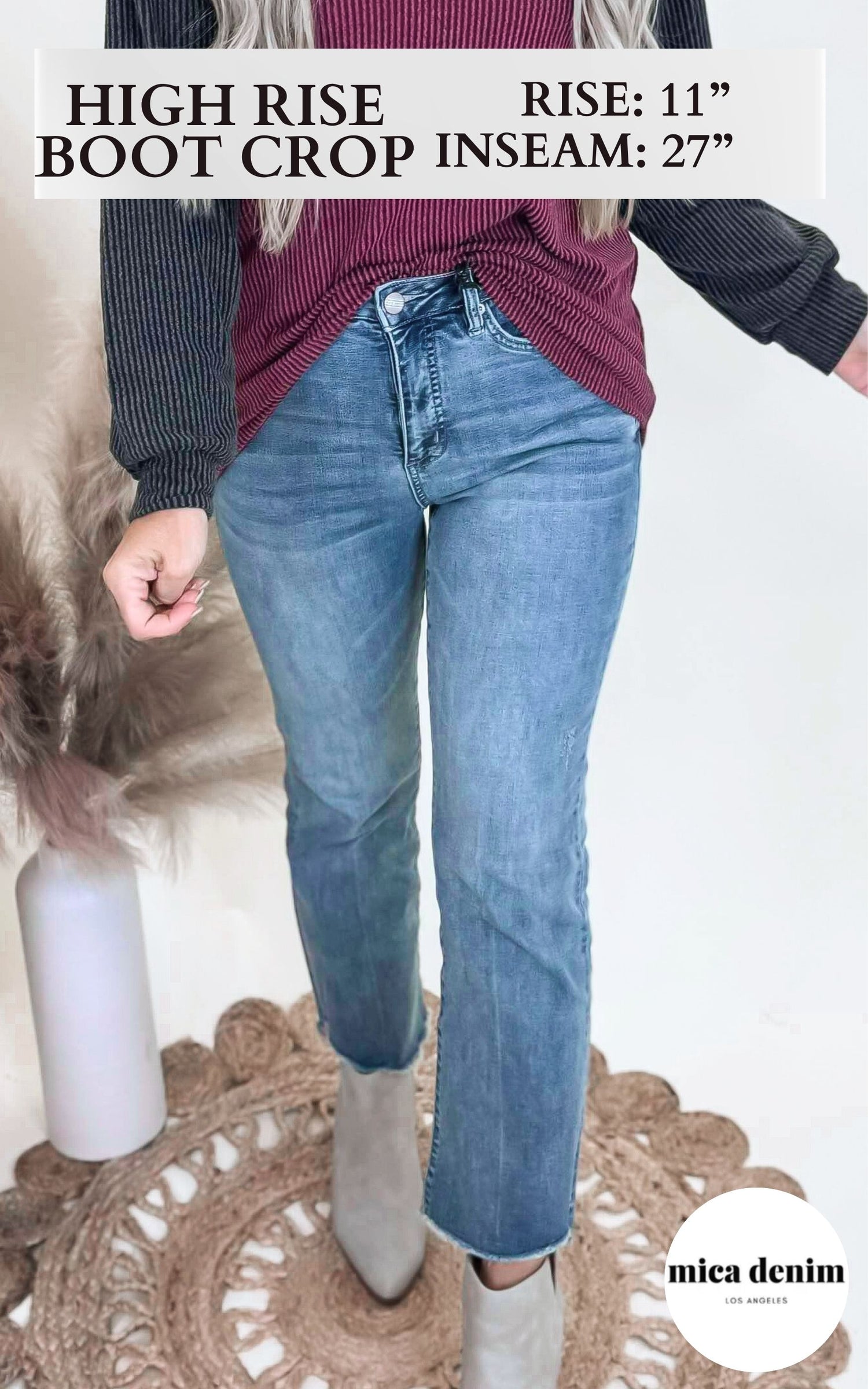 Transform your wardrobe with our MICA Allure Bootcut Crop Jean! Featuring a super high rise and trendy bootcut fit, these jeans will flatter your figure and elevate any outfit. Made with durable denim, they offer both style and comfort. Upgrade your look with these must-have jeans!