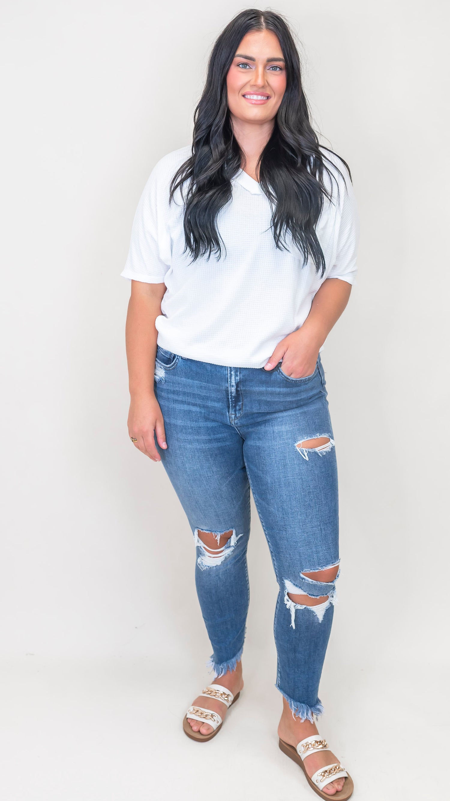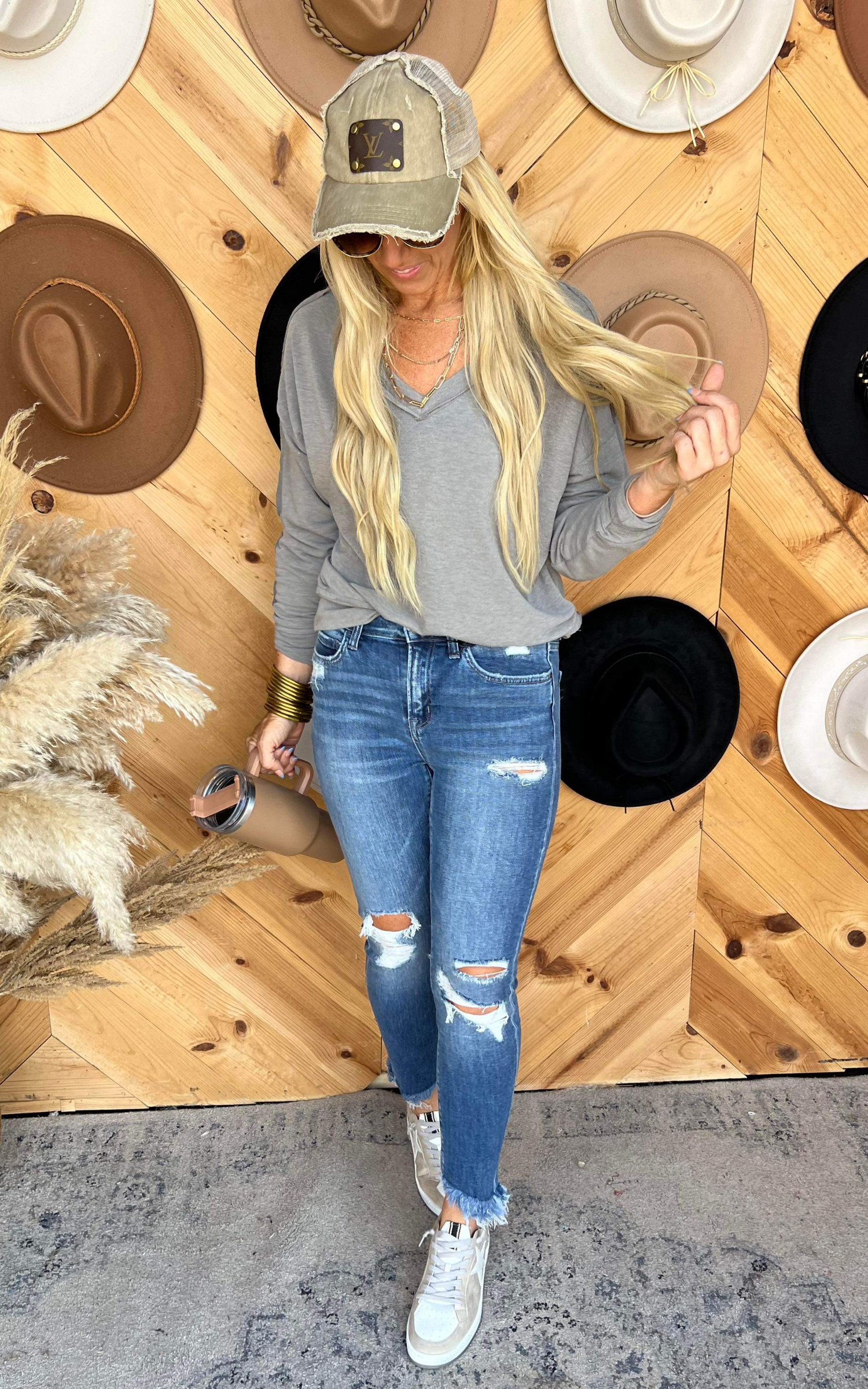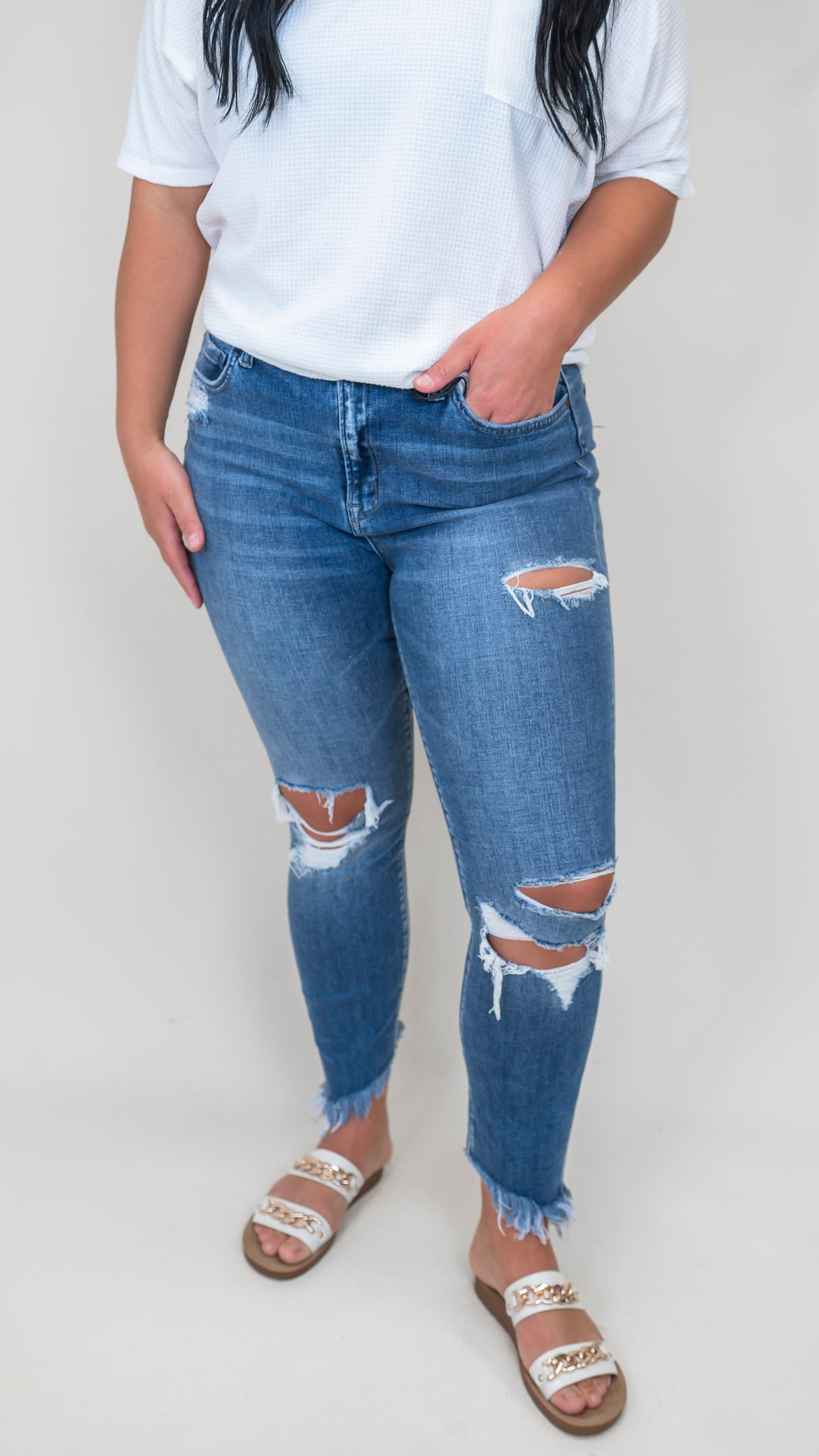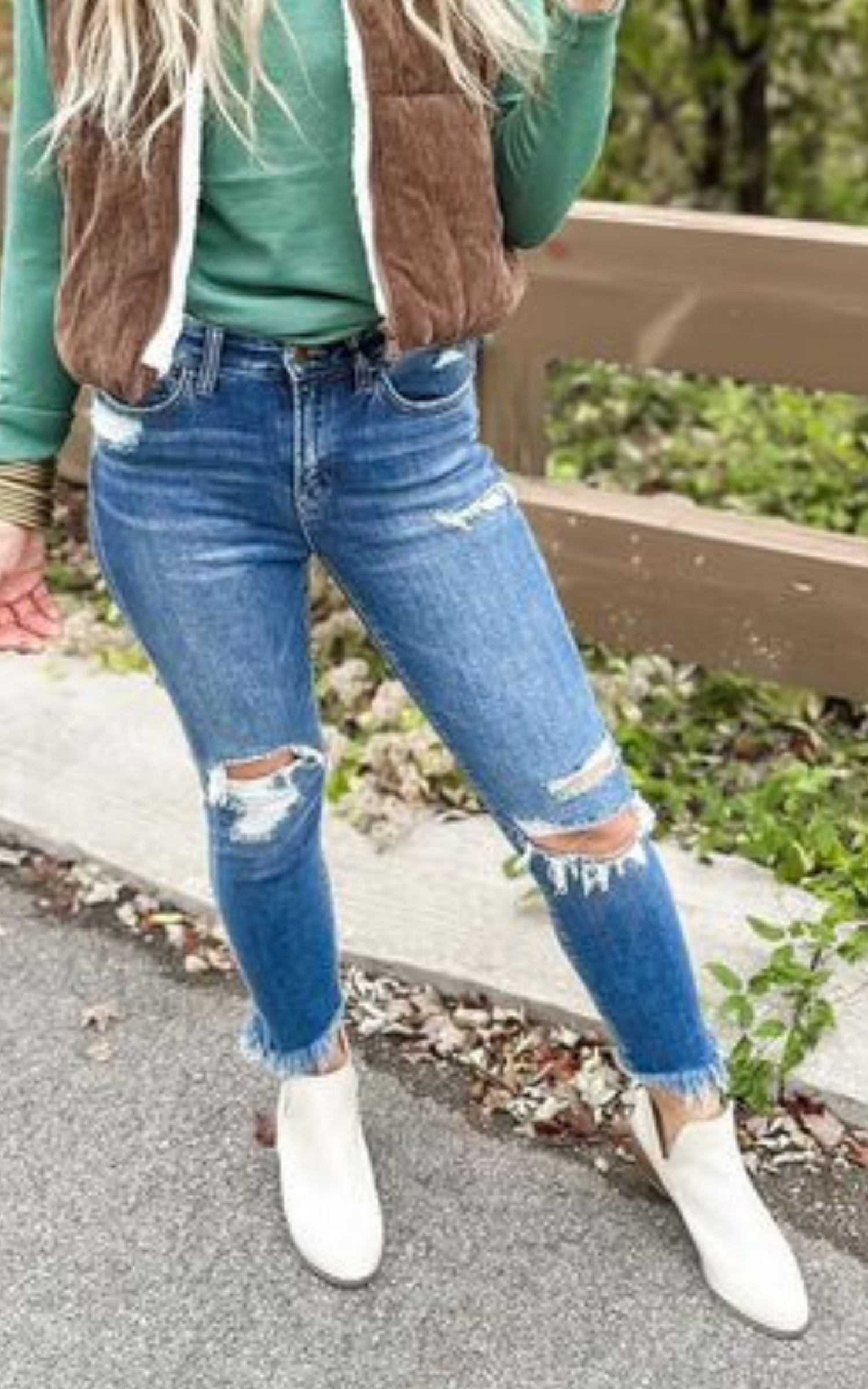 These slightly distressed hem skinnies are so freaking comfy and fit you like second skin. You will definately feel your booty pop in these.