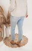 - Our Model, KONA (brunette), wears a size 11/30 and would stick with her size.