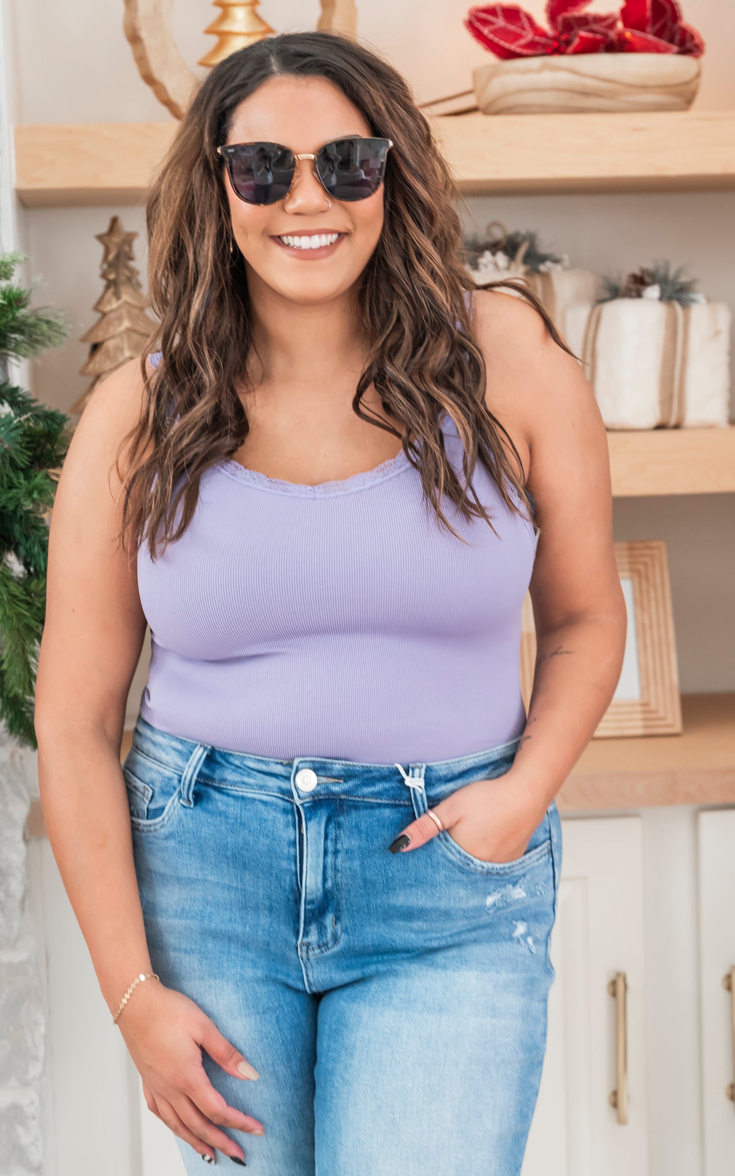 MONO B Ribbed Lace Trim Tank Top - Final Sale