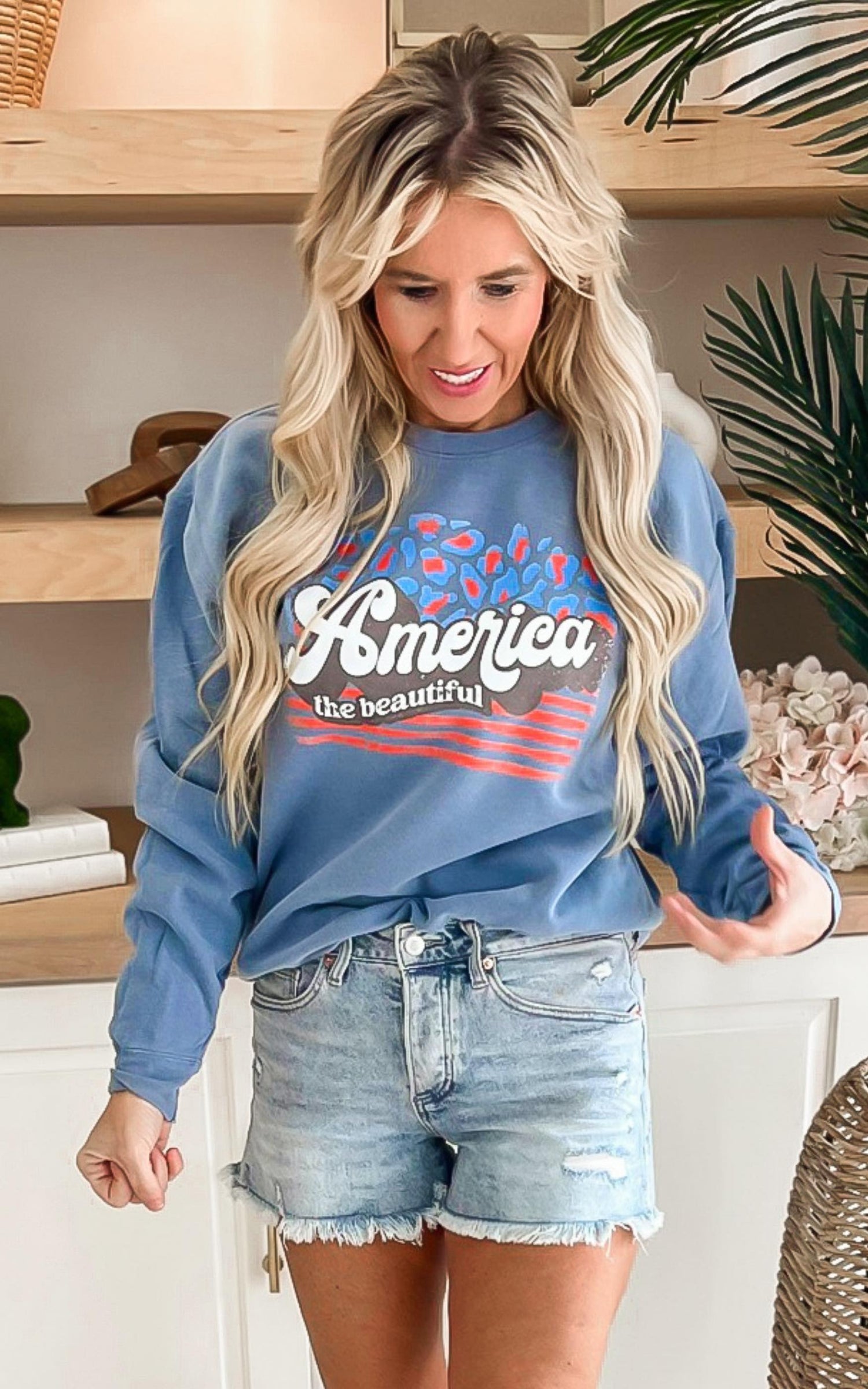 - Our Live Girl, LAKIN (short blond hair) wears a size LARGE, she could size up for a baggier fit