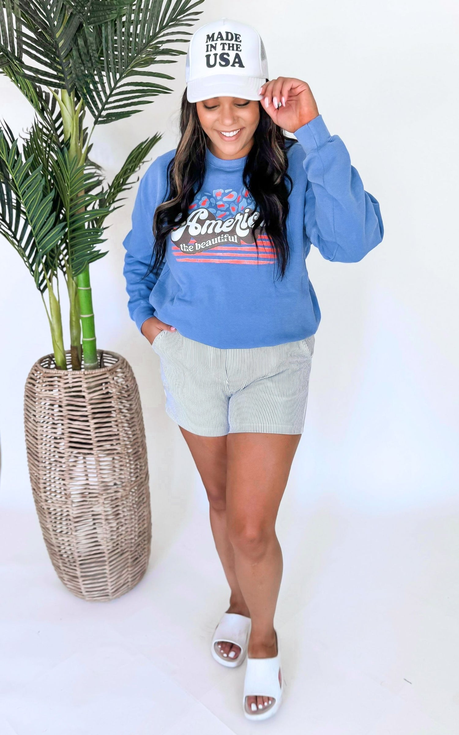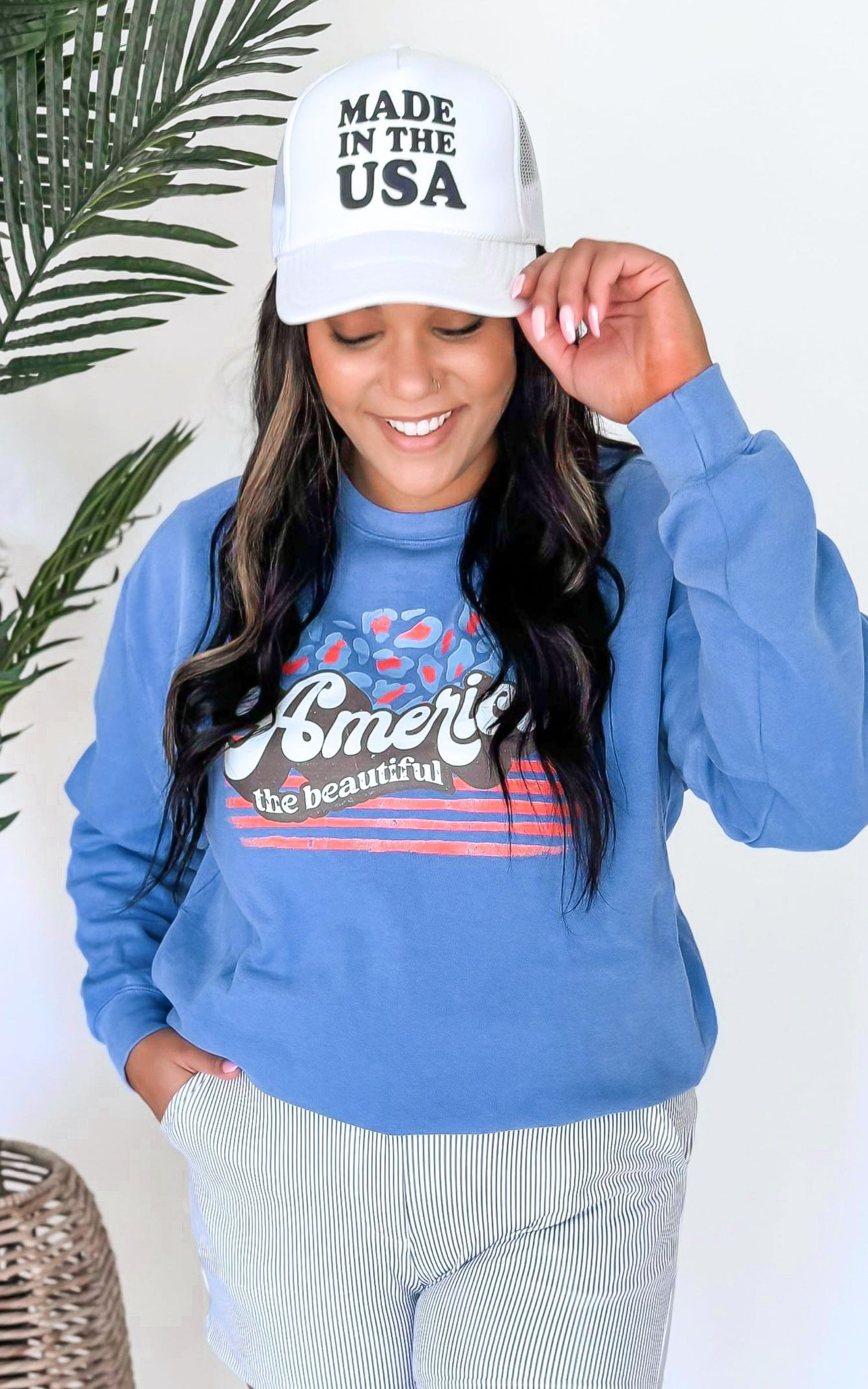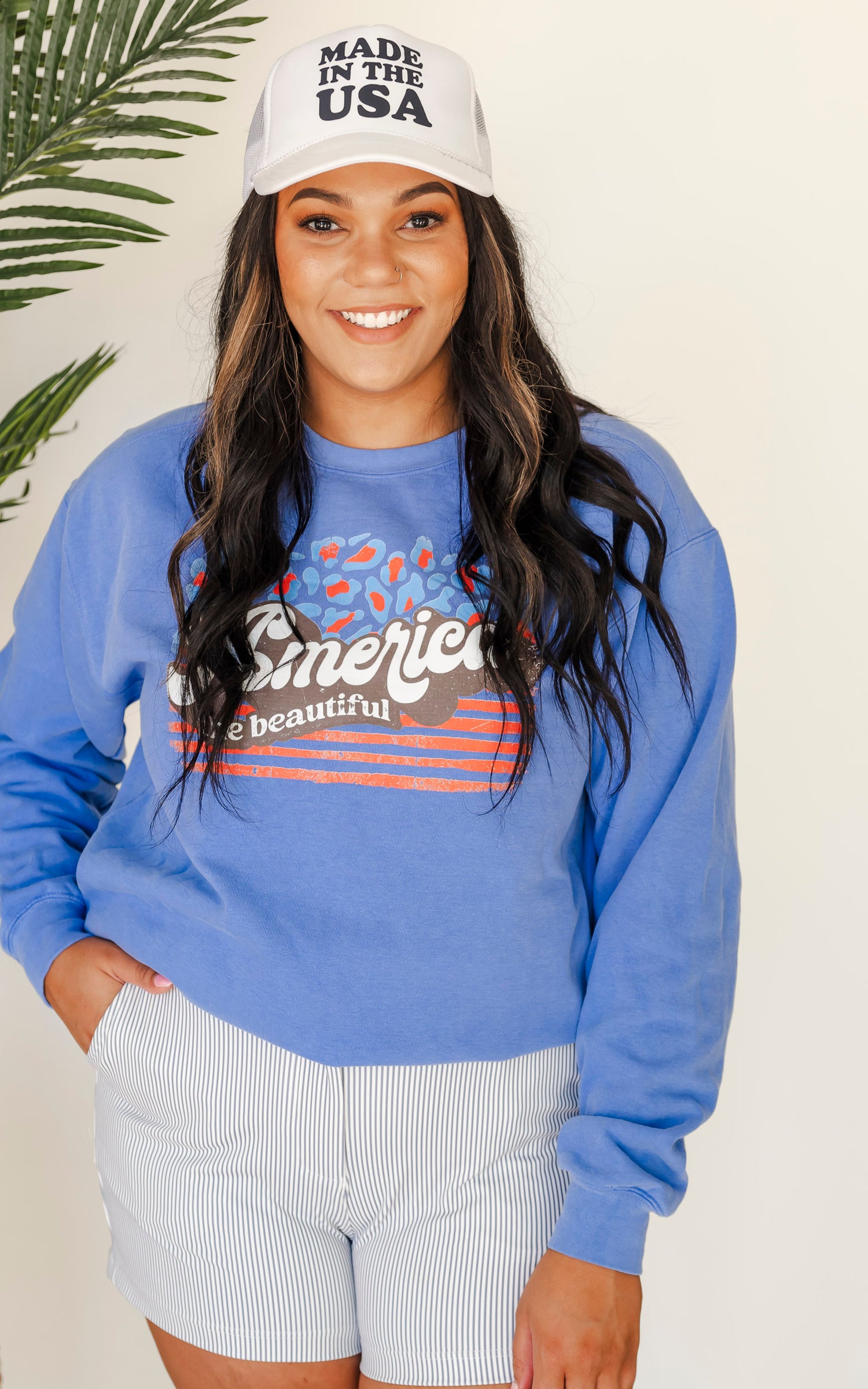 - Our Model, KONA (brunette), wears a size LARGE, she could size up for a baggier fit