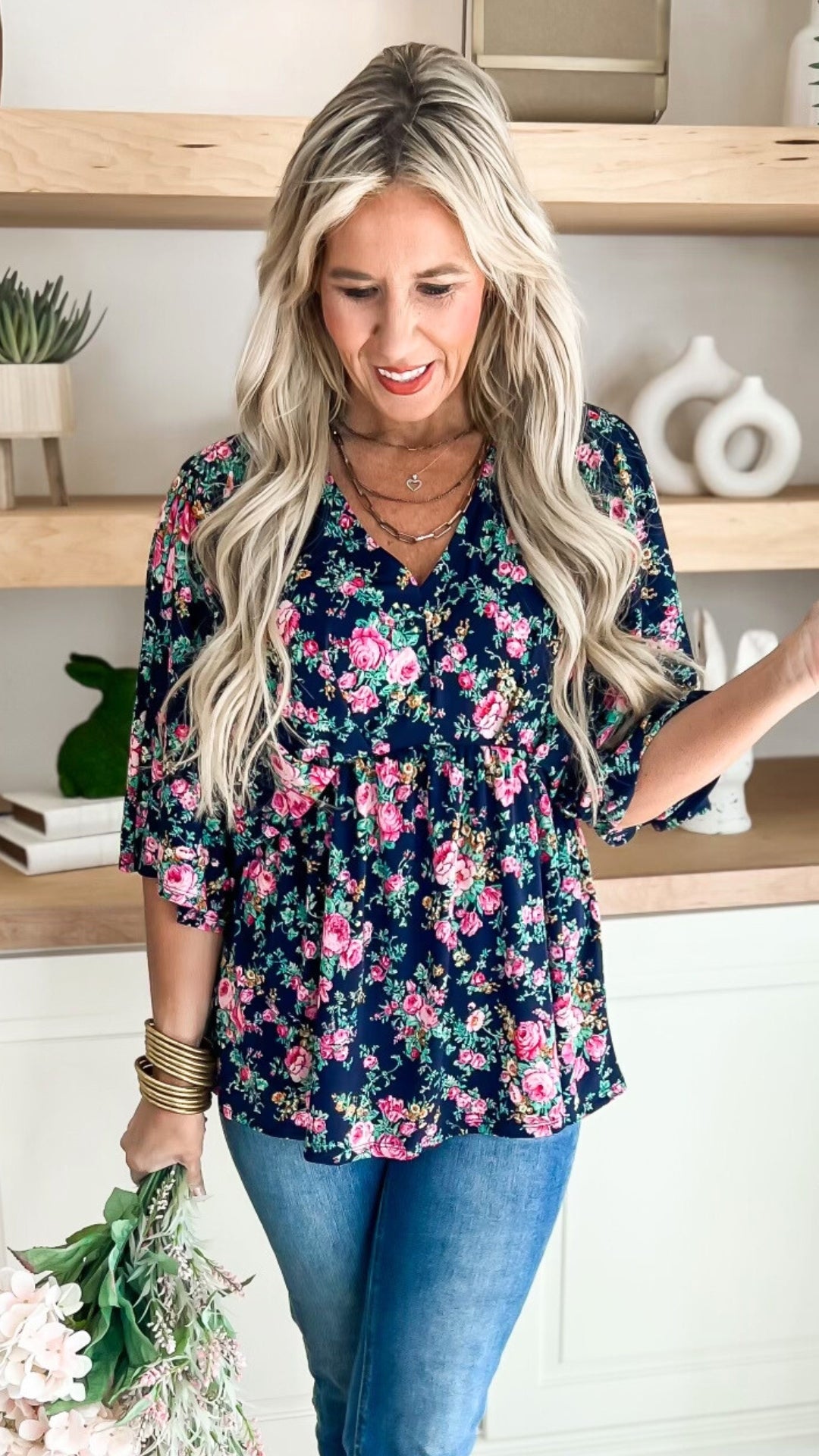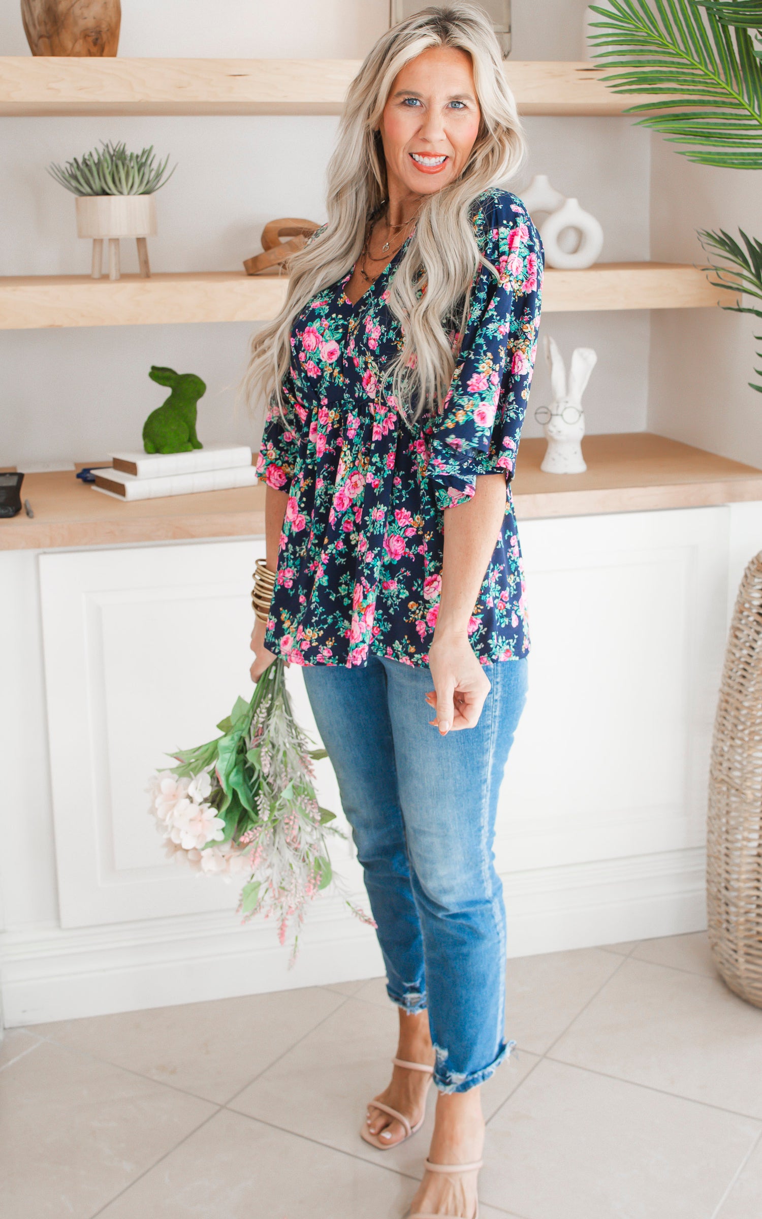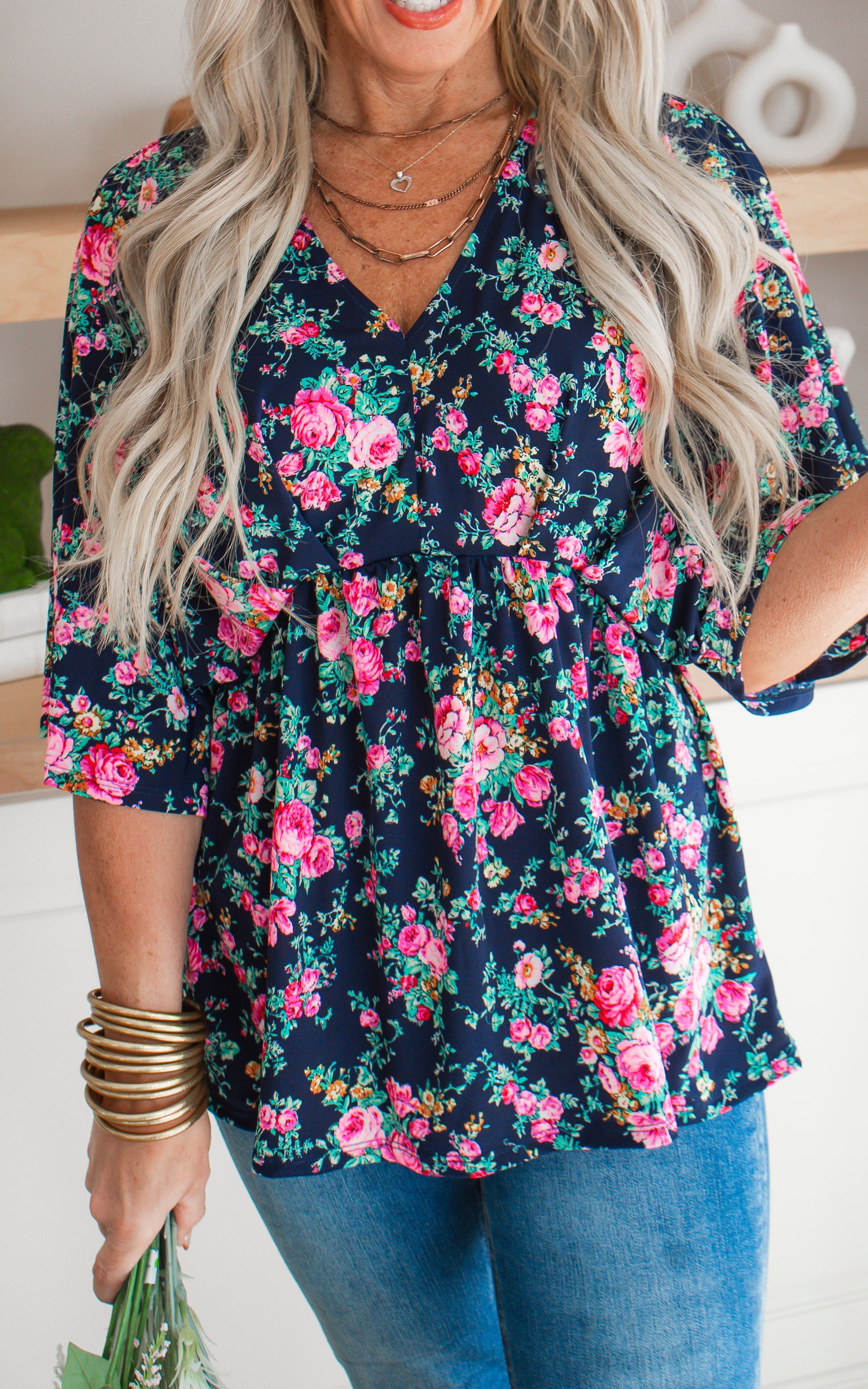 Get ready to bloom in style with our Navy Floral Dolman Sleeve Blouse Top! This top features a unique navy floral pattern and loose, comfortable dolman sleeves for a chic yet relaxed look. Perfect for adding a touch of playfulness to any outfit.