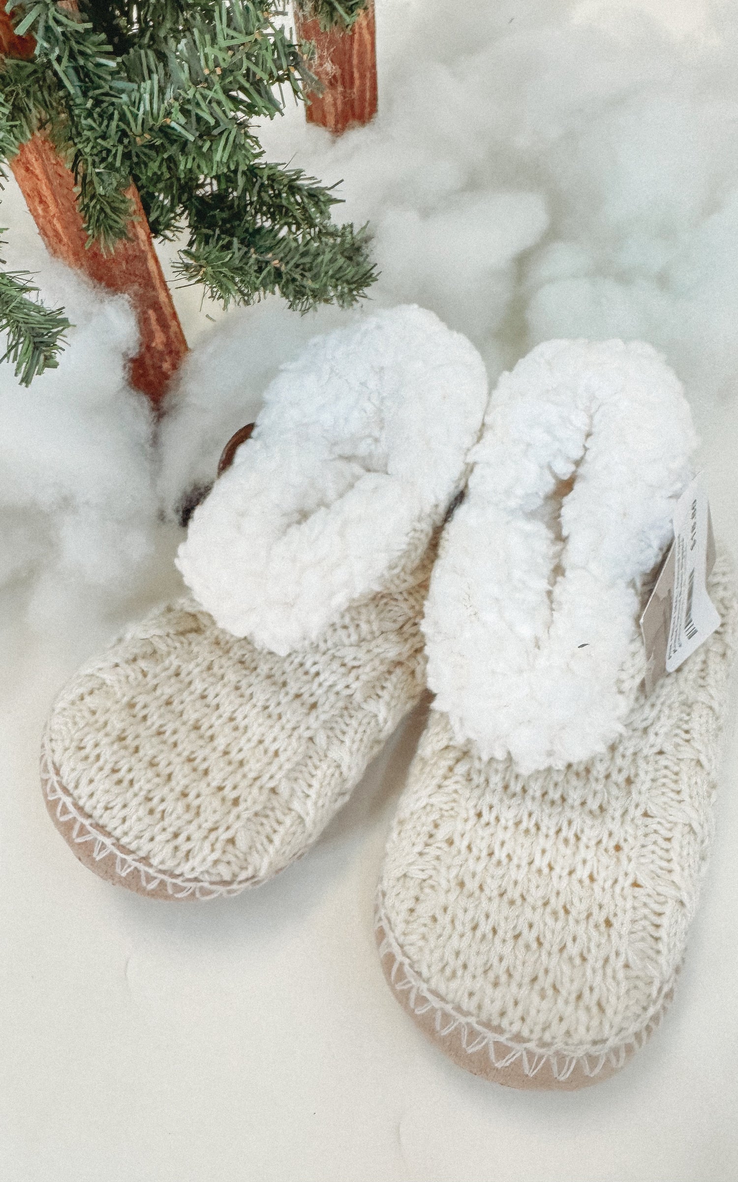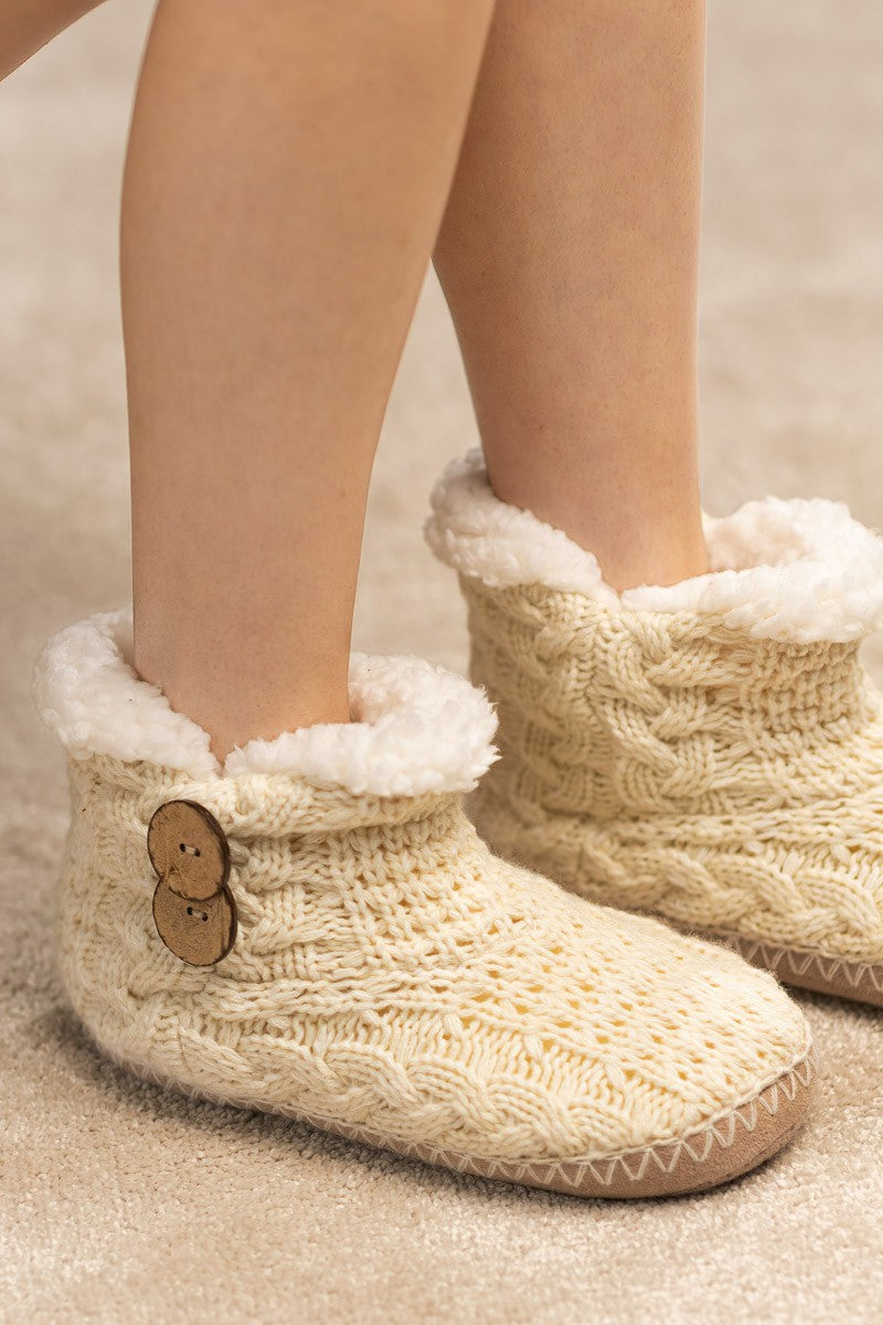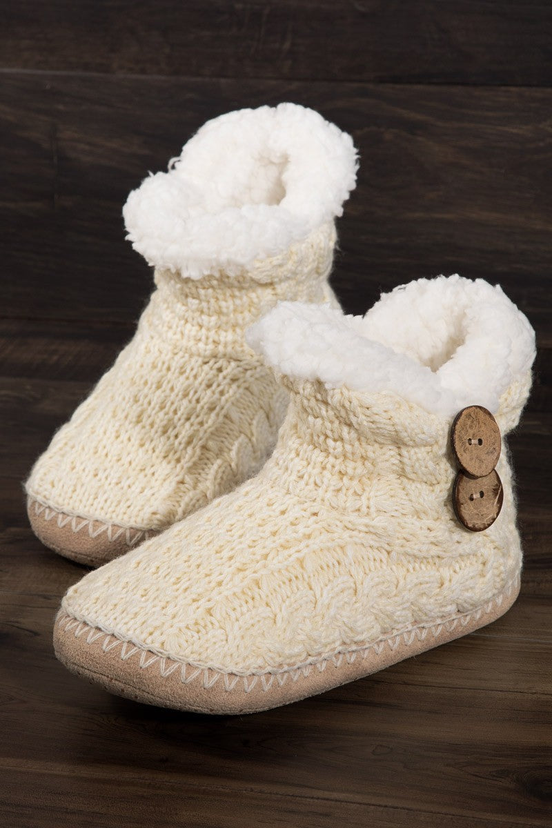 Natural coconut button accented hand knitted slipper boots/socks with comfort non-slip sole and micro fiber sherpa lining