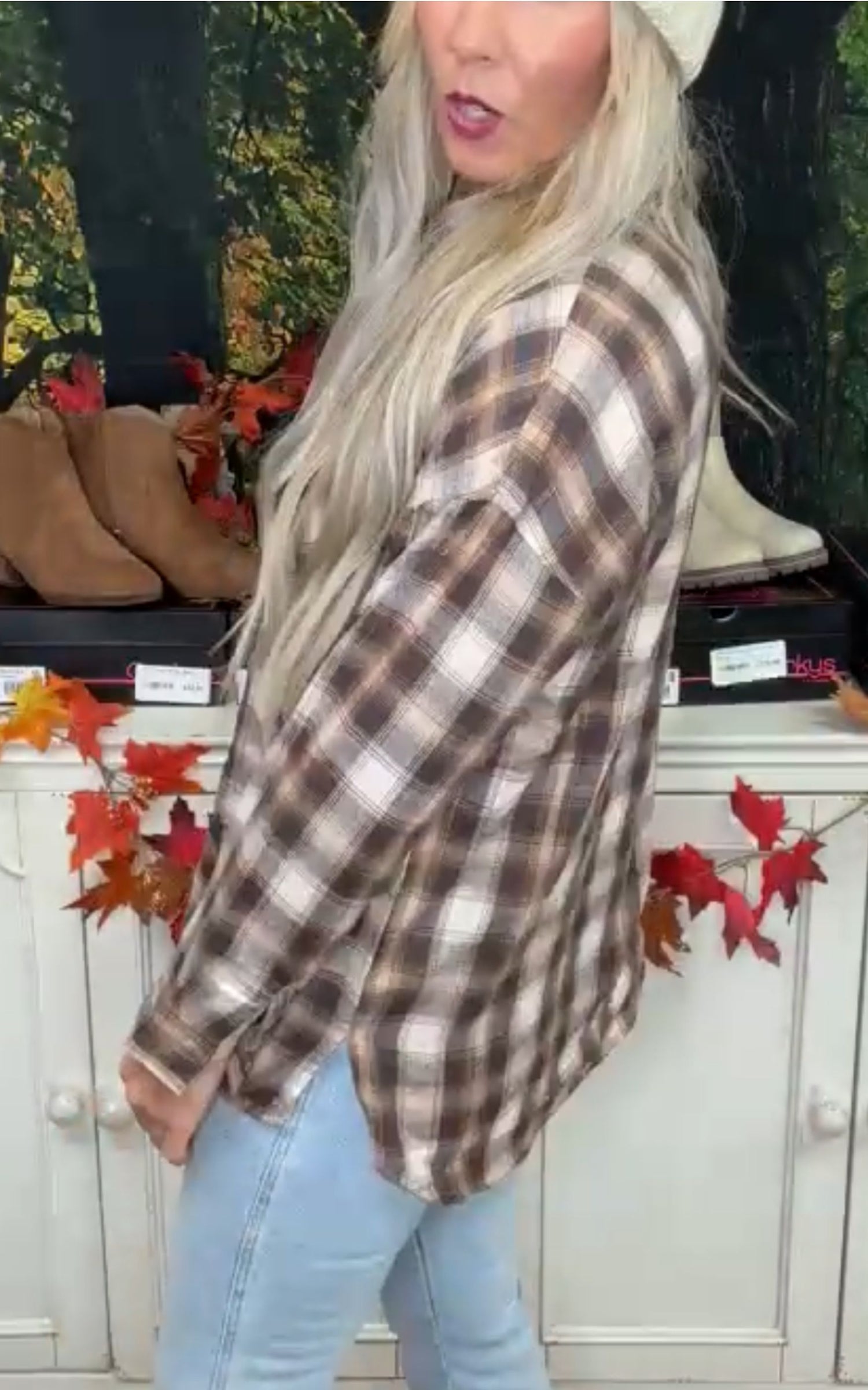 Indulge in cozy fall fashion with our Oversized Caramel Flannel Plaid Top! Made with a soft flannel material, this top features an oversized fit for a comfortable and stylish look. Perfect for layering, this top is sure to keep you warm and effortlessly on-trend.
