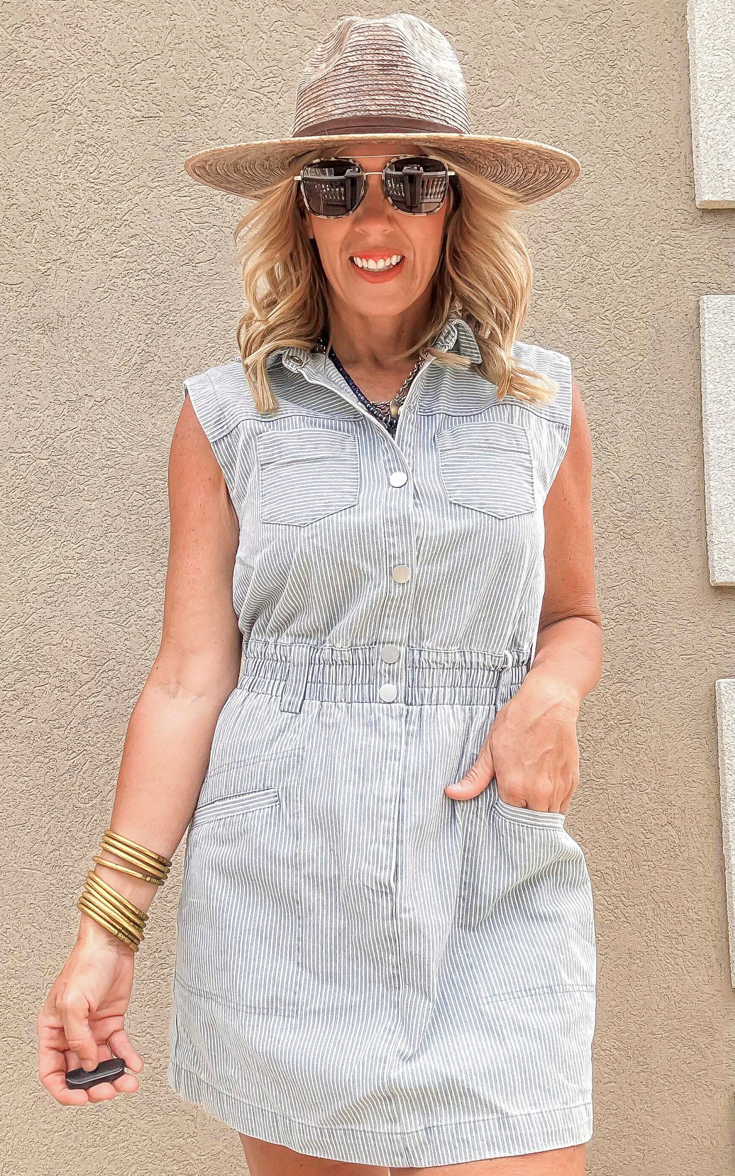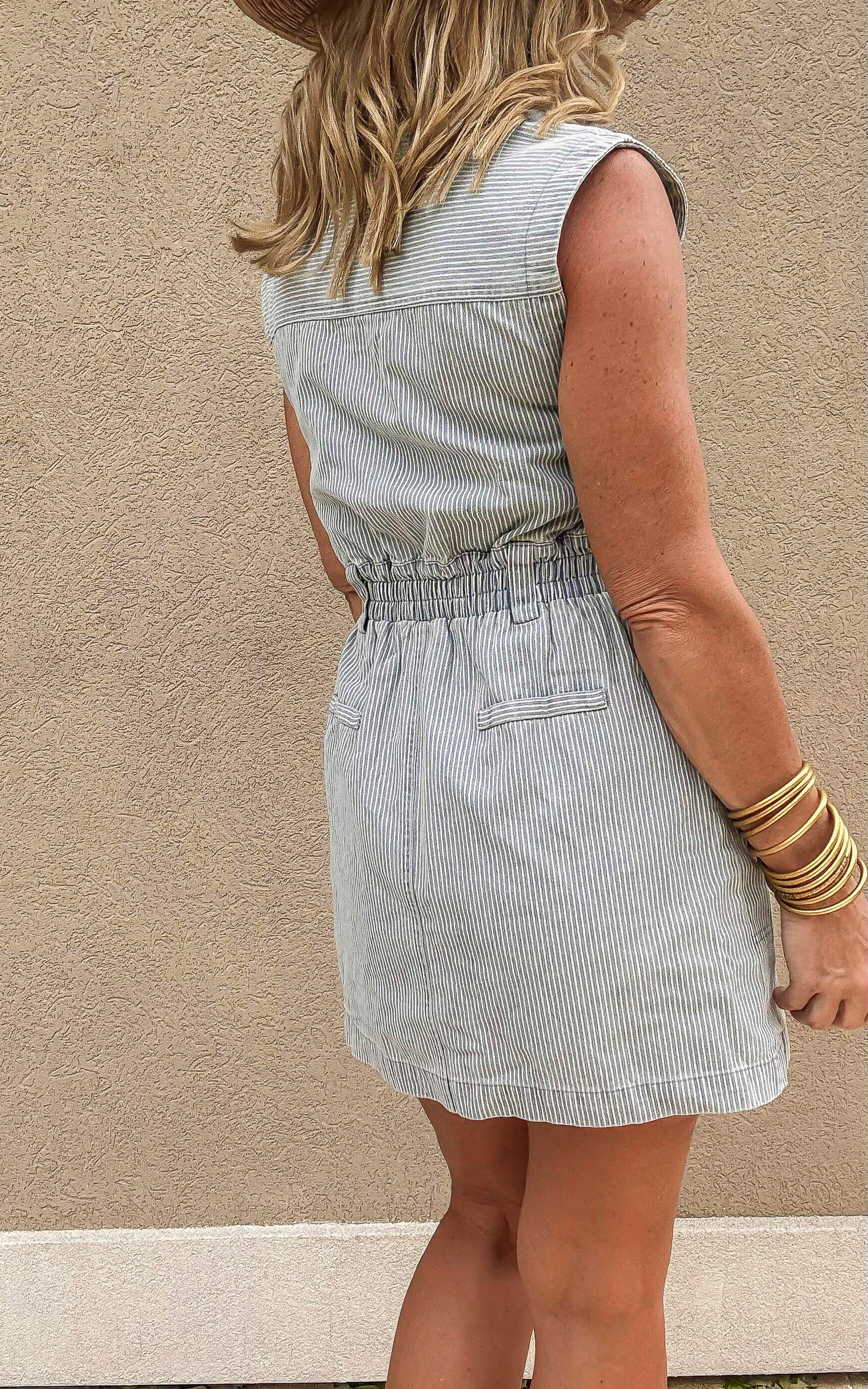 Effortlessly stylish, this washed denim dress features charming patch pockets and a classic stripe pattern. Your new go-to piece for easy, everyday style!
