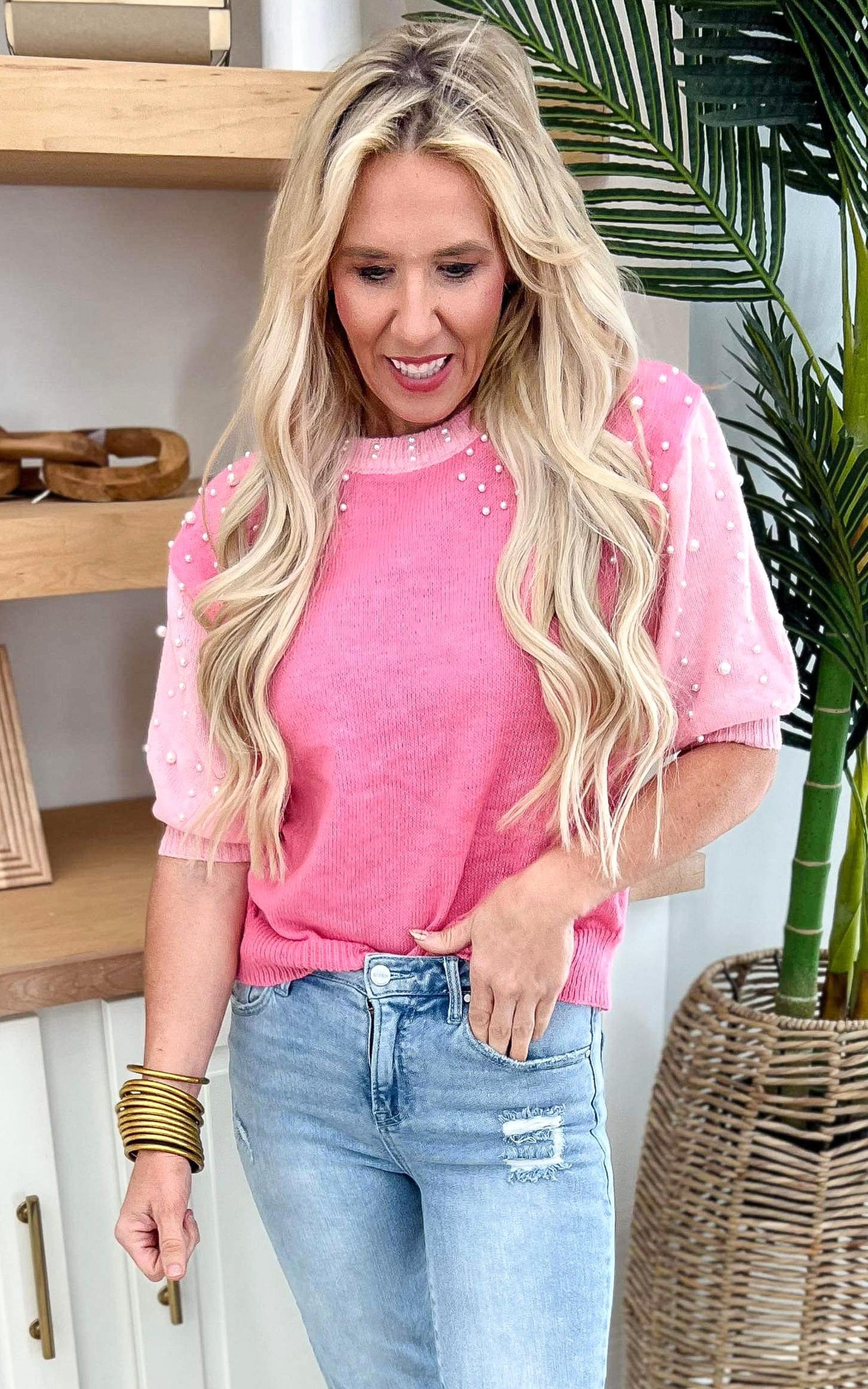 Add a touch of whimsy to your wardrobe with our Pearl Beaded Short Sleeve Sweater Top. Featuring delicate beading and a playful color block design in pink and blush. Elevate any outfit with this quirky and stylish top. Your friends will be asking, 'Where did you get that?"