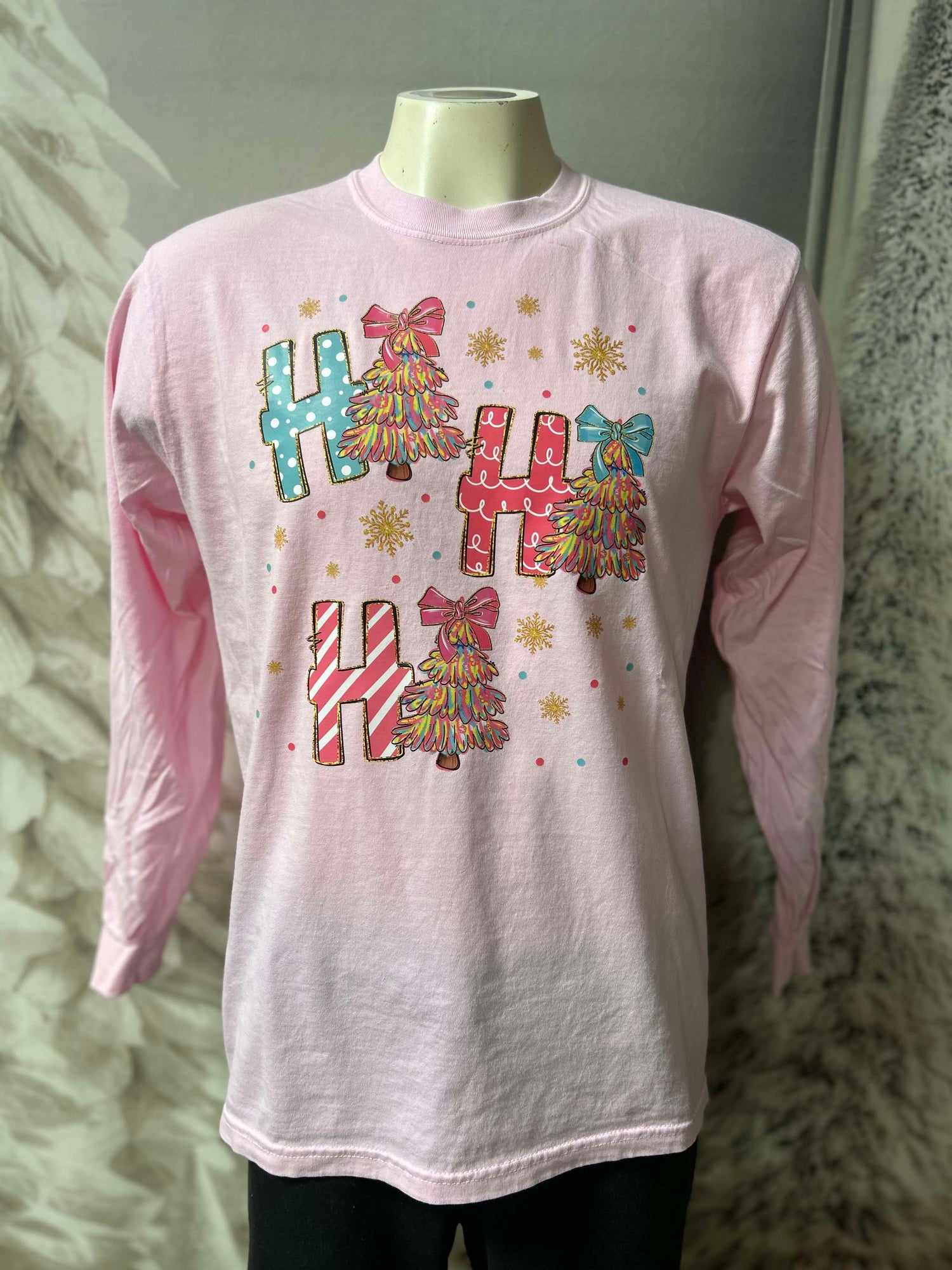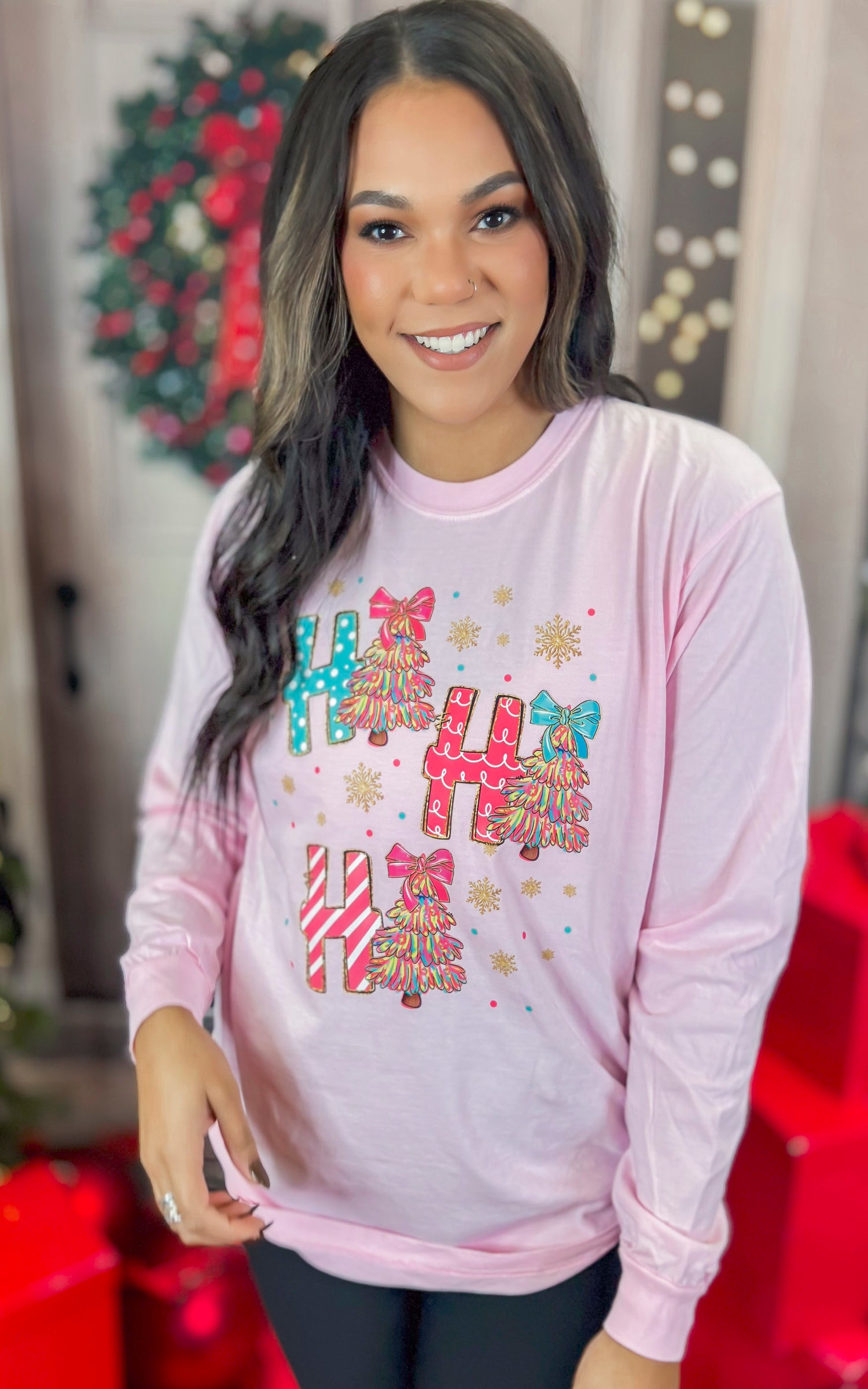 Pink HO HO HO Garment Dyed Long Sleeve Graphic Top