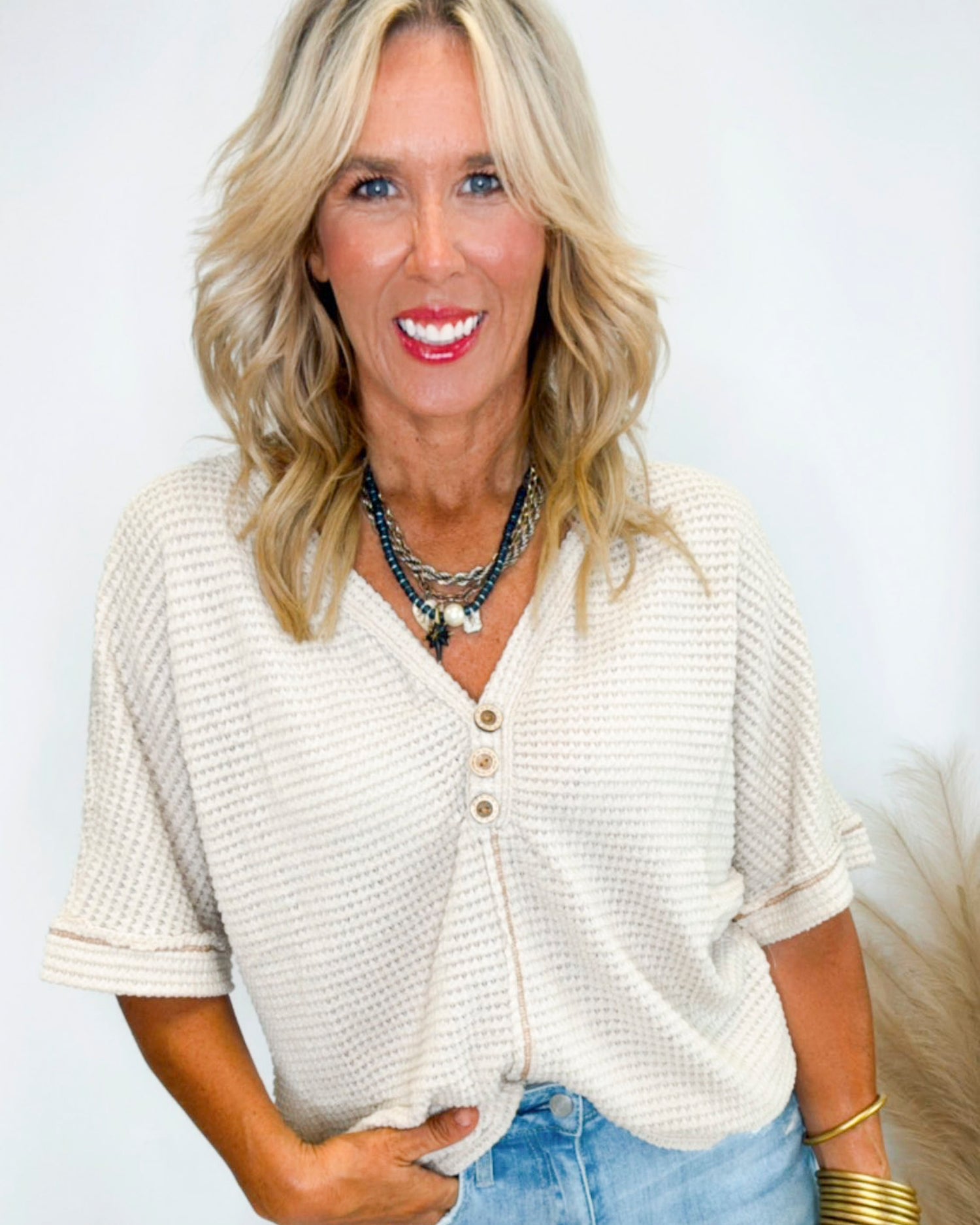 Cozy meets cute in this Popcorn Waffle Knit Top! Its textured waffle knit adds a fun, bouncy feel that’s perfect for layering or wearing solo. Lightweight yet warm, it’s your new go-to for playful comfort all day long.