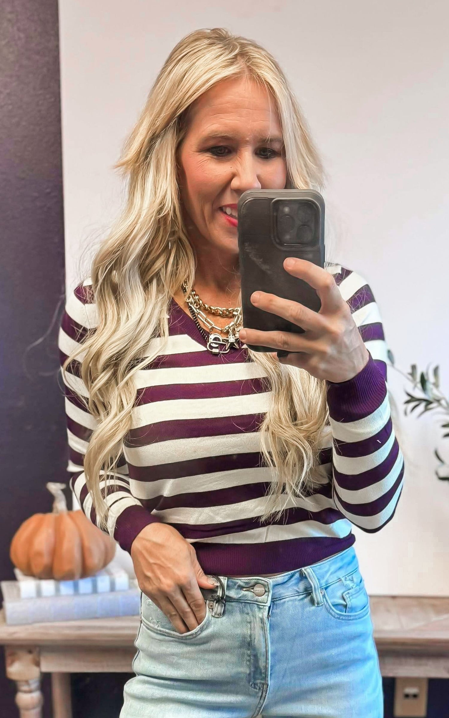 Elevate your style with our Purple Striped V-Neck Sweater! Made with high-quality materials, this sweater features a classic v-neck design and bold purple stripes. Perfect for any occasion, this sweater will keep you warm and stylish.