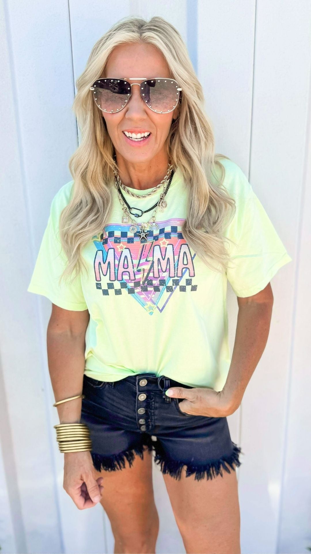 Get ready to make a statement with our Checkered Lightning Mama Graphic T-shirt! This garment-dyed tee features a bold, lightning design that is sure to turn heads. Perfect for all the mamas out there who like to add a little edge to their wardrobe.