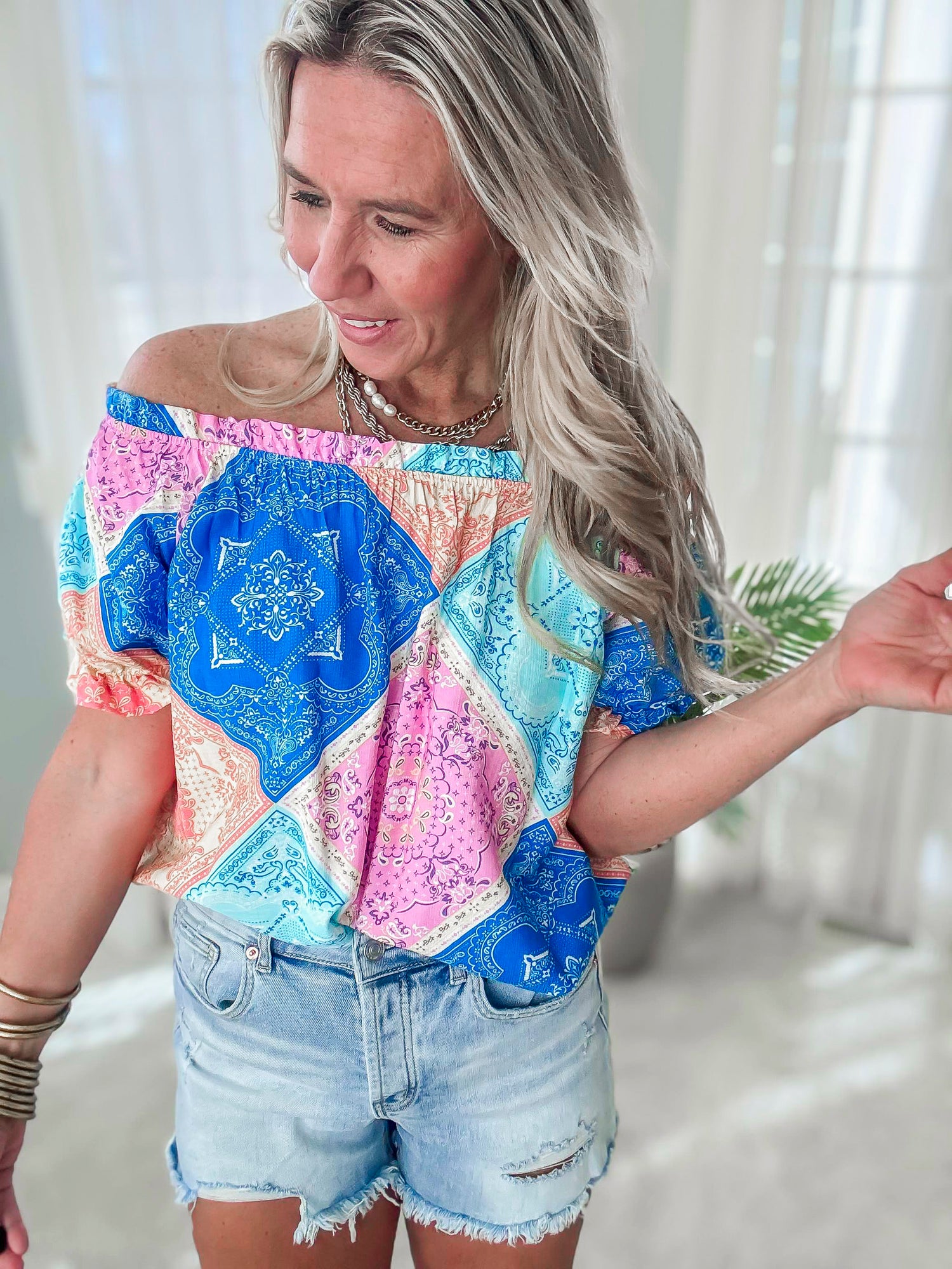 Get ready to make a stylish statement with our Royal Aqua Tribal Off the Shoulder Top. Featuring a trendy off-the-shoulder design and a striking tribal pattern, this top will surely turn heads. Upgrade your wardrobe with this must-have top.