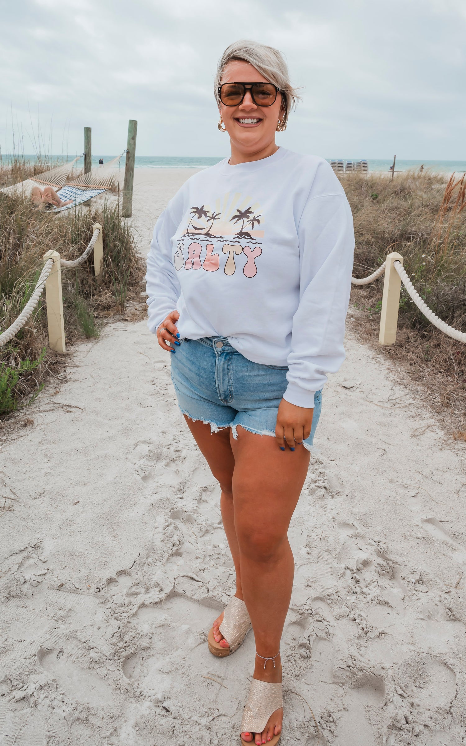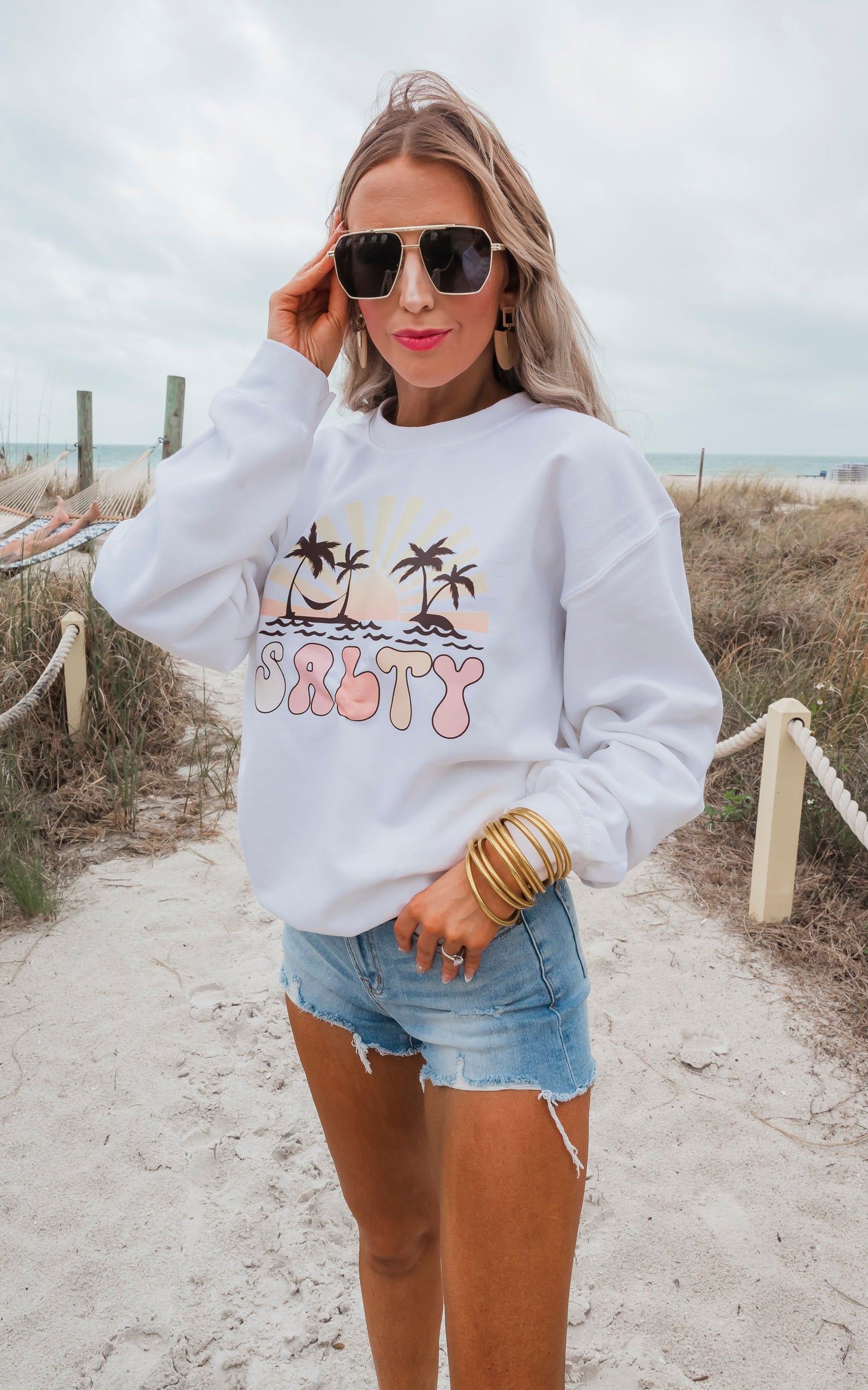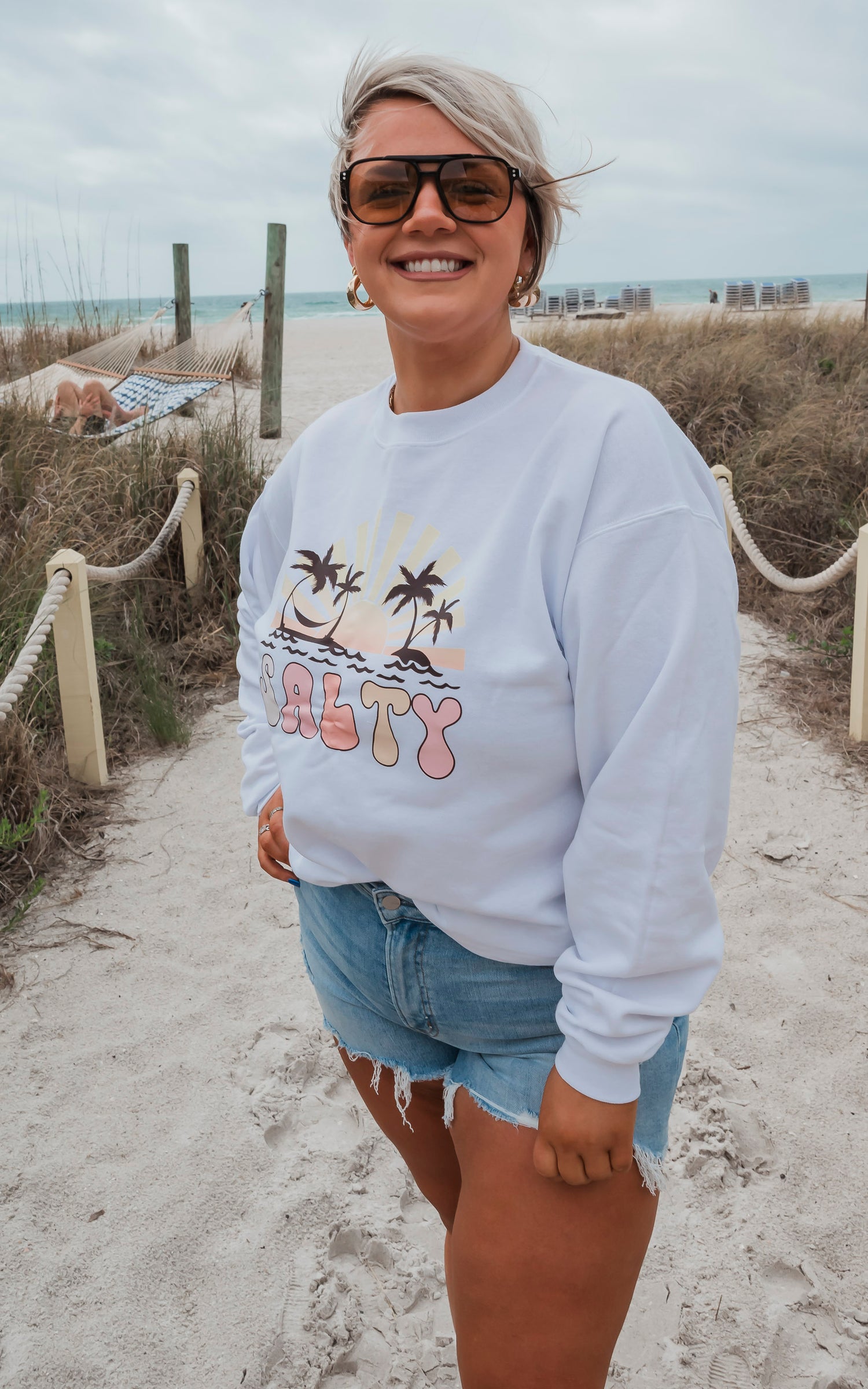 Get salty in style with our Salty Graphic Crewneck Sweatshirt! Perfect for your beach vacation, this crewneck features a fun and quirky design that will make you stand out. Made for those who don't take themselves too seriously, embrace the beachy vibes and add a playful touch to your wardrobe.*