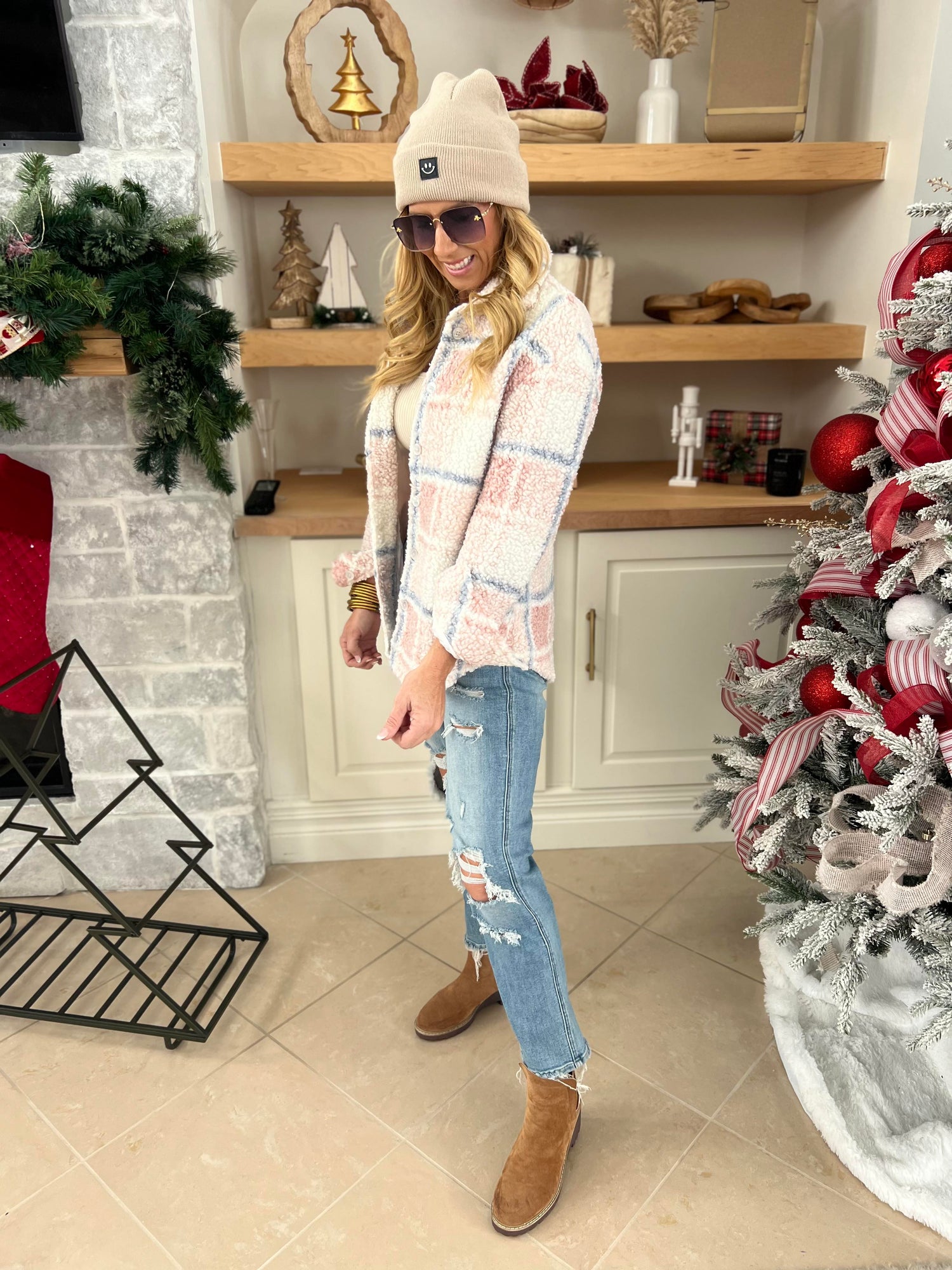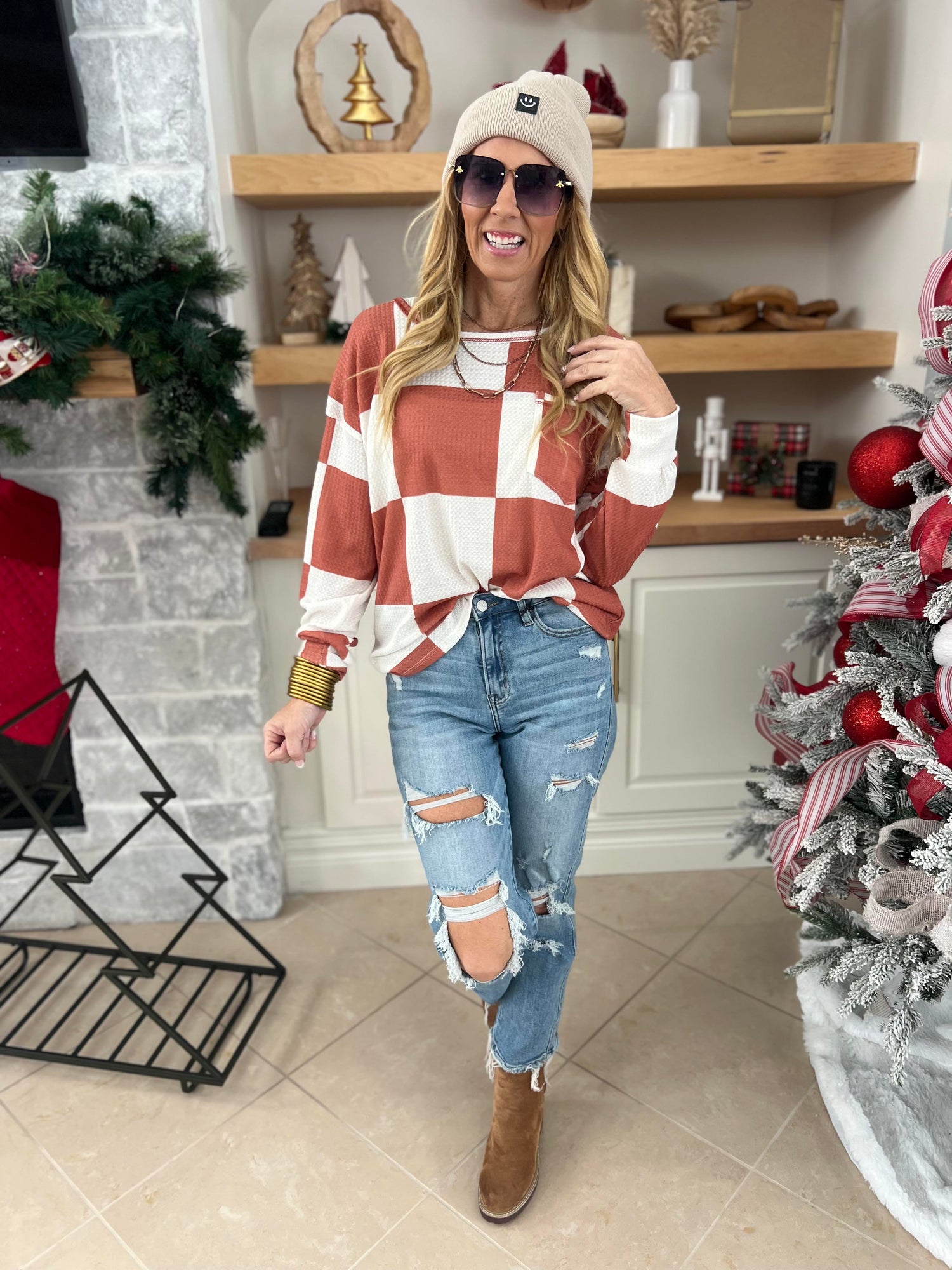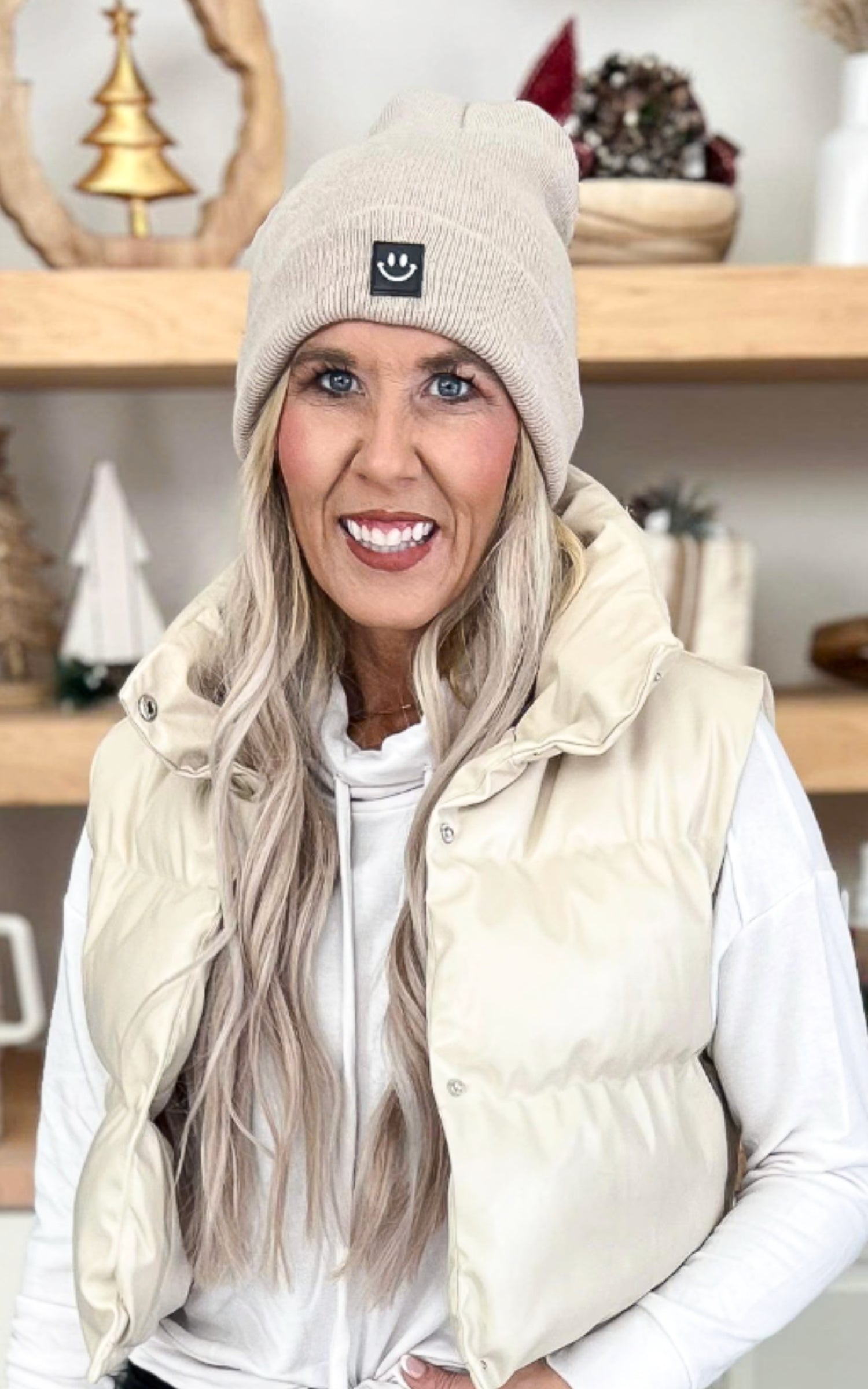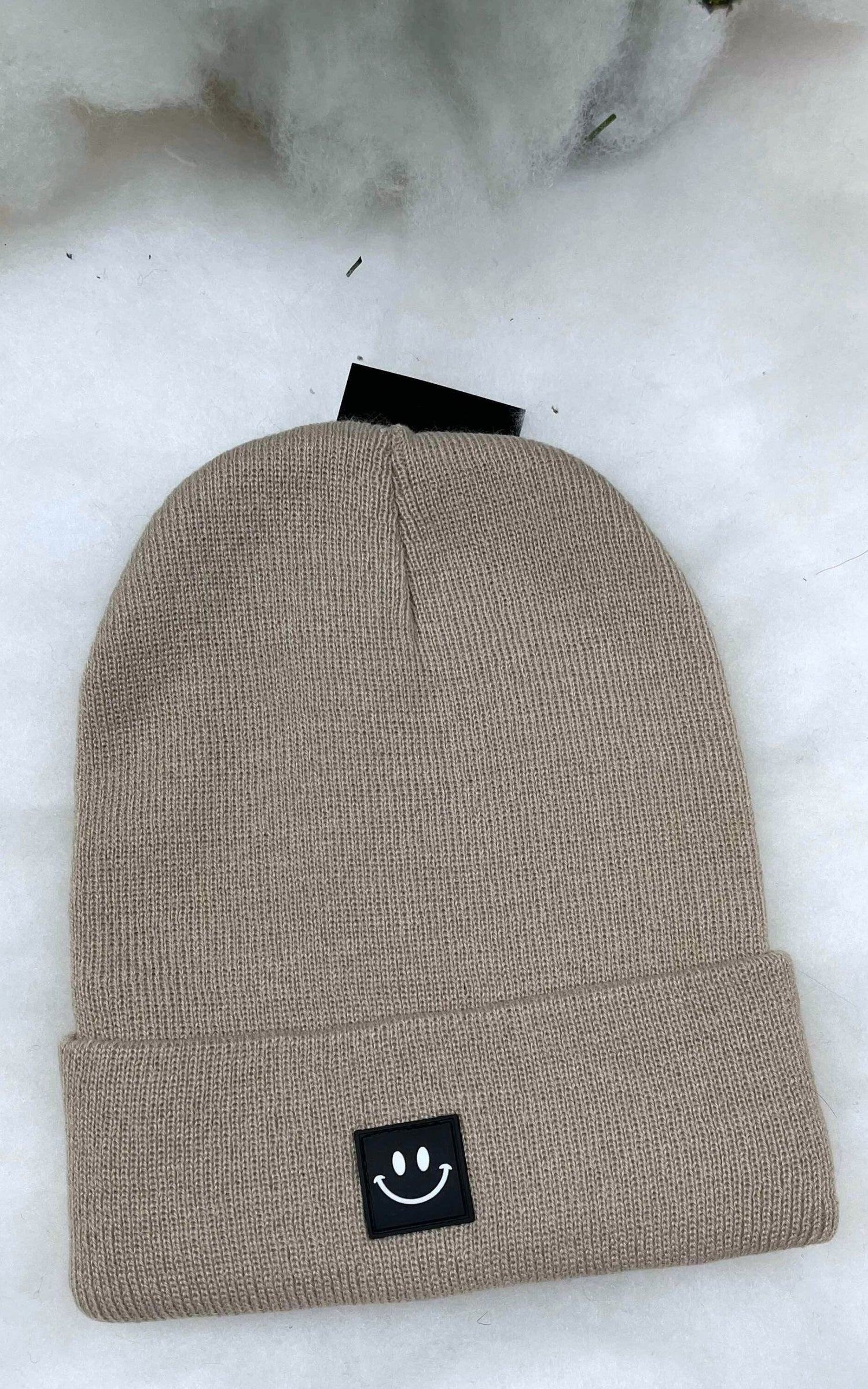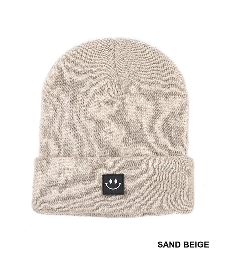 Sand Beige Smiley Face Patch Beanie ** - Final Sale
