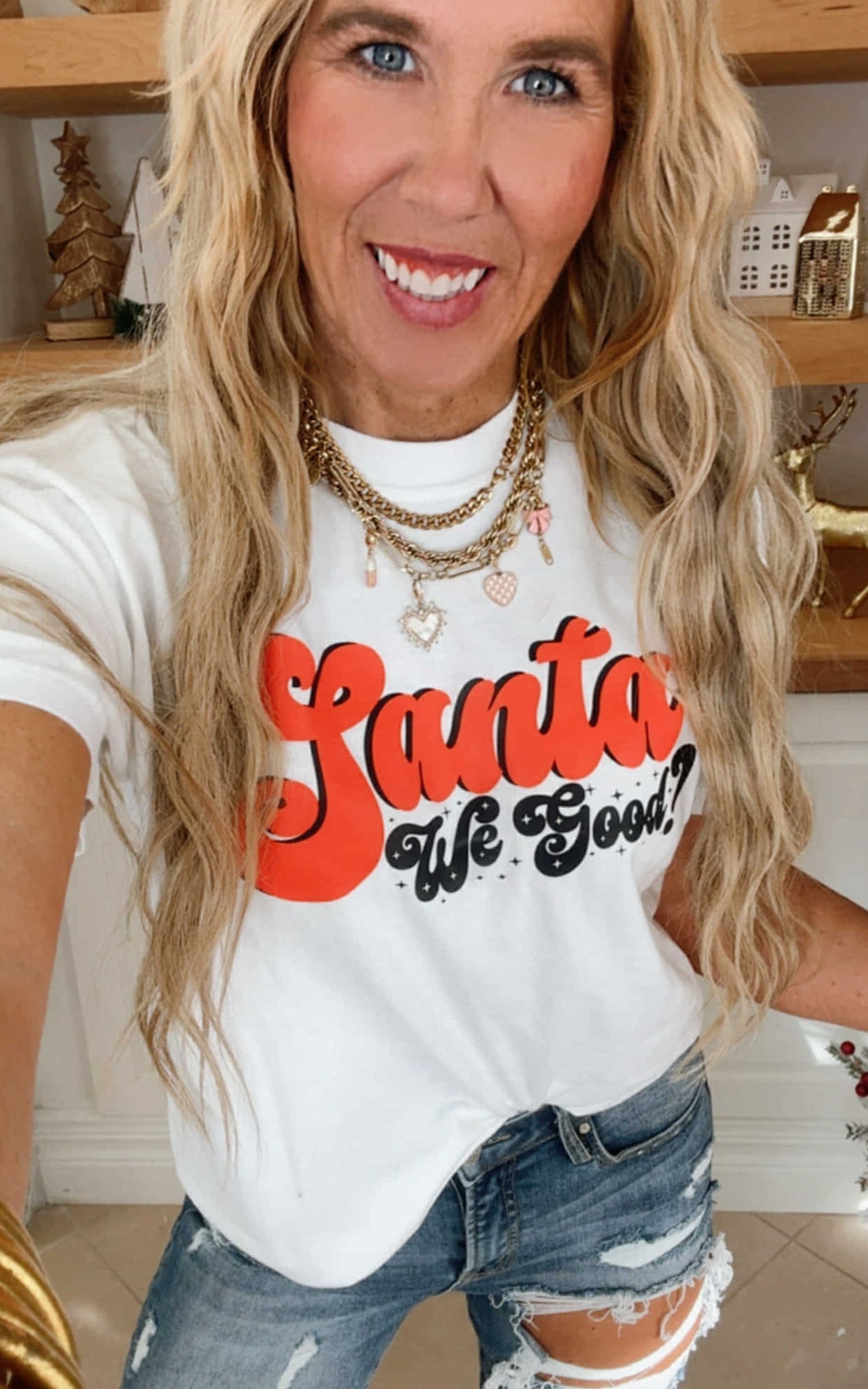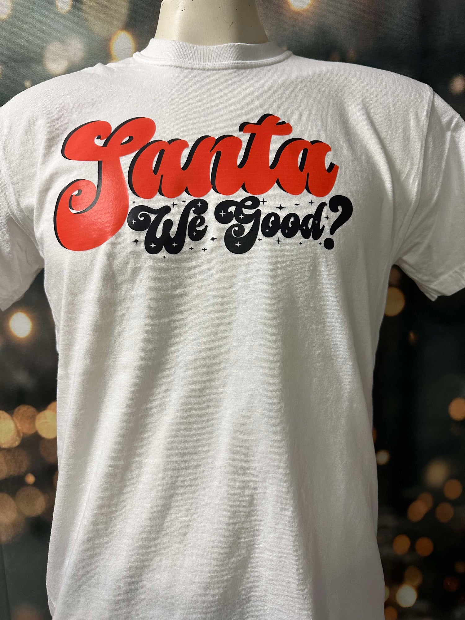 Get into the holiday spirit with our Santa We Good T-shirt! This festive garment is dyed with care for a unique look and features a fun graphic of jolly old Saint Nick. Spread joy and good cheer this holiday season with this must-have addition to your wardrobe.