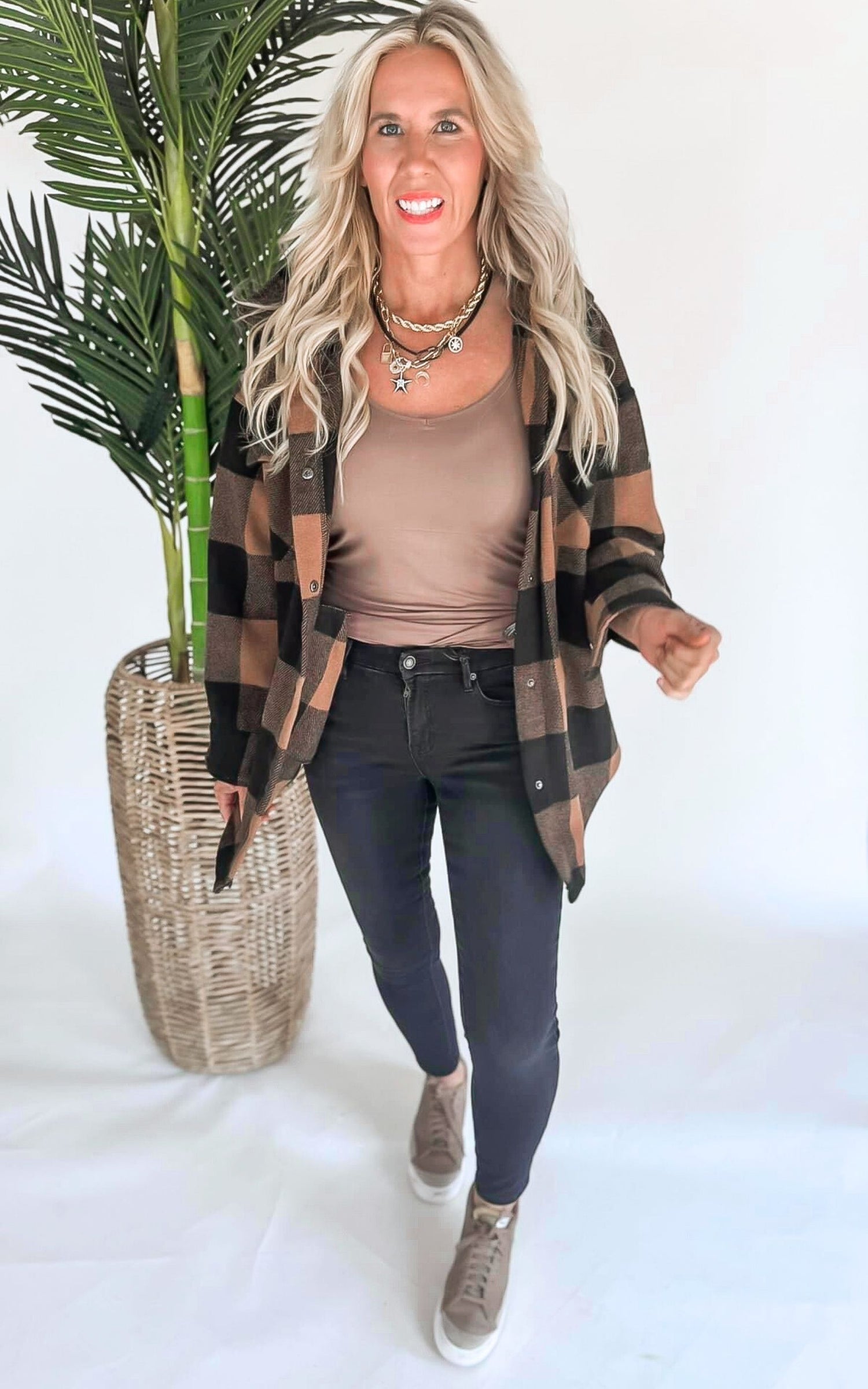 - Our Model, KONA (brunette), wears a size LARGE and would stick with her size.