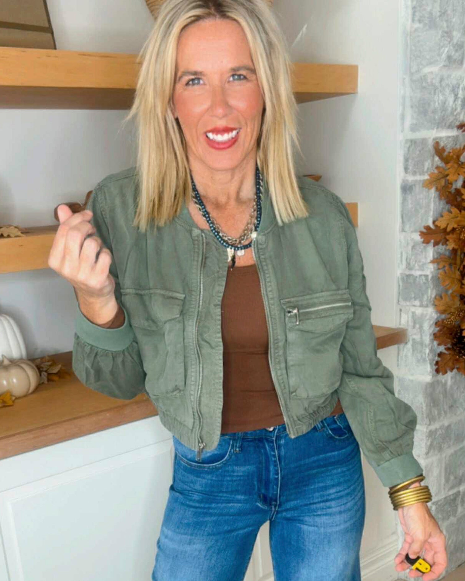 Meet your new season-to-season staple—the Season Shift Utility Bomber Jacket by RISEN. Lightweight yet statement-making, this jacket is designed to layer effortlessly and keep your look chic and functional no matter the weather.