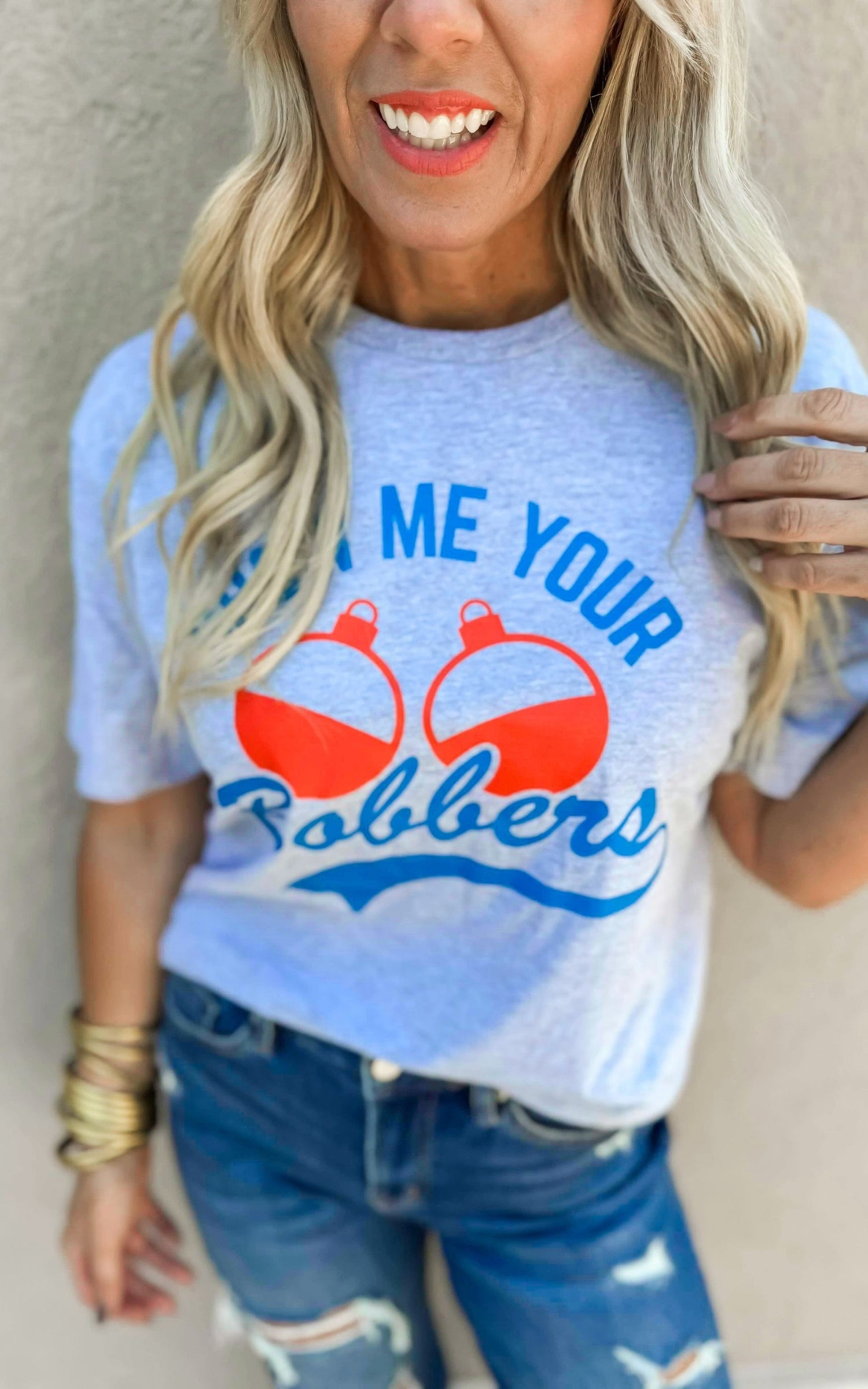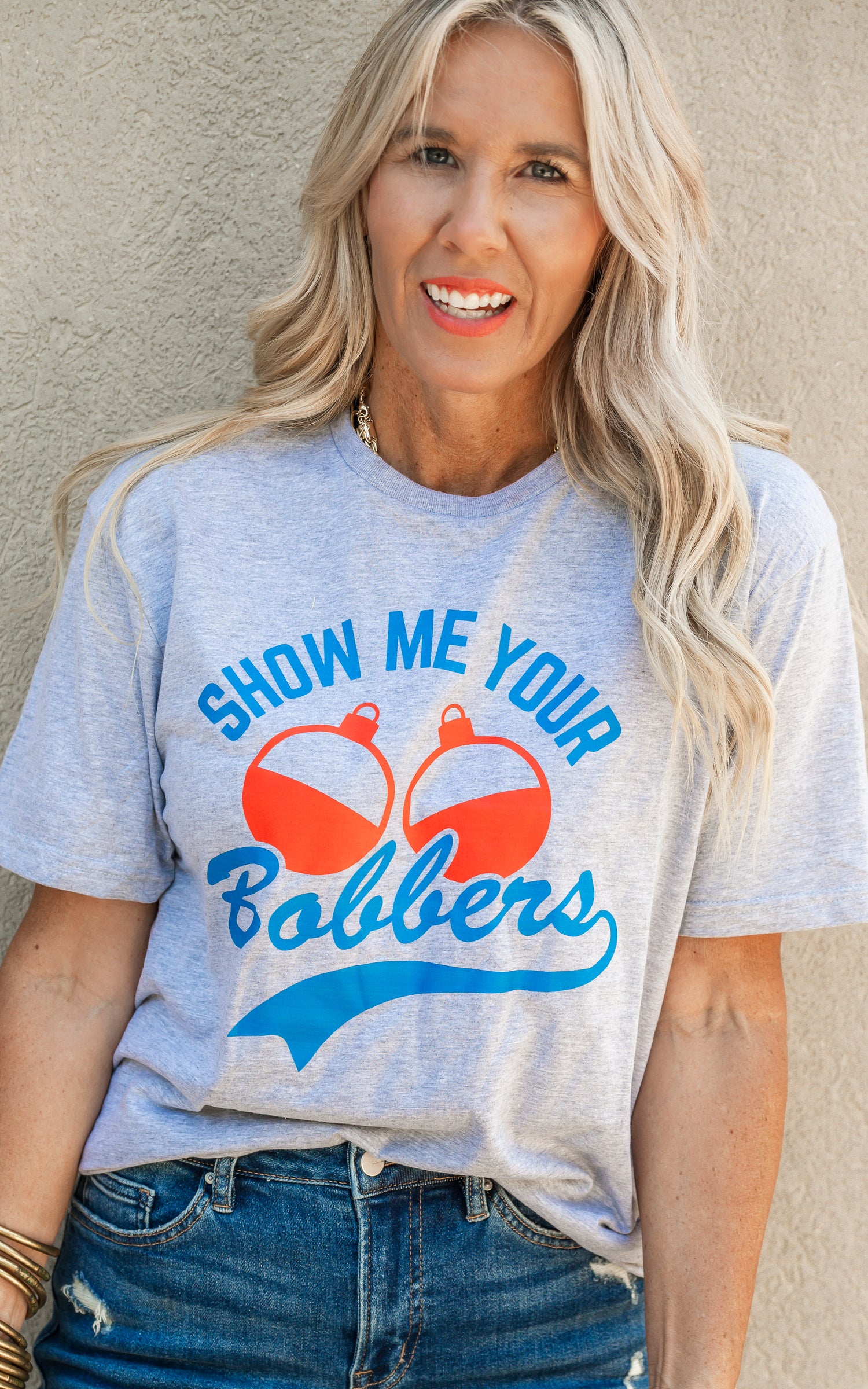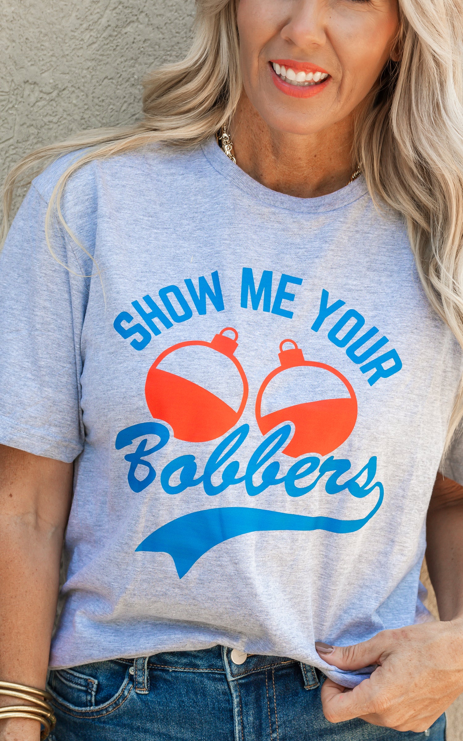 Reel in laughs with this catchy graphic tee! Show off your love for fishing (and a little innuendo) with the Show Me Your Bobbers T-shirt. Made from soft material for all-day comfort. Perfect for your next fishing trip or everyday wear. (Fish not included.)