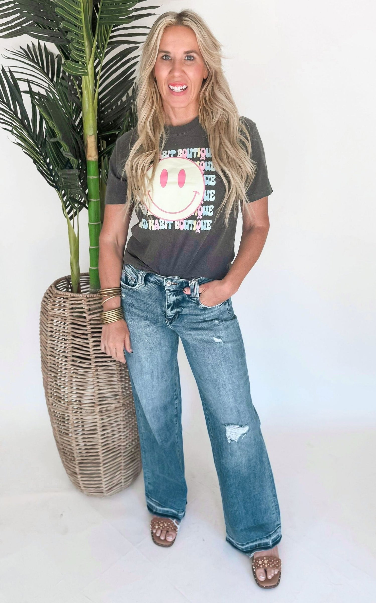 Turn that frown upside down with our Smile Bad Habit Boutique Garment Dyed Graphic T-shirt. Made with soft, comfortable fabric and adorned with a playful graphic, this t-shirt is the perfect addition to your wardrobe. Show off your quirky style and spread some cheer wherever you go!