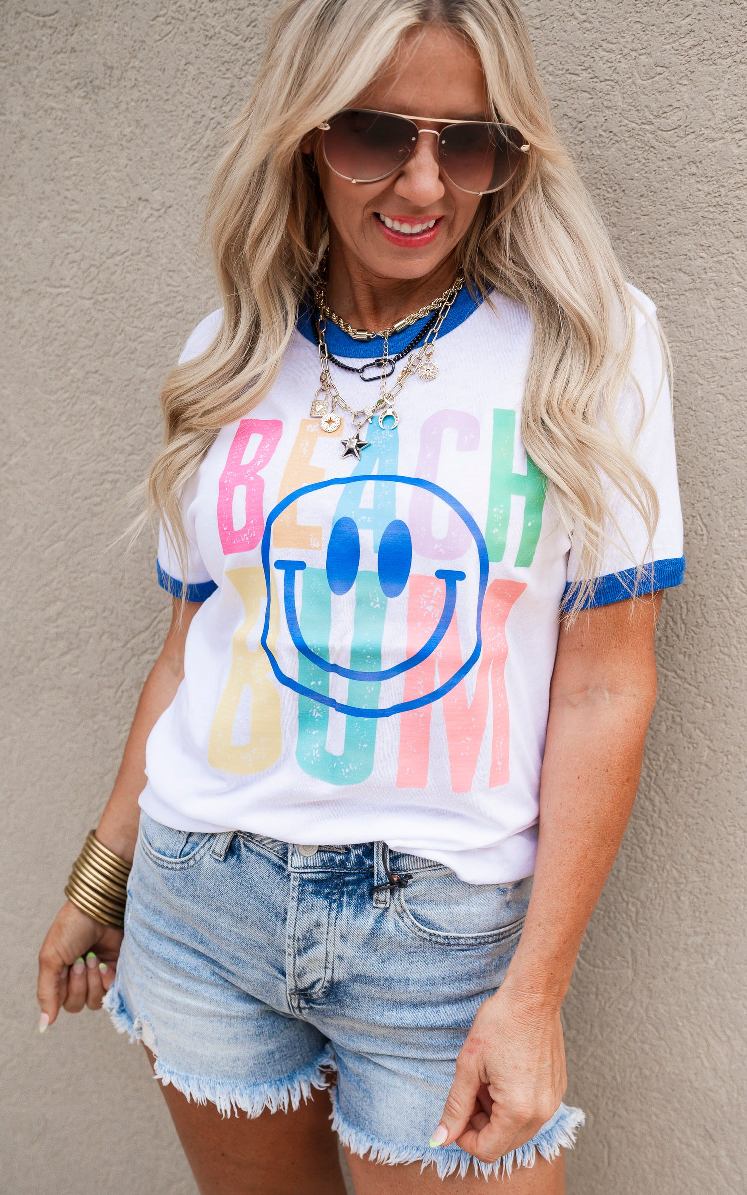 Get ready to hit the beach in style with our Smile Beach Bum Ringer Graphic T-shirt! Featuring a fun and playful design, this shirt is sure to bring a smile to your face. Made from soft and comfortable material, you'll be feeling cool and carefree all day long. So grab one for yourself and spread those happy vibes!