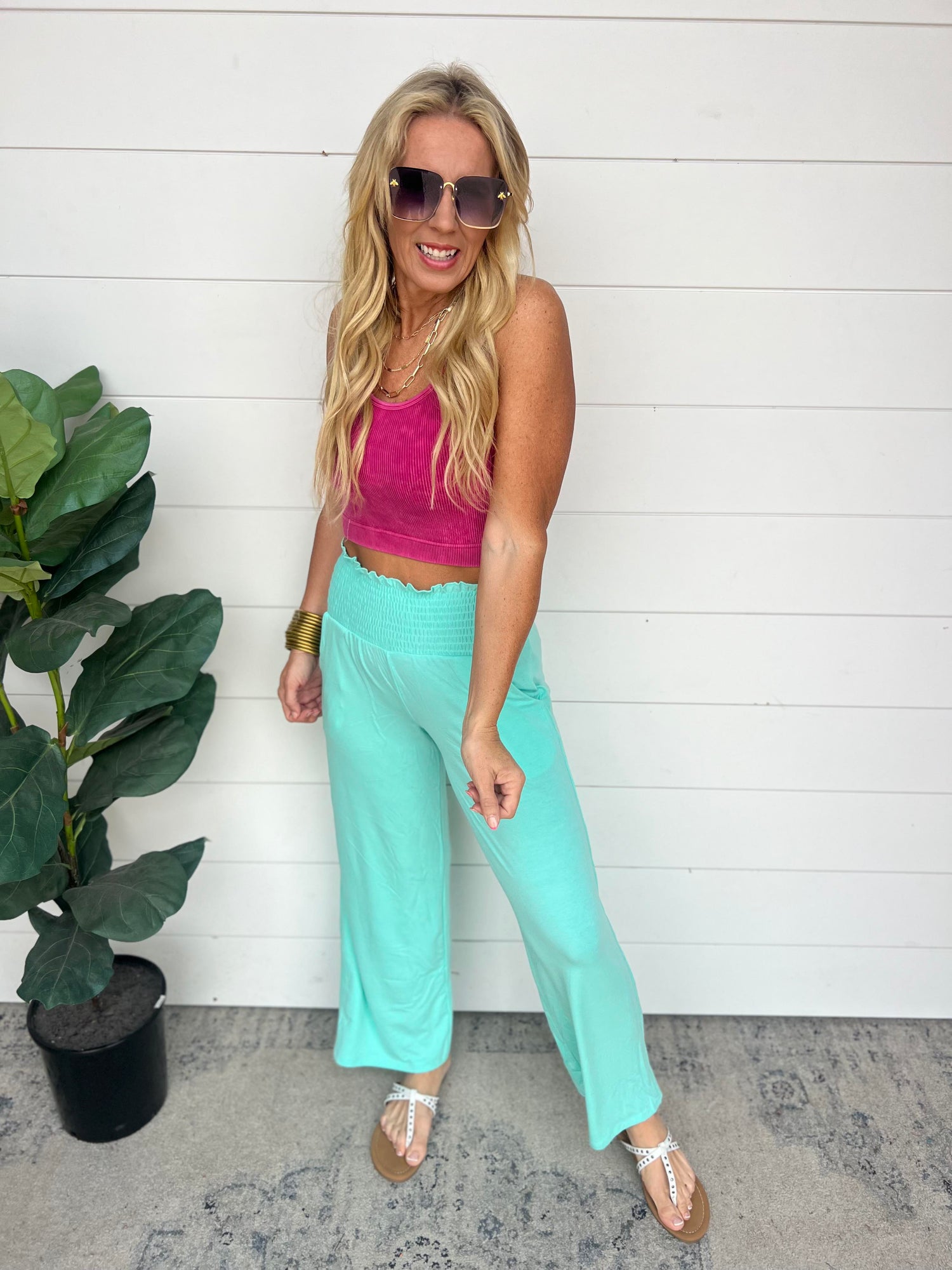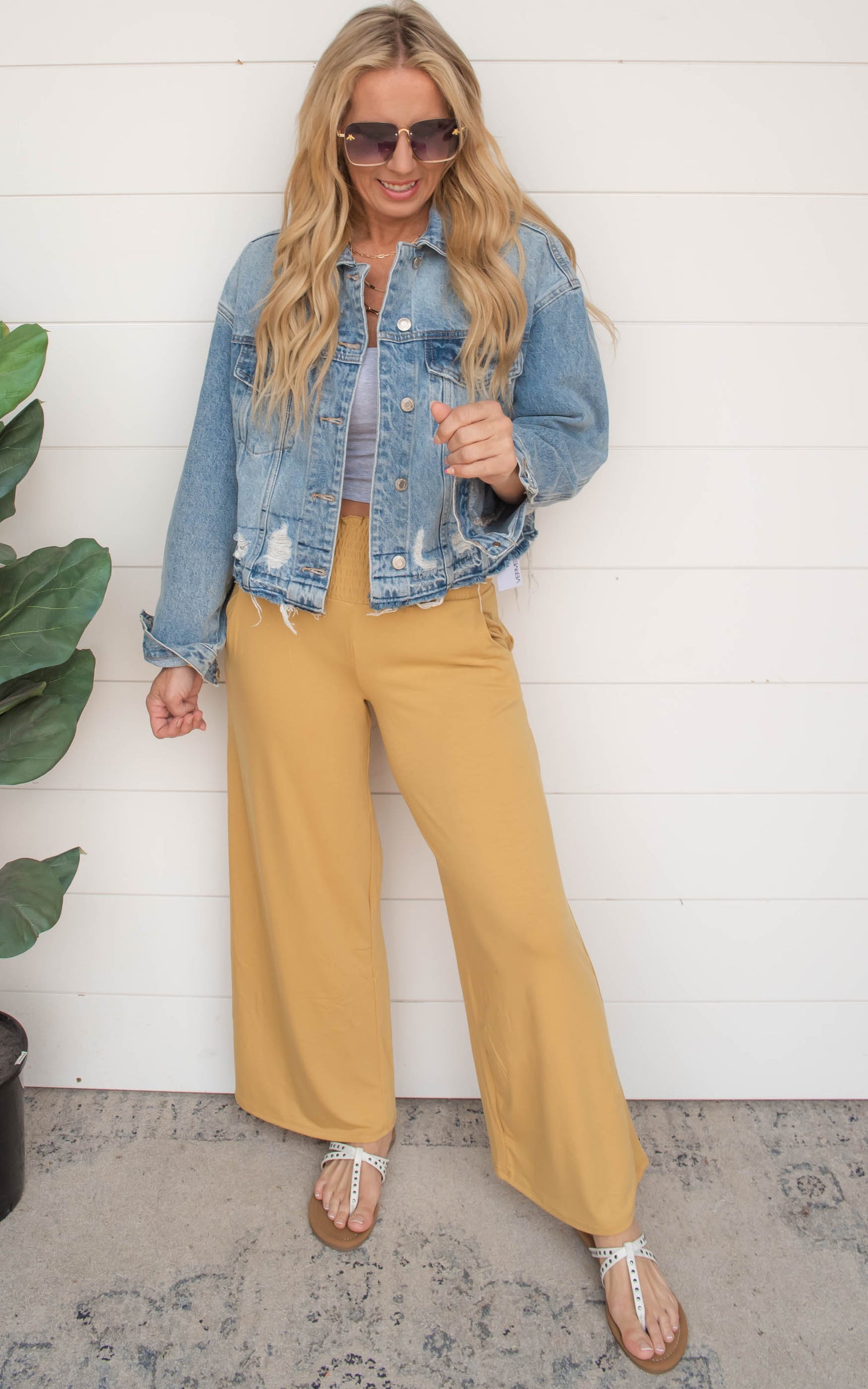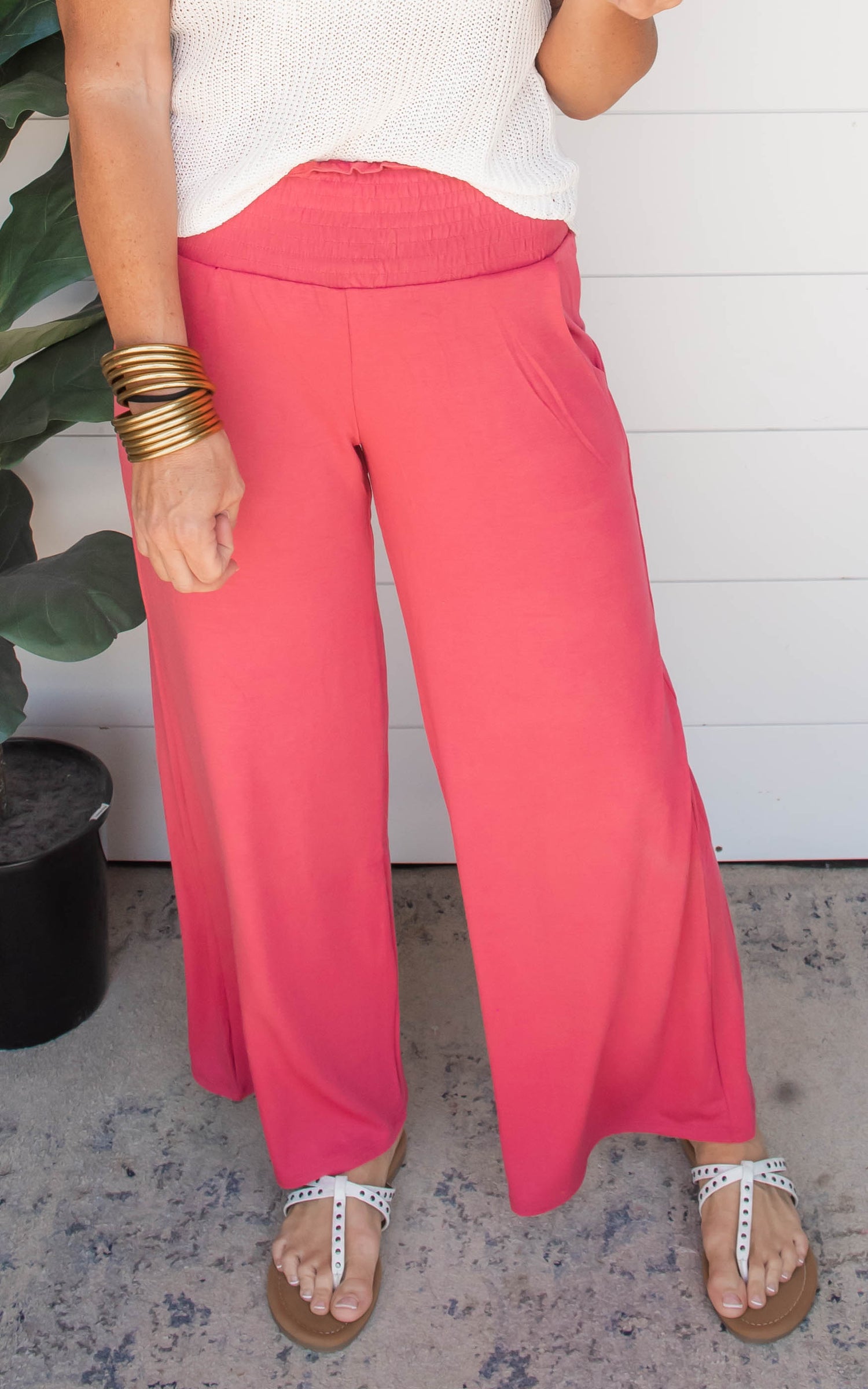 Get comfy in these Smocked Wide Leg Pants. Wonderful for lounging around or just a comfy Spring day styled with a graphic tee and cardigan. Complete this look with a pair of flip flops for casual outfits or wedges to style these wide leg pants up.