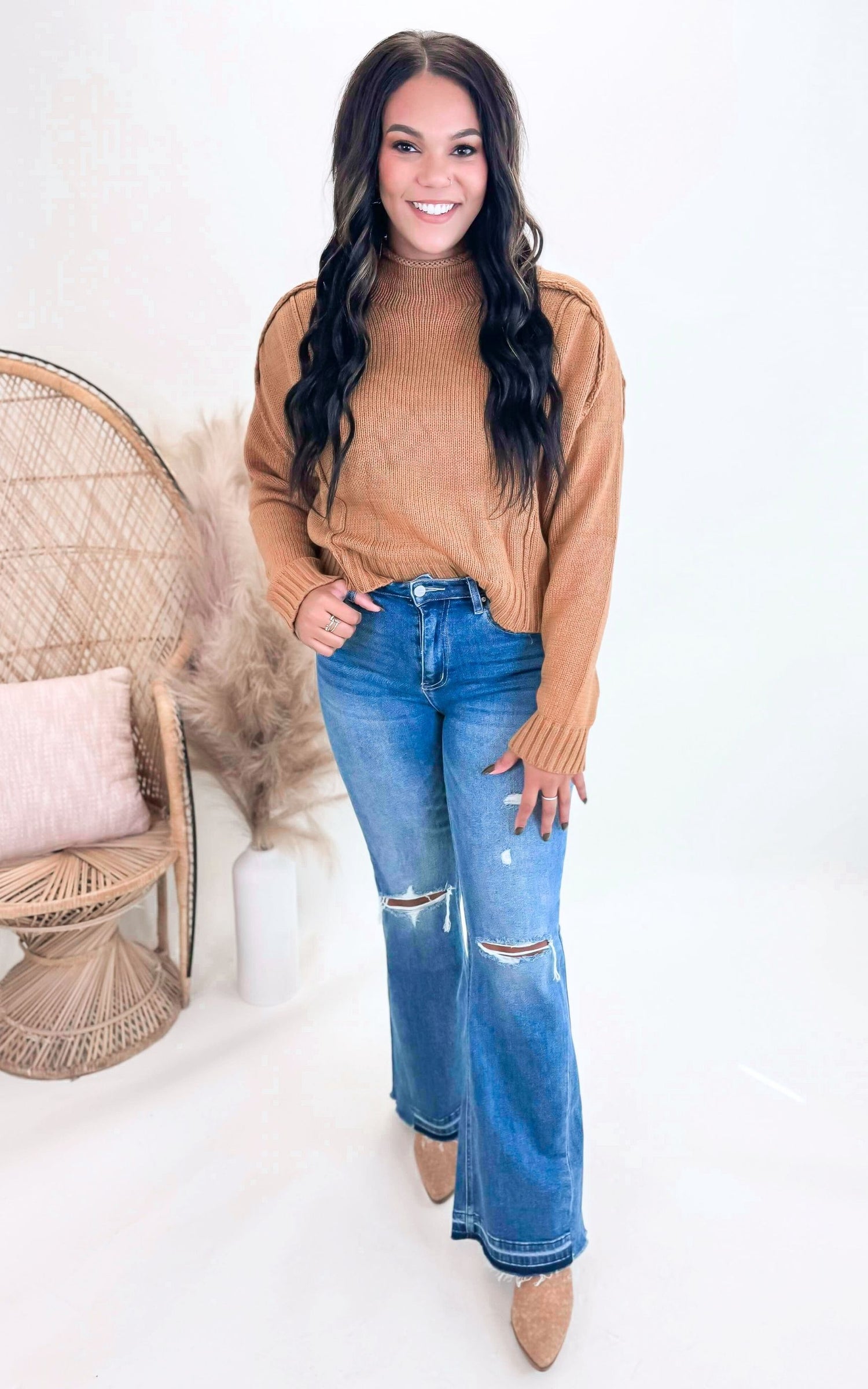 Solid knit oversized long-sleeve sweater with mock neck, reverse stitching detail, and ribbed detail by the cuffs and the bottom. regular size, standard, solid, knit, sweater, top, oversize, long sleeve, mock neck, reverse stitch, ribbed, comfortable, warm, simple, daily wear