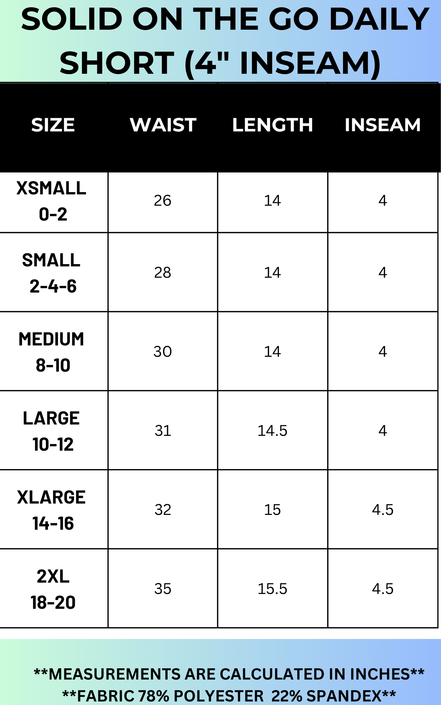 FABRIC: 78% POLYESTER 22% SPANDEX