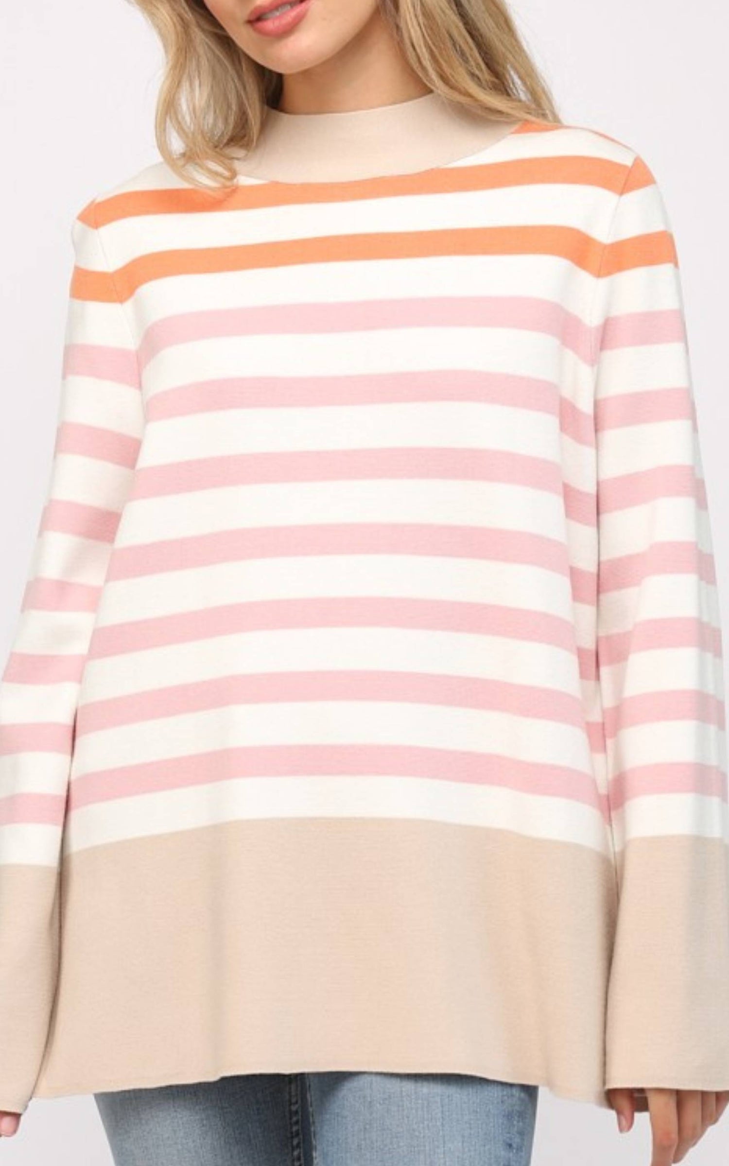Add a touch of sophistication to your wardrobe with our Stripe Mock Neck Bell Sleeve Pullover. This versatile piece features a mock neck and stylish bell sleeves, perfect for any occasion. Preorder now and elevate your fall style!