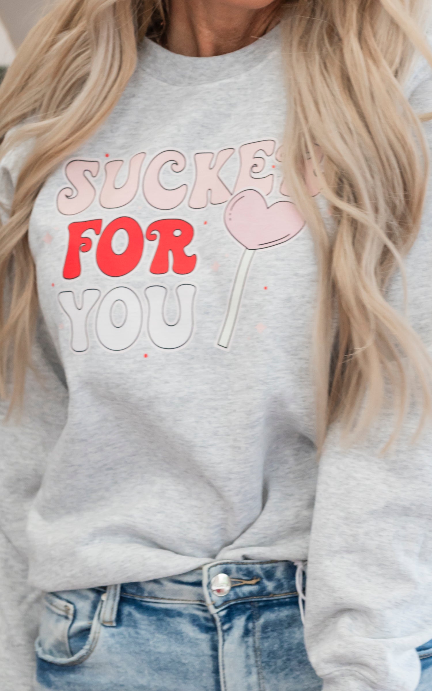 Celebrate Valentine's Day with our "Sucker for Your Crewneck Sweatshirt"! Stay cozy and stylish with this fun and playful sweatshirt. Perfect for showing love to your crew on the day of love. (Warning: may cause excessive hugging from your whole crew!)