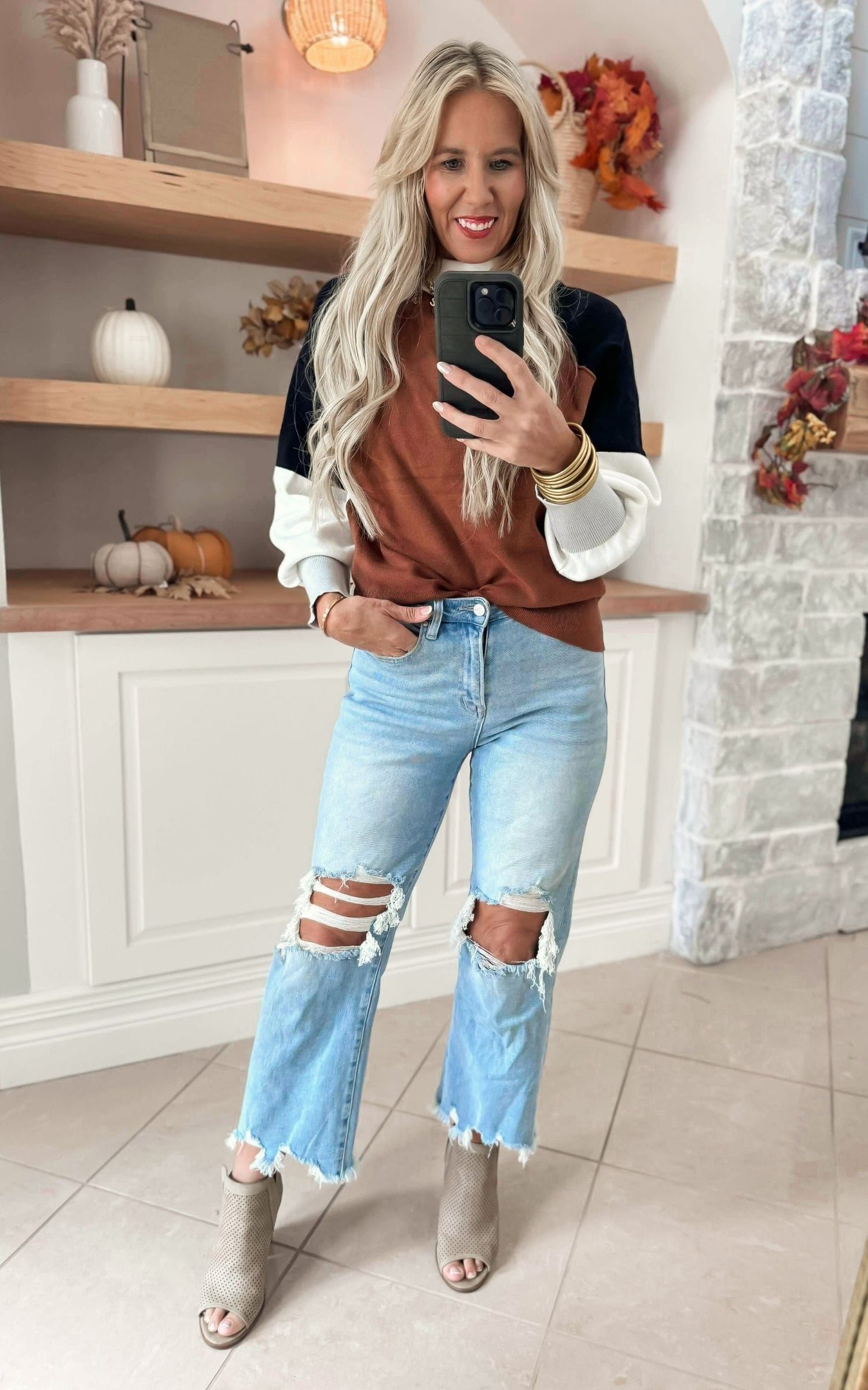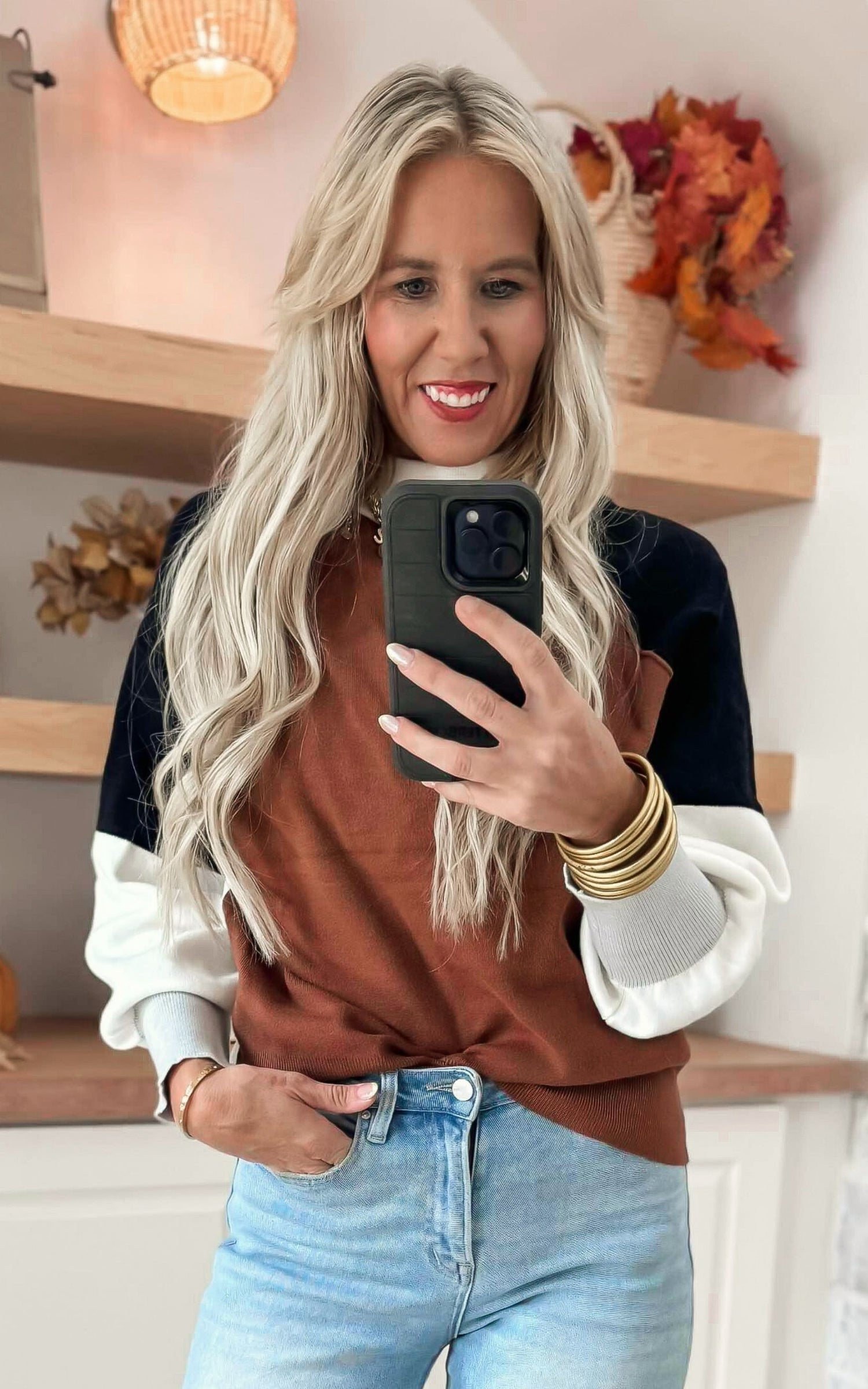 Effortlessly chic and cozy, this Terracotta Colorblock Mock Neck Sweater Top adds a pop of color to your wardrobe. The high mock neck and soft knit fabric provide warmth and comfort, while the bold colorblock design makes a statement. Perfect for transitioning from day to night, embrace the bold, modern look with this must-have sweater top.